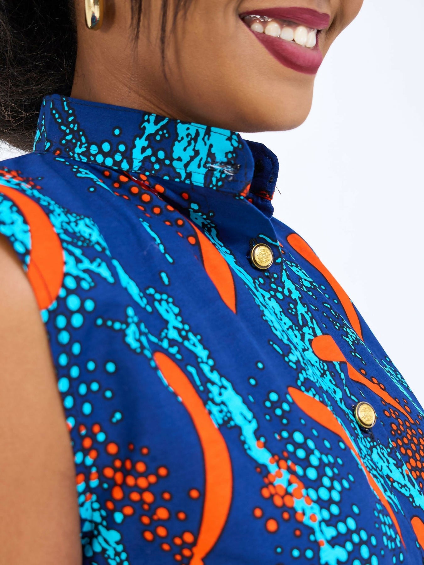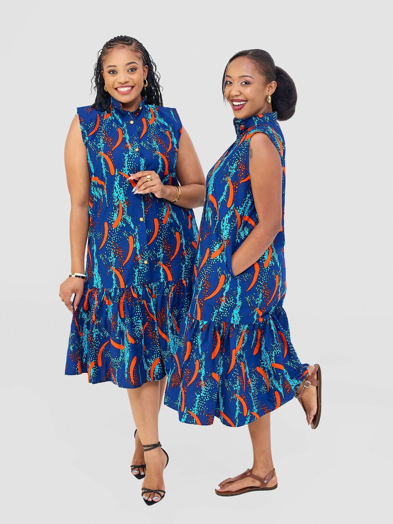 This vibrant "African Print Ruffle Hem Dress" offers a stylish and comfortable option. It features a rich royal blue base adorned with a dynamic pattern of fiery orange and bright teal abstract shapes, reminiscent of brushstrokes or organic forms. The dress has a high, stand-up collar with button detailing and a sleeveless design, providing a chic and contemporary look. A playful ruffle hem adds a touch of feminine flair and movement to the silhouette, making it suitable for both casual and semi-formal occasions where comfort and a pop of color are desires.