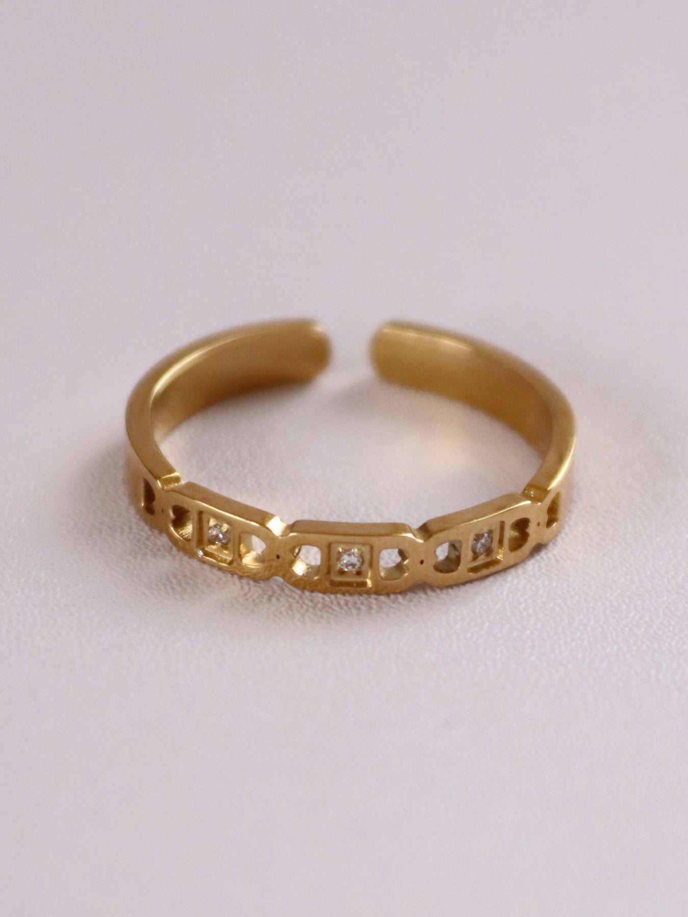 This elegant ring features a chain-link motif that gives it a unique edge, beautifully accented with tiny cubic zirconia stones. Cubic zirconia, a lab-created diamond imitation, is designed to add a diamond-like sparkle at a fraction of the cost of real diamonds. This dainty, minimalist piece can be worn on its own or stacked with your favorite rings