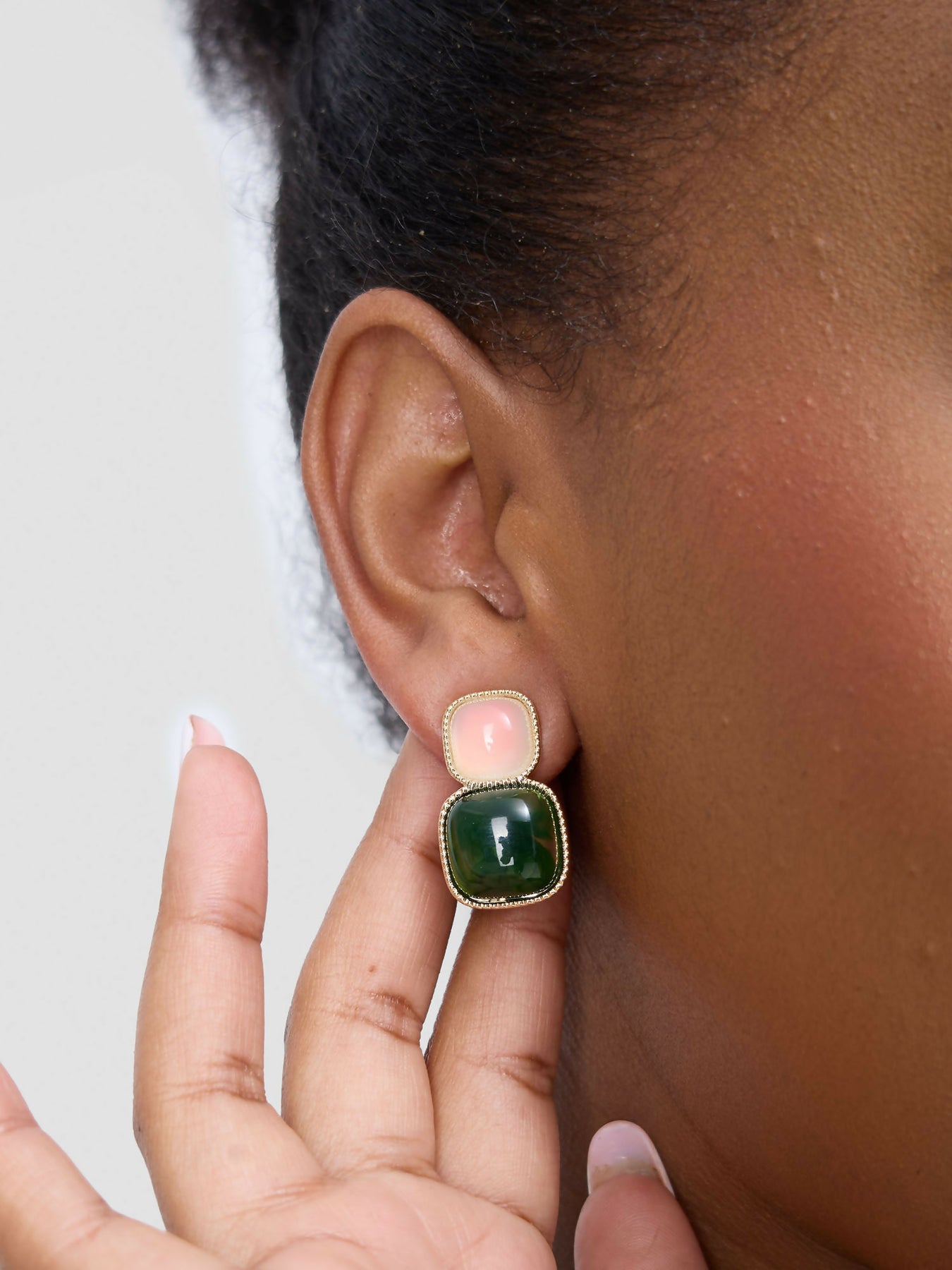 This meticulously crafted earrings exhibit a sophisticated two-tiered architecture featuring precisely cut square stones. The upper tier presents a delicate opaque pink stone with optimal light diffusion properties, while the lower tier showcases a rich, opaque dark green stone with exceptional depth.