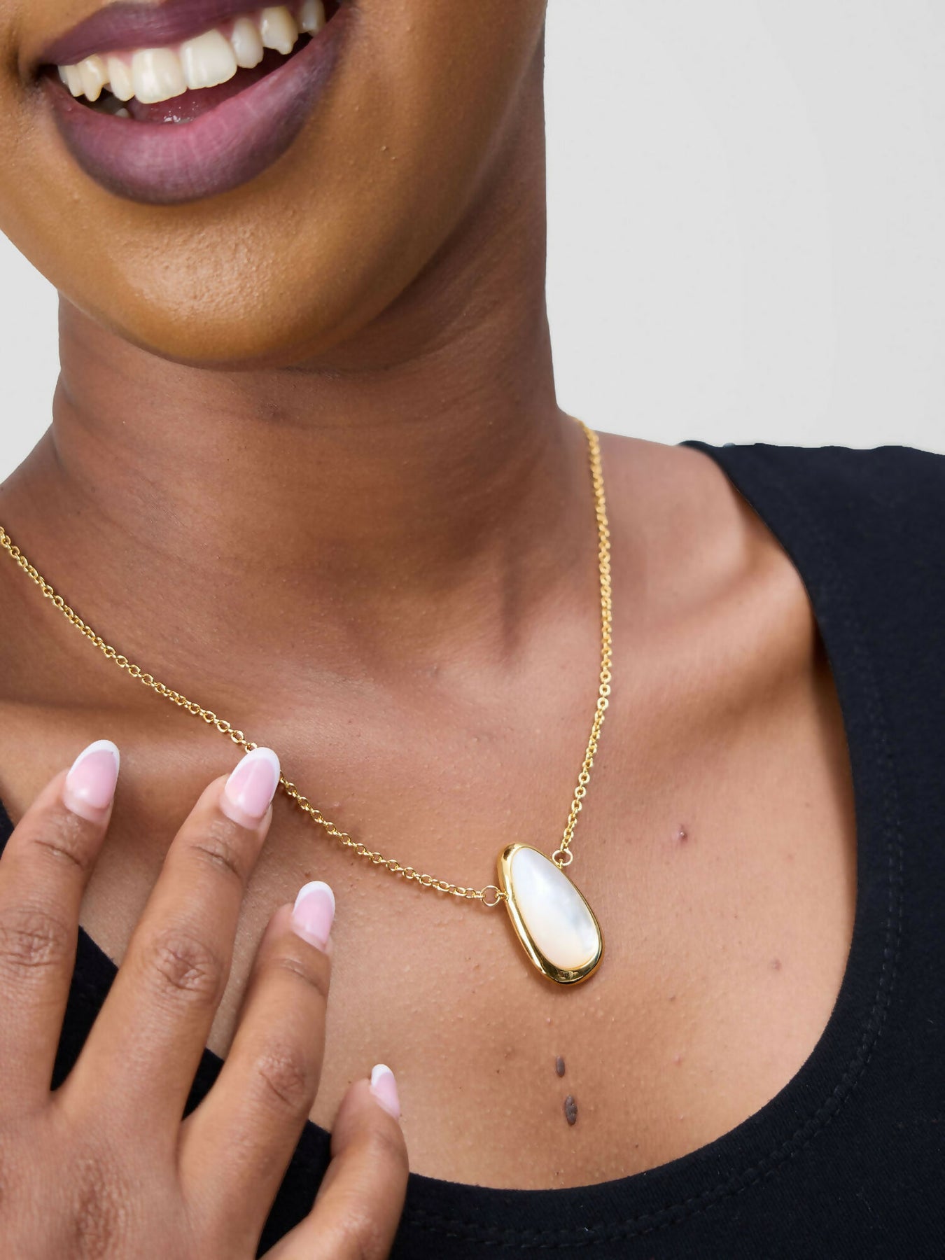 This delicate gold-toned necklace features a slender chain adorned with a single, elegant white oval pendant, creating a refined and versatile accessory.