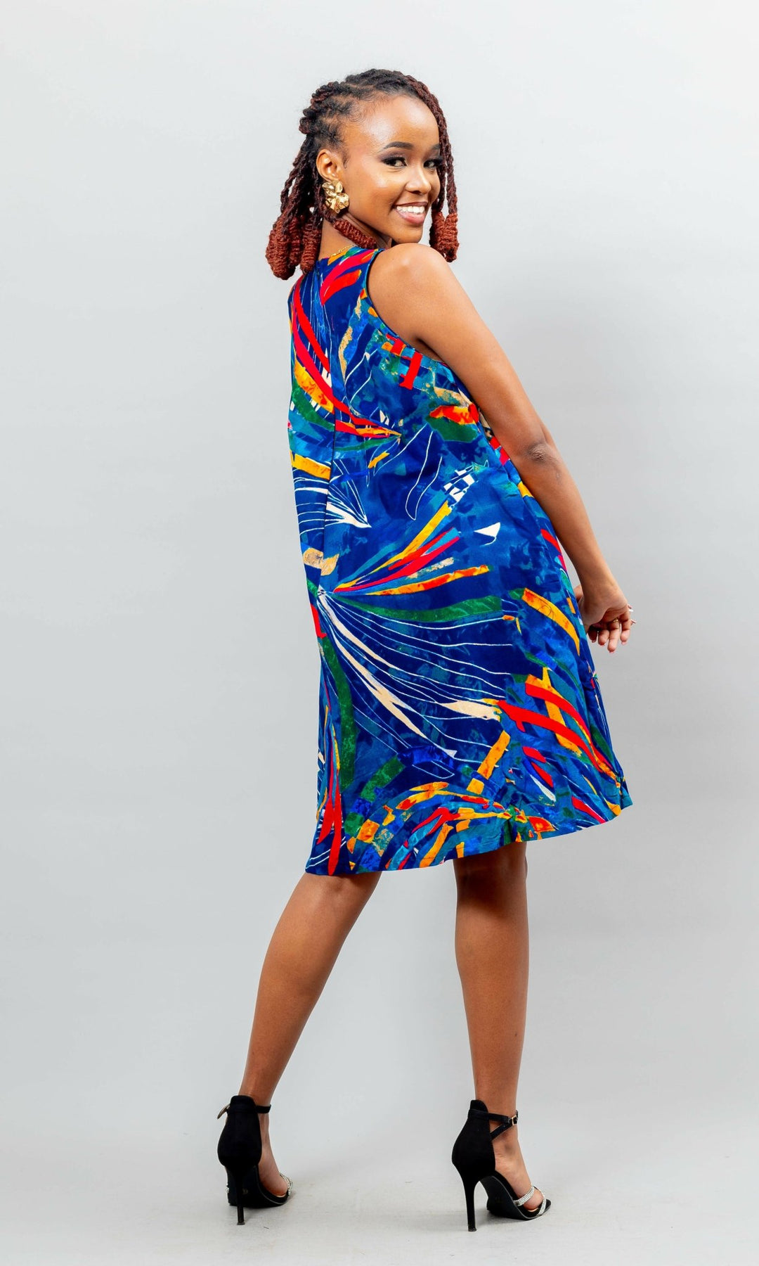 Breeze through sunny days in style with this vibrant sleeveless African print shift dress. Designed with a relaxed fit and lightweight feel, this dress is perfect for the beach, casual outings, or everyday wear.