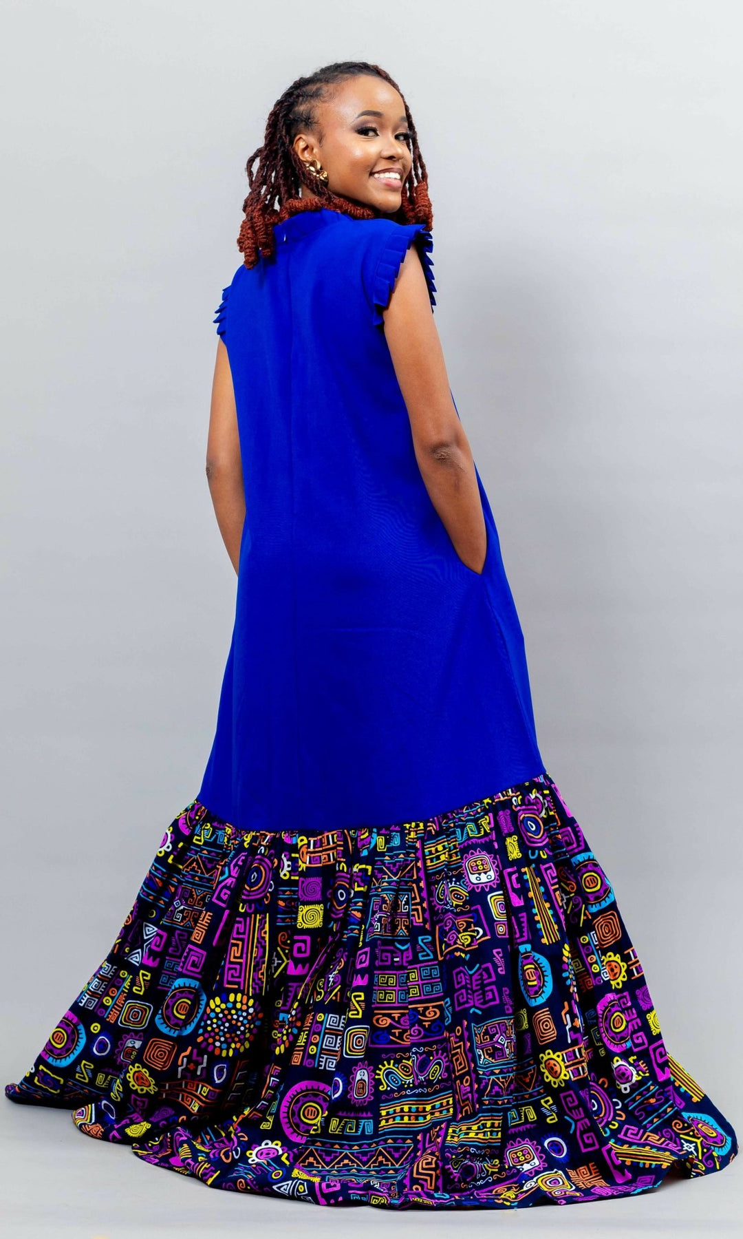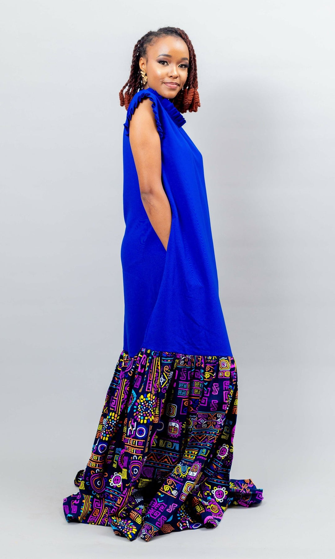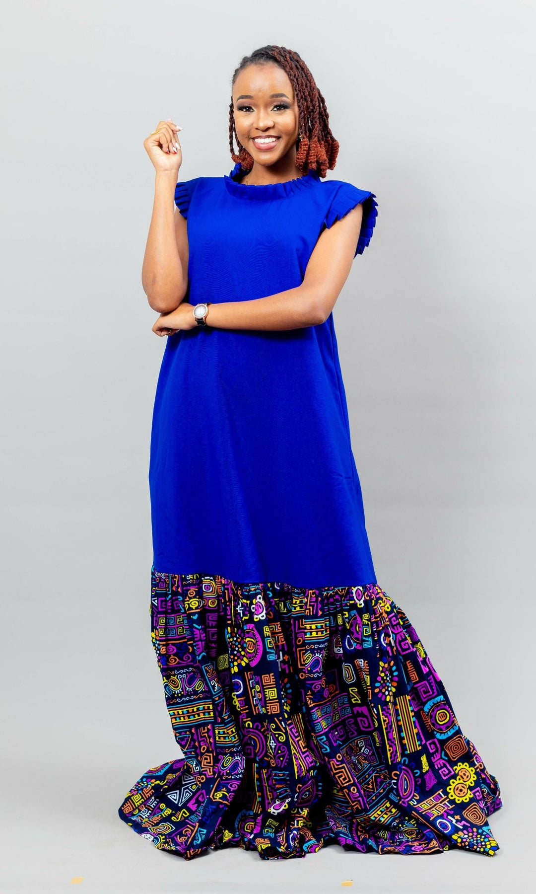 The structured high neckline with subtle ruffle detailing adds a refined touch, while the flowing A-line silhouette ensures a flattering, comfortable fit for all body types. The contrasting multicolored Ankara patchwork at the hem brings life and movement to the look.
