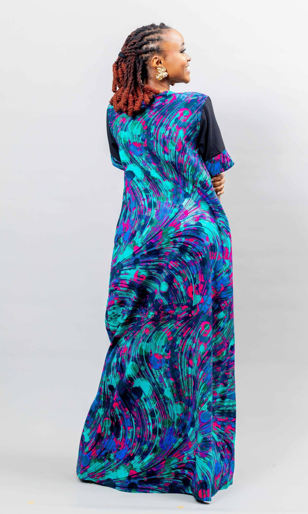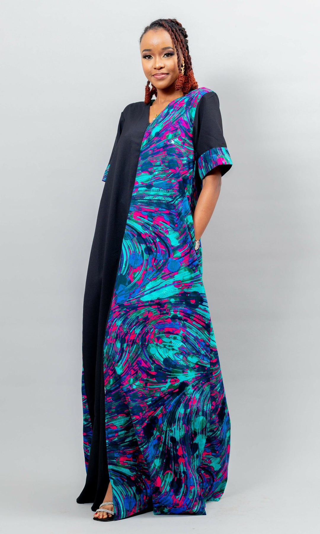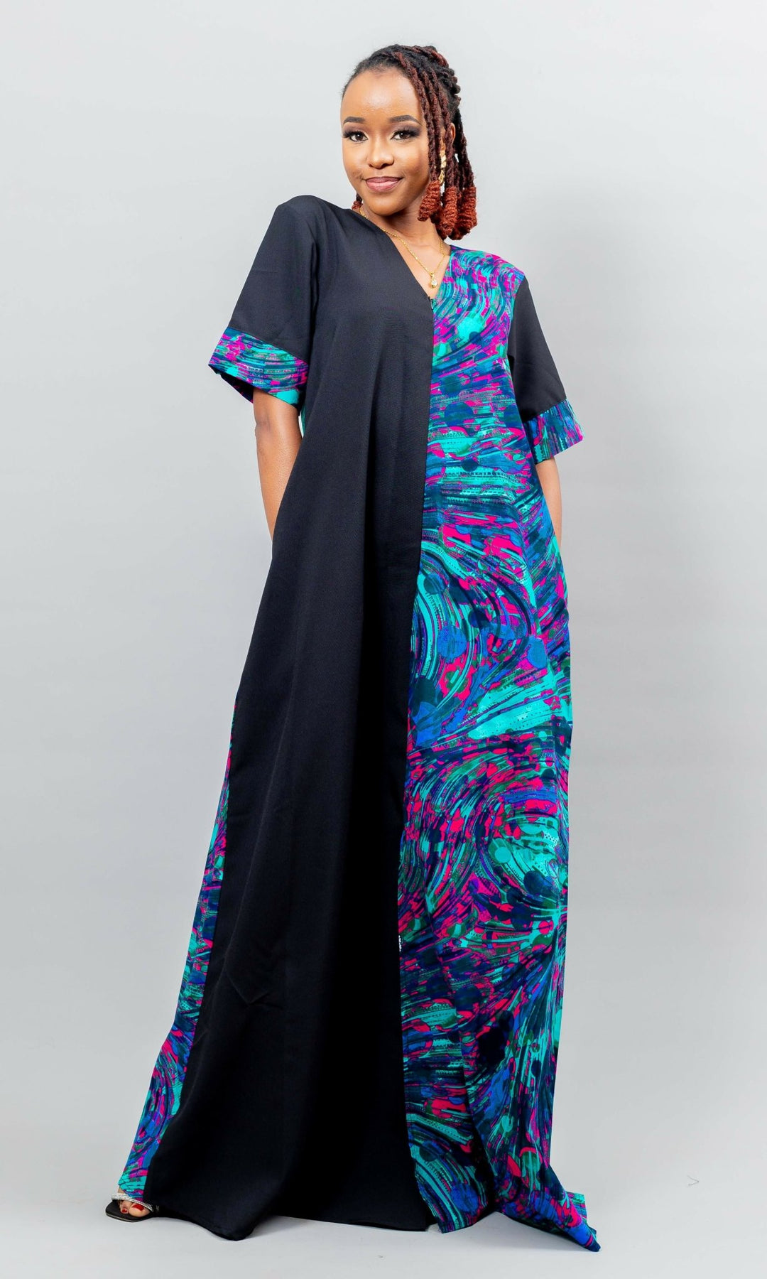 Turn heads in this stunning two-toned maxi dress that combines sleek black polyester with vibrant green African print cotton fabric. Perfect for special occasions or an elevated everyday look, this dress seamlessly blends style, functionality, and cultural charm.