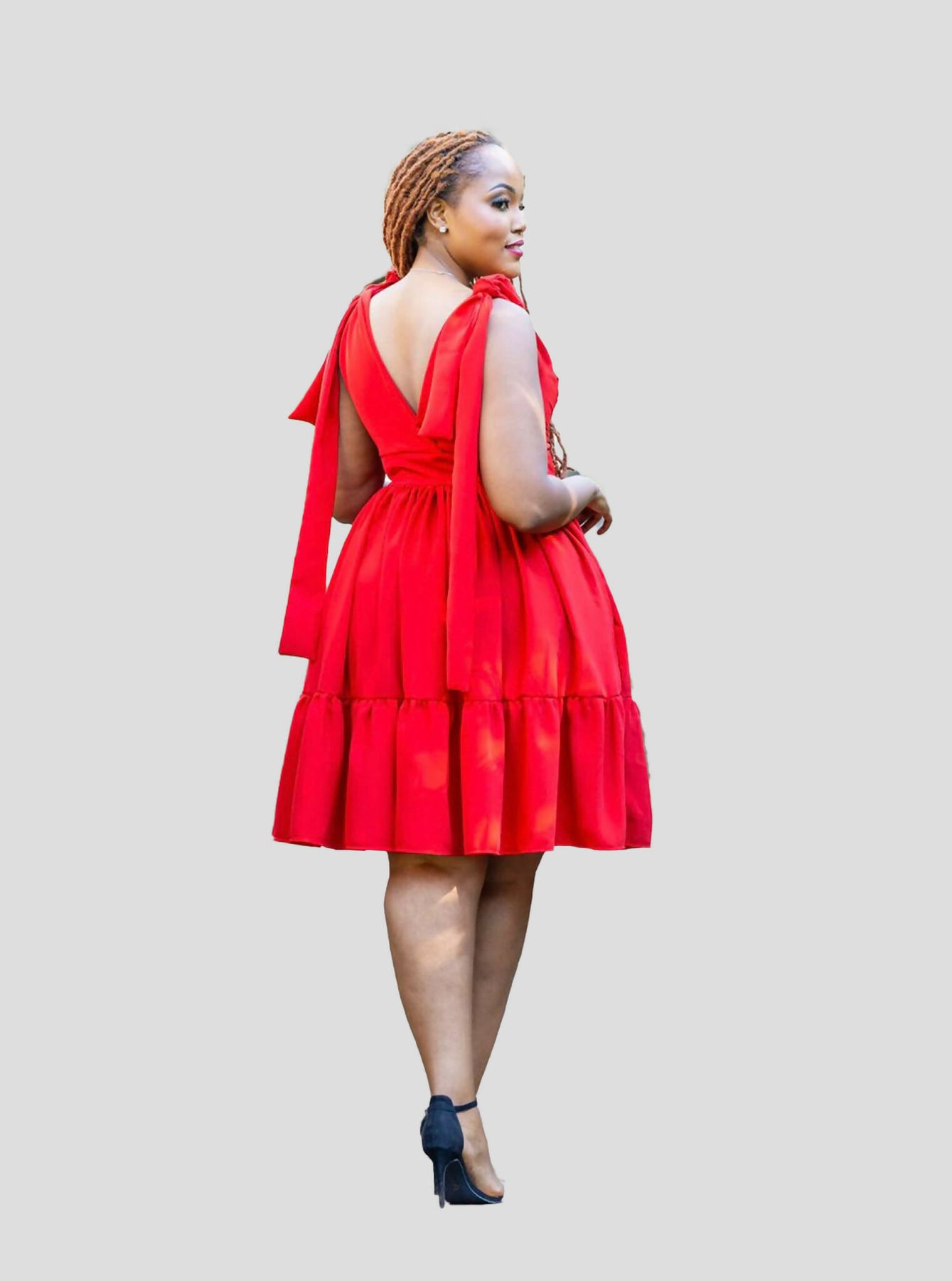 Make a statement in the Nyota short skater dress, designed to turn heads with its rich color and flattering silhouette. Featuring a deep V-neckline, cinched waist, and flowy ruffled hem, this dress effortlessly combines elegance with comfort. The feminine bow-tie shoulder straps add a playful and adjustable detail, making this piece as functional as it is beautiful.