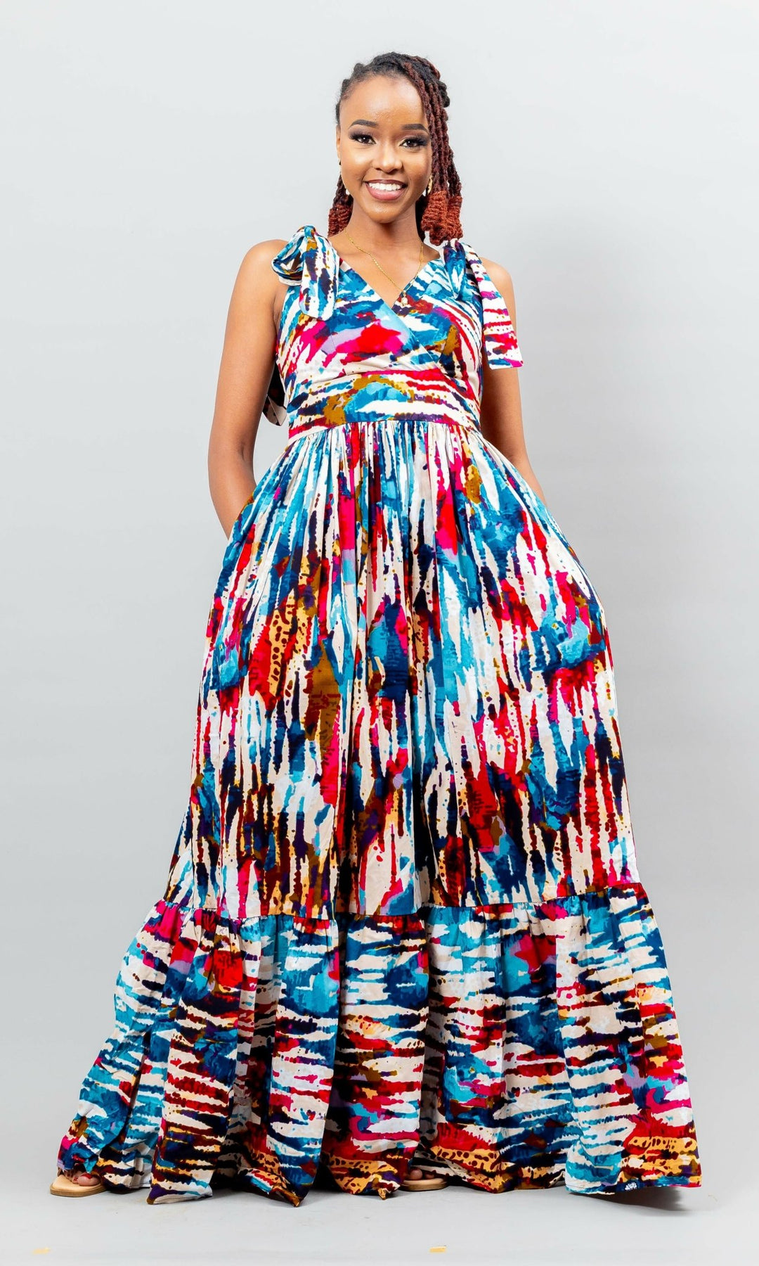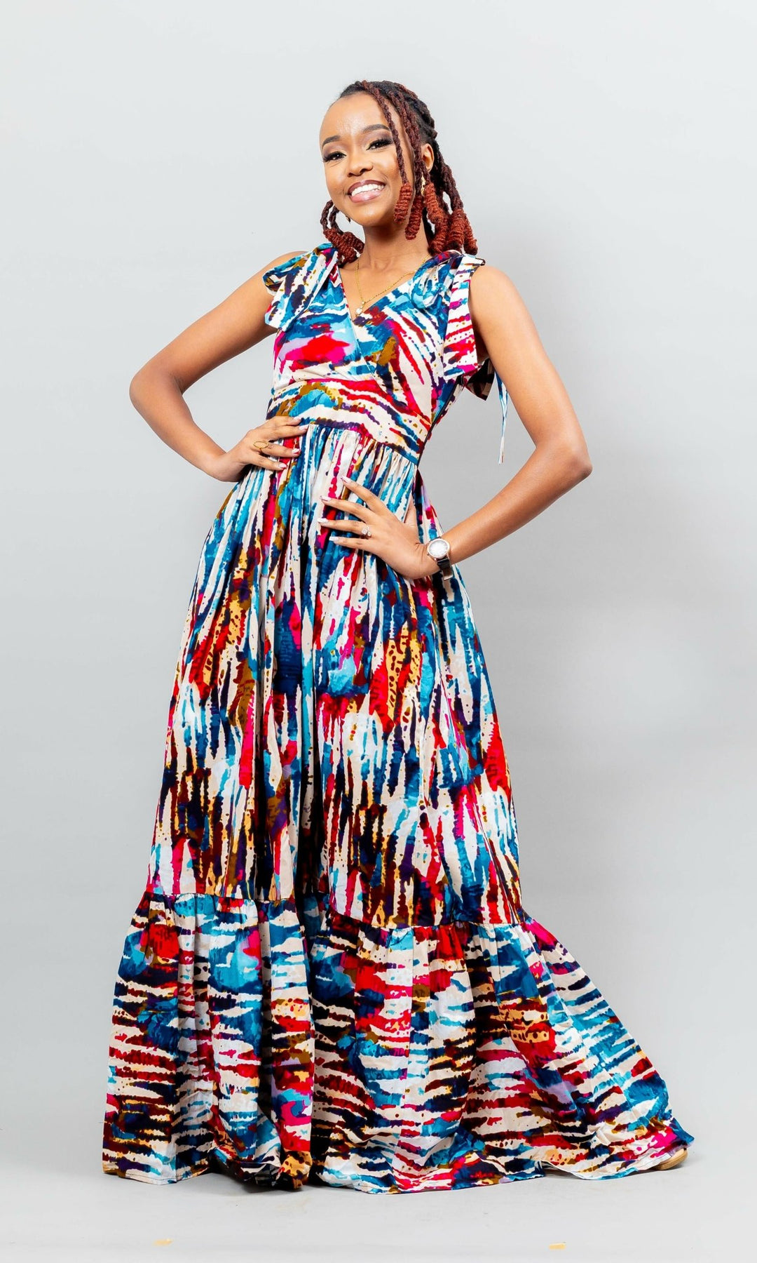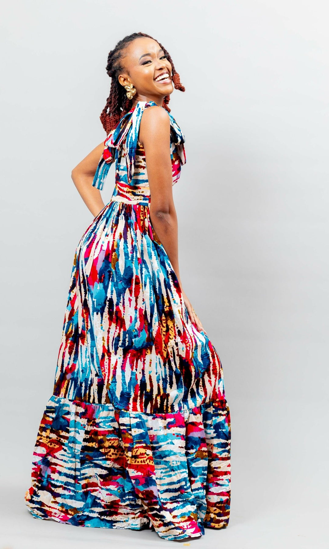 Make a statement in this stunning Subira maxi dress, designed to turn heads with its rich color and flattering silhouette. Featuring a deep V-neckline, cinched waist, and flowy ruffled hem, this dress effortlessly combines elegance with comfort. The feminine bow-tie shoulder straps add a playful and adjustable detail, making this piece as functional as it is beautiful.