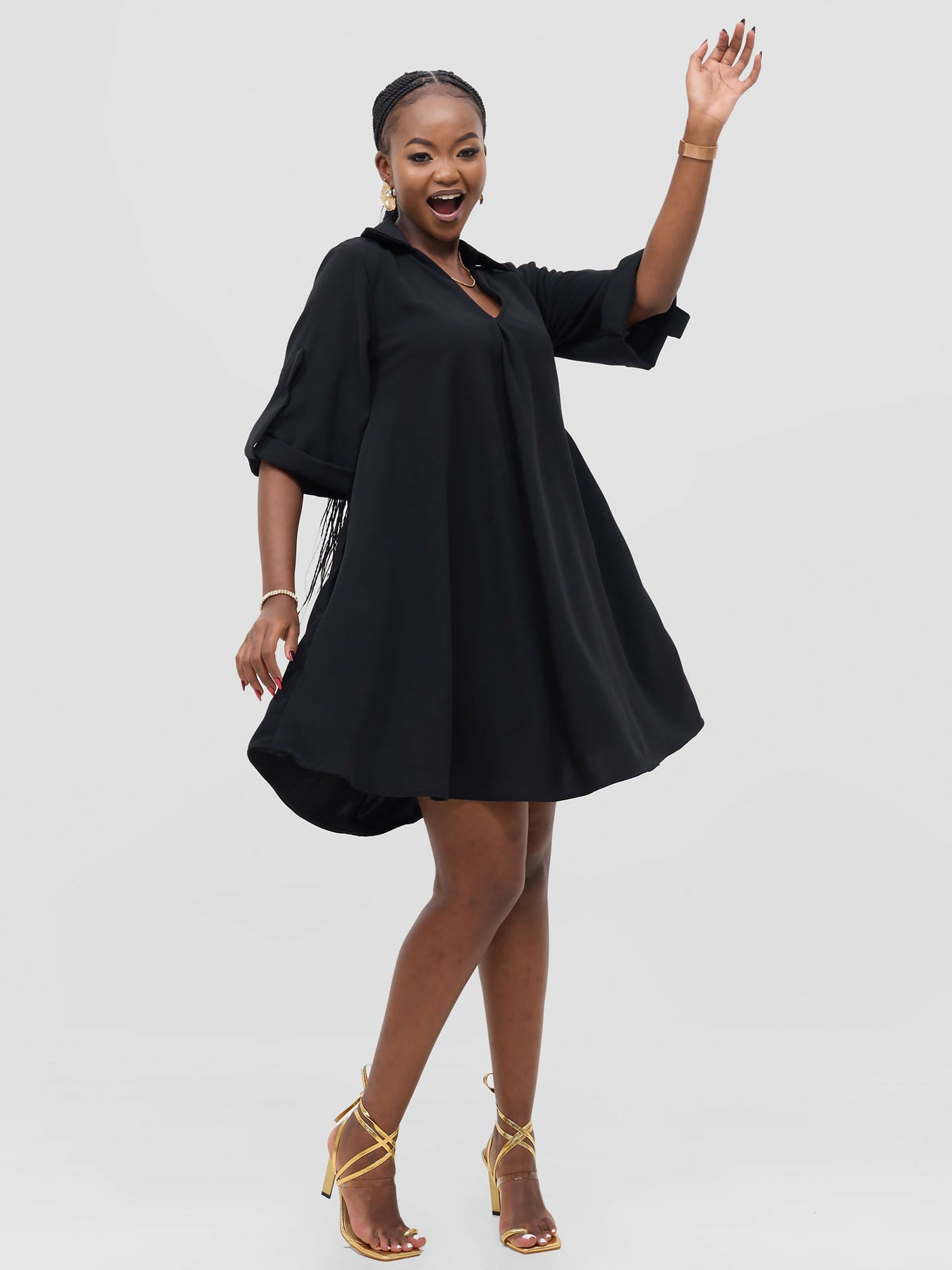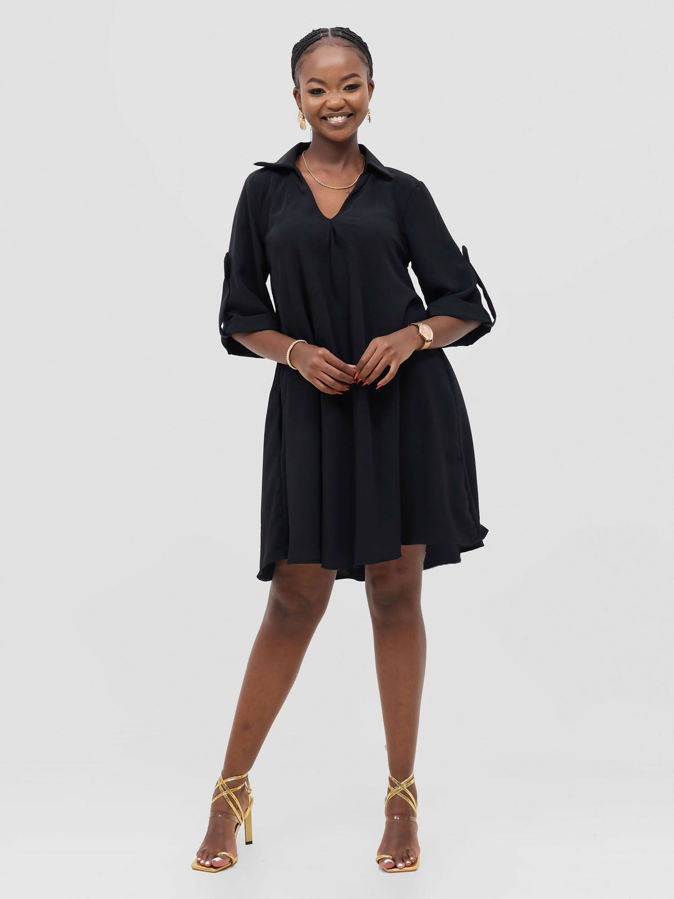 - The Benin shift dress features a flattering V-neckline and neck collar.