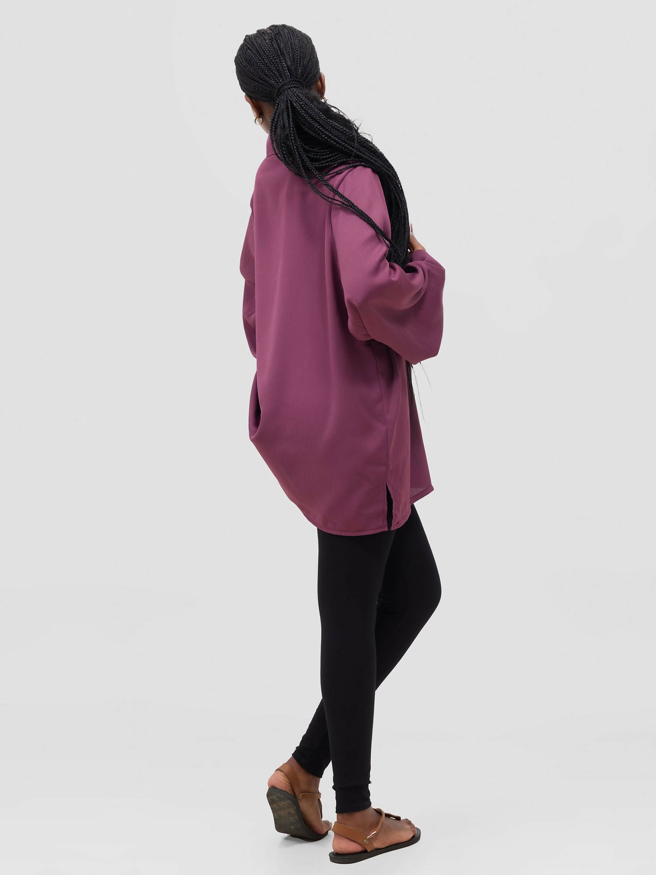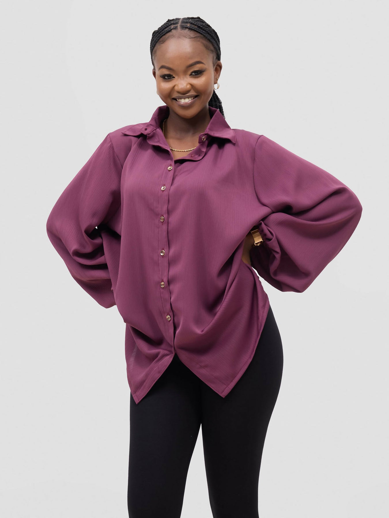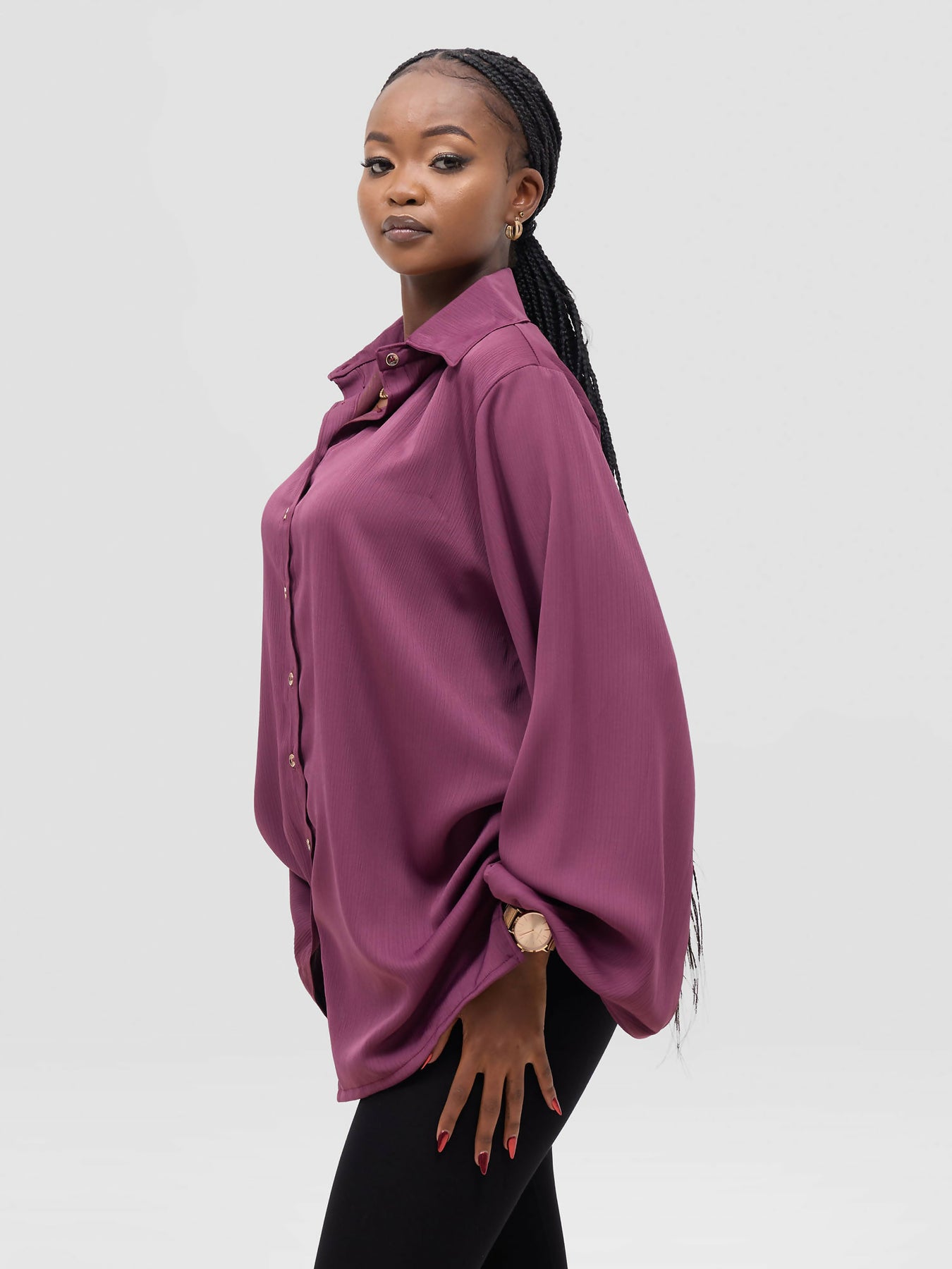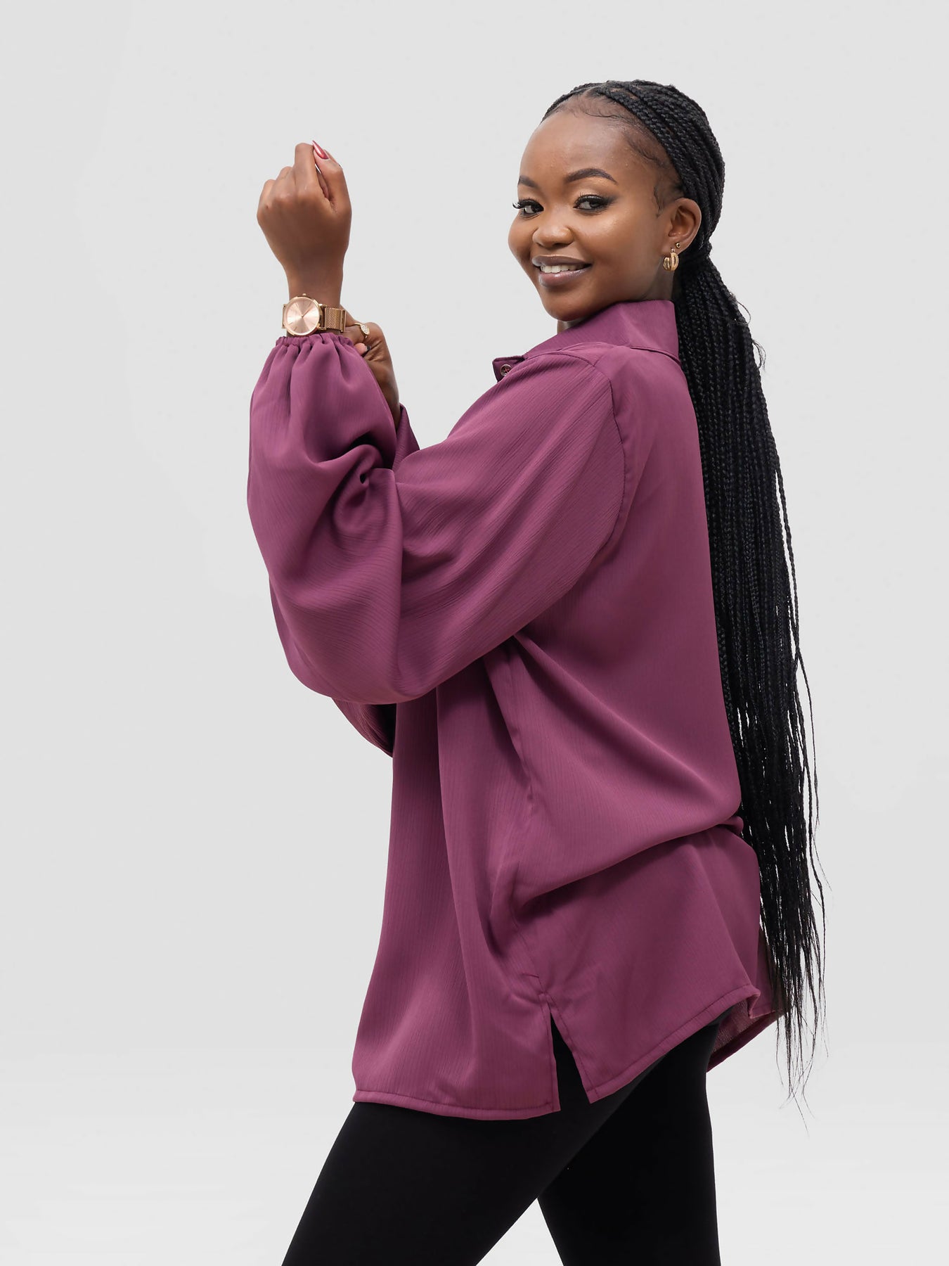 Product Features - The Rose Purple shirt features a button-down design for effortless styling and sophistication. - The shirt features long puffy sleeves with an elastic band at the wrist. - The shirt is made from lightweight, soft, breathable polysilk material for all-day comfort. - The model is wearing a UK 10.