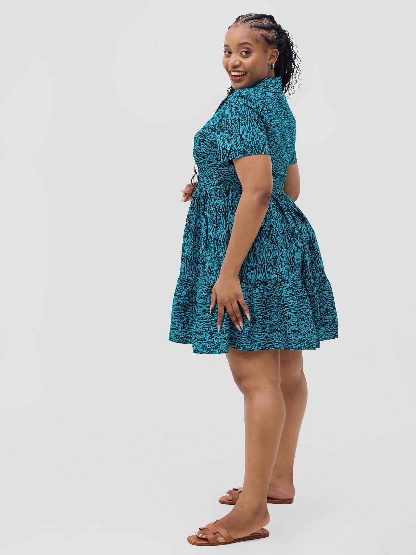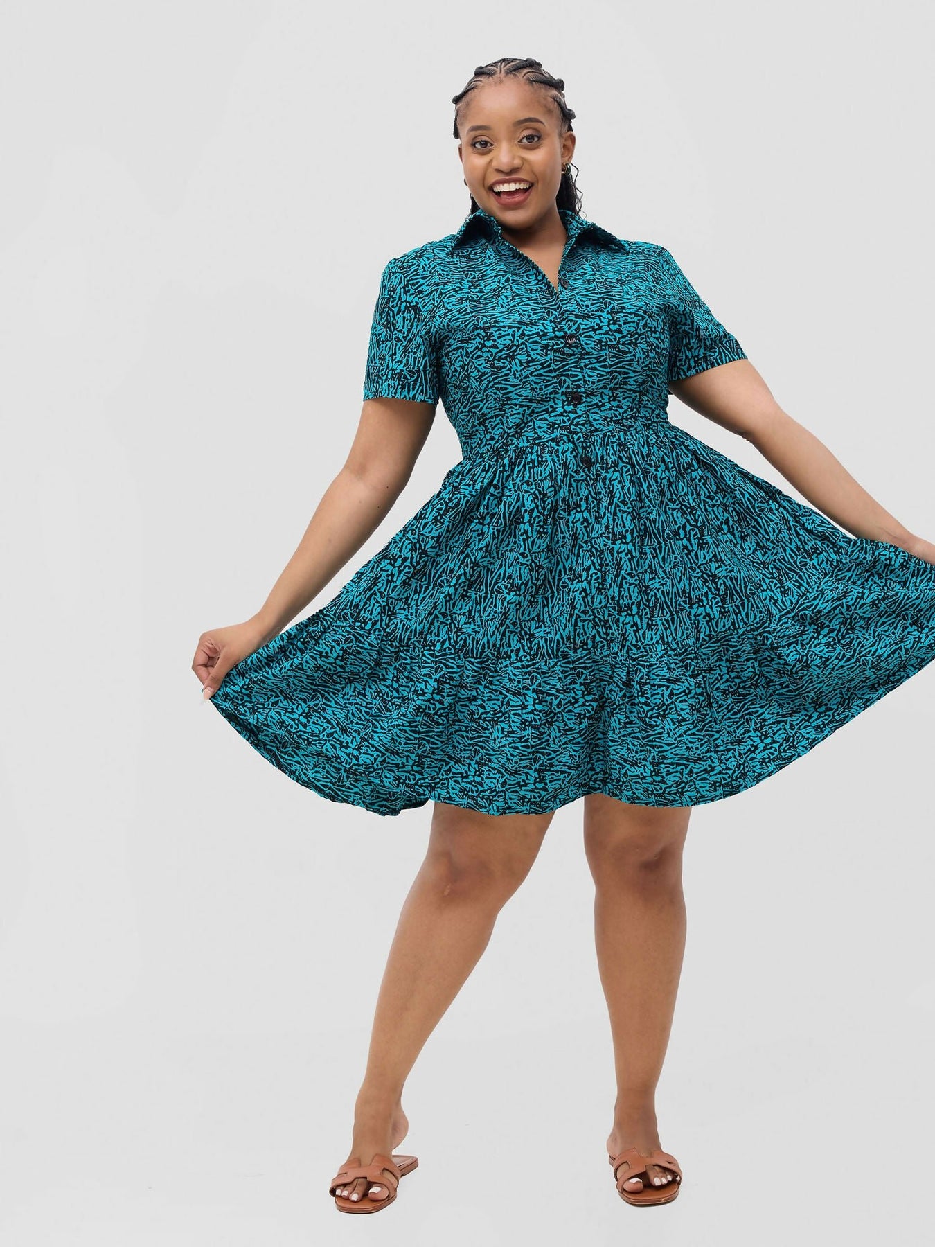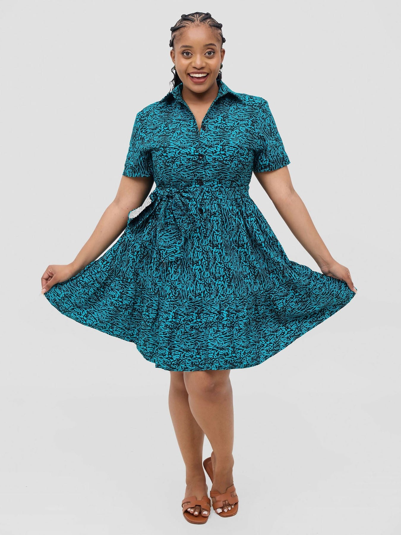 Turn heads with this stunning African print skater dress, a perfect blend of elegance and playful charm. Featuring a flattering fitted bodice and a flowy skater-style skirt, this dress is designed to celebrate your figure while keeping you comfortable. Product Features - The Shere Skater dress is made from cotton African print fabric. - The dress features a fitted bodice and flowy bottom accentuating your silhouette for a sleek, polished look. - The dress features short sleeves; perfect for warm weather and easy layering. - The Shere dress features buttons running from top to bottom at the front, adding a classic and functional touch. - The dress features a detachable Belt that cinches the waist for added definition. - The dress is 37 inches long. The model is wearing a UK 14. She is 168 cm tall.