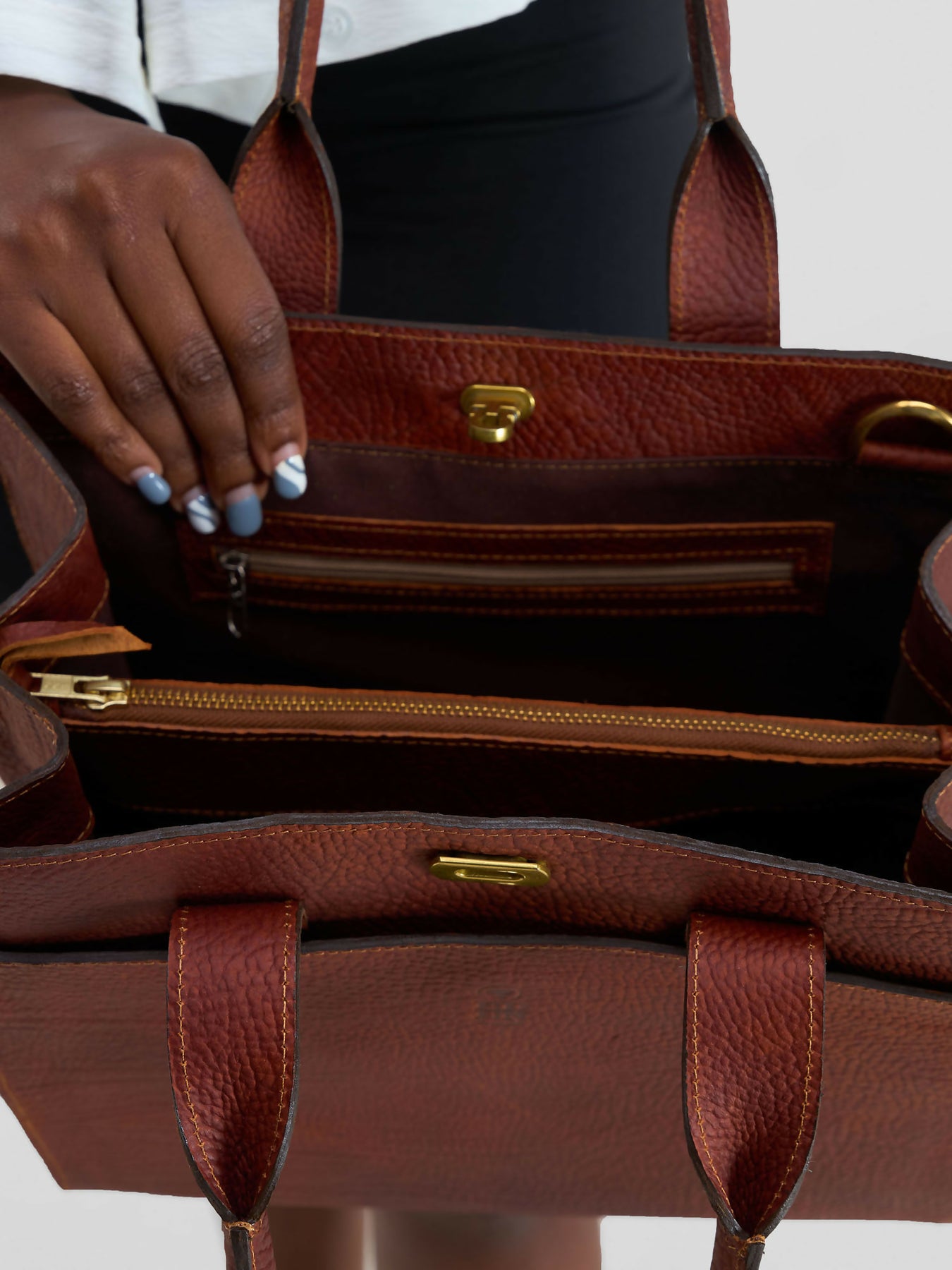 - Zippers: Brass zippers on both the main compartment and side pockets for secure closure.