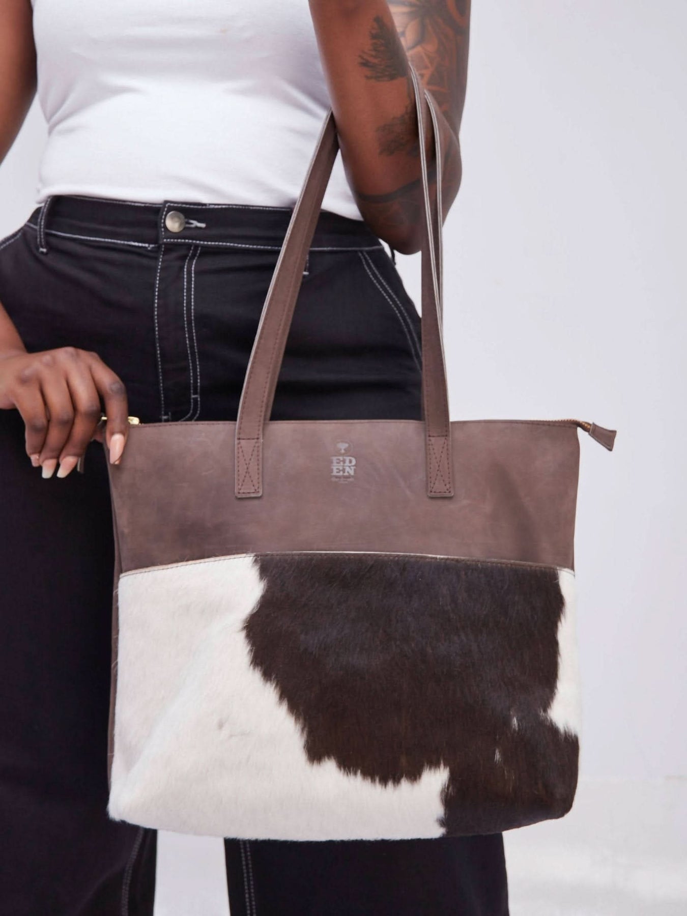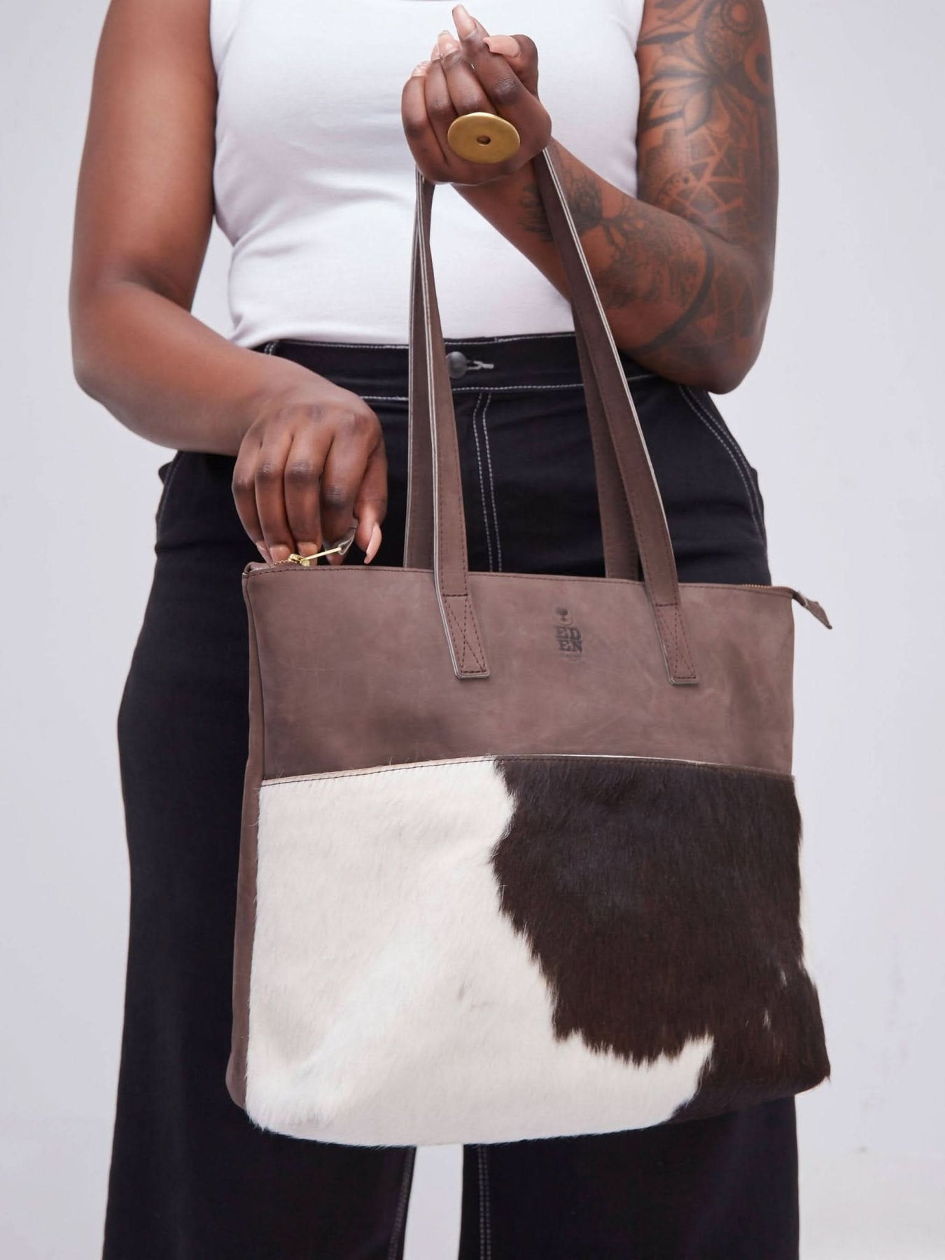 Eden Leather Nanda Tote Bag Hair on - Dark brown - Shopzetu
