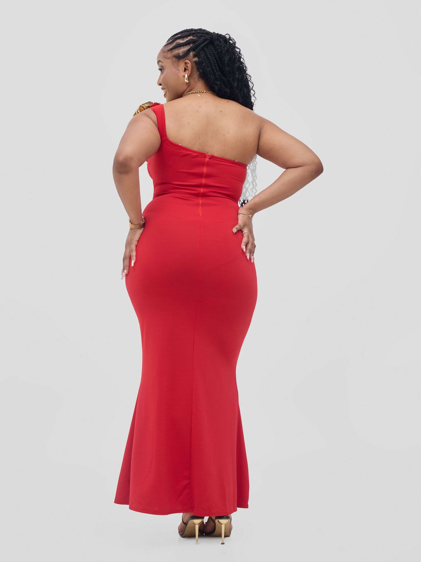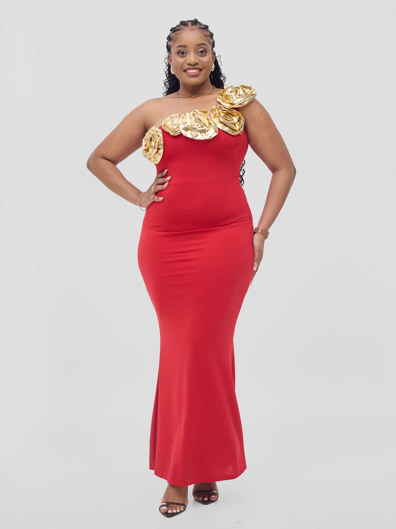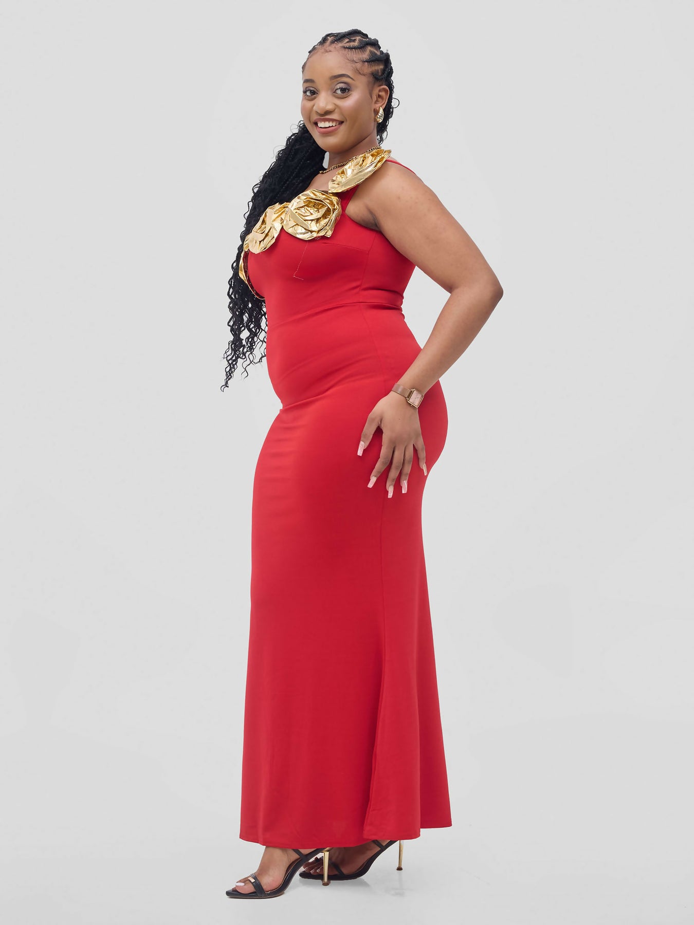Features: Exquisite Long Dinner Dress, no slit and beautiful gold flowers for that extra detail.