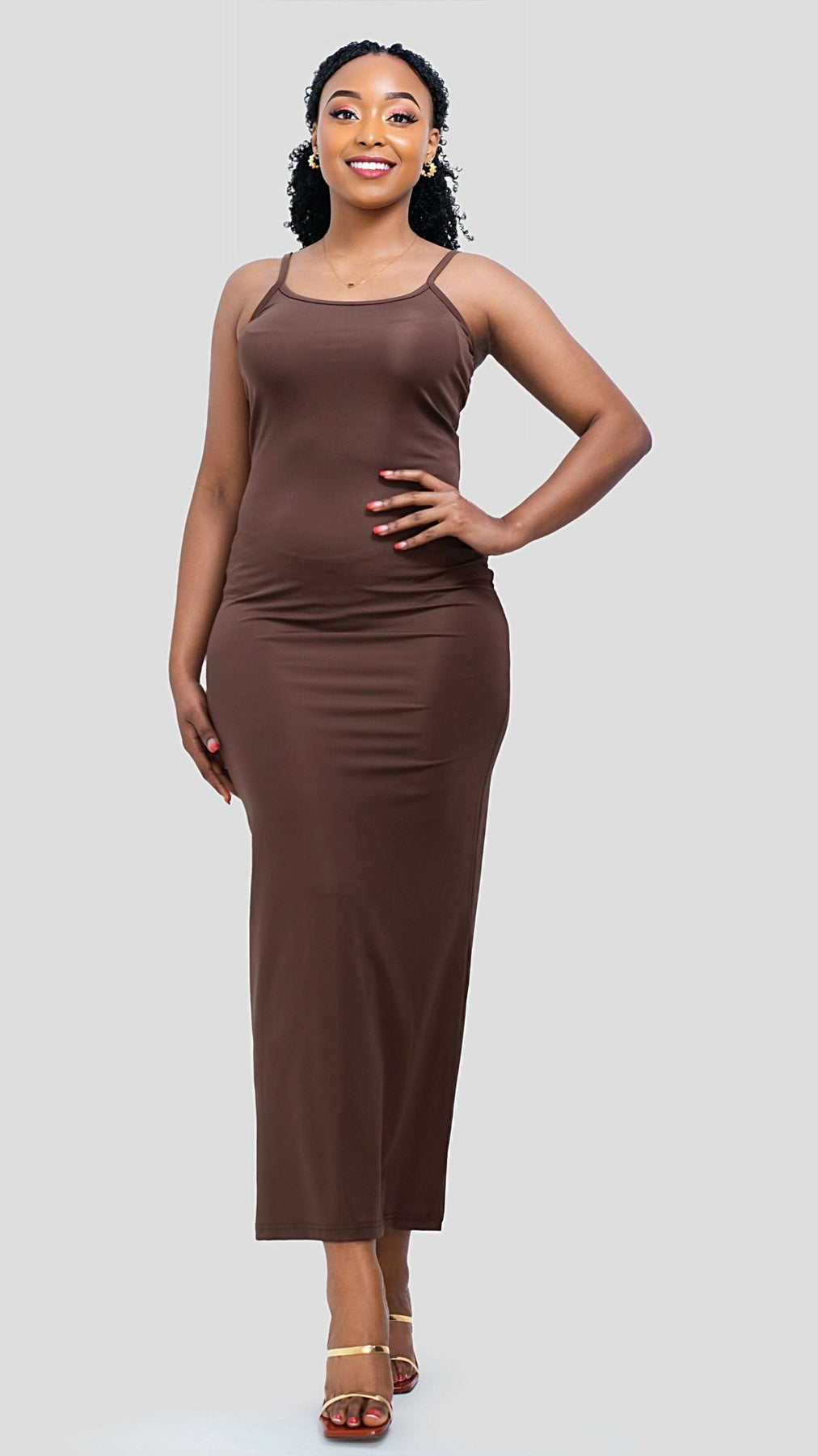 Turn heads effortlessly with our Choco Luxe Bodycon Maxi Dress. Crafted for the modern woman who loves elegance with ease, this figure-hugging silhouette is designed to flatter your curves in all the right places. Featuring soft, stretch-knit fabric, dainty spaghetti straps, and a smooth finish, this minimalist yet striking brown dress transitions seamlessly from day to night.