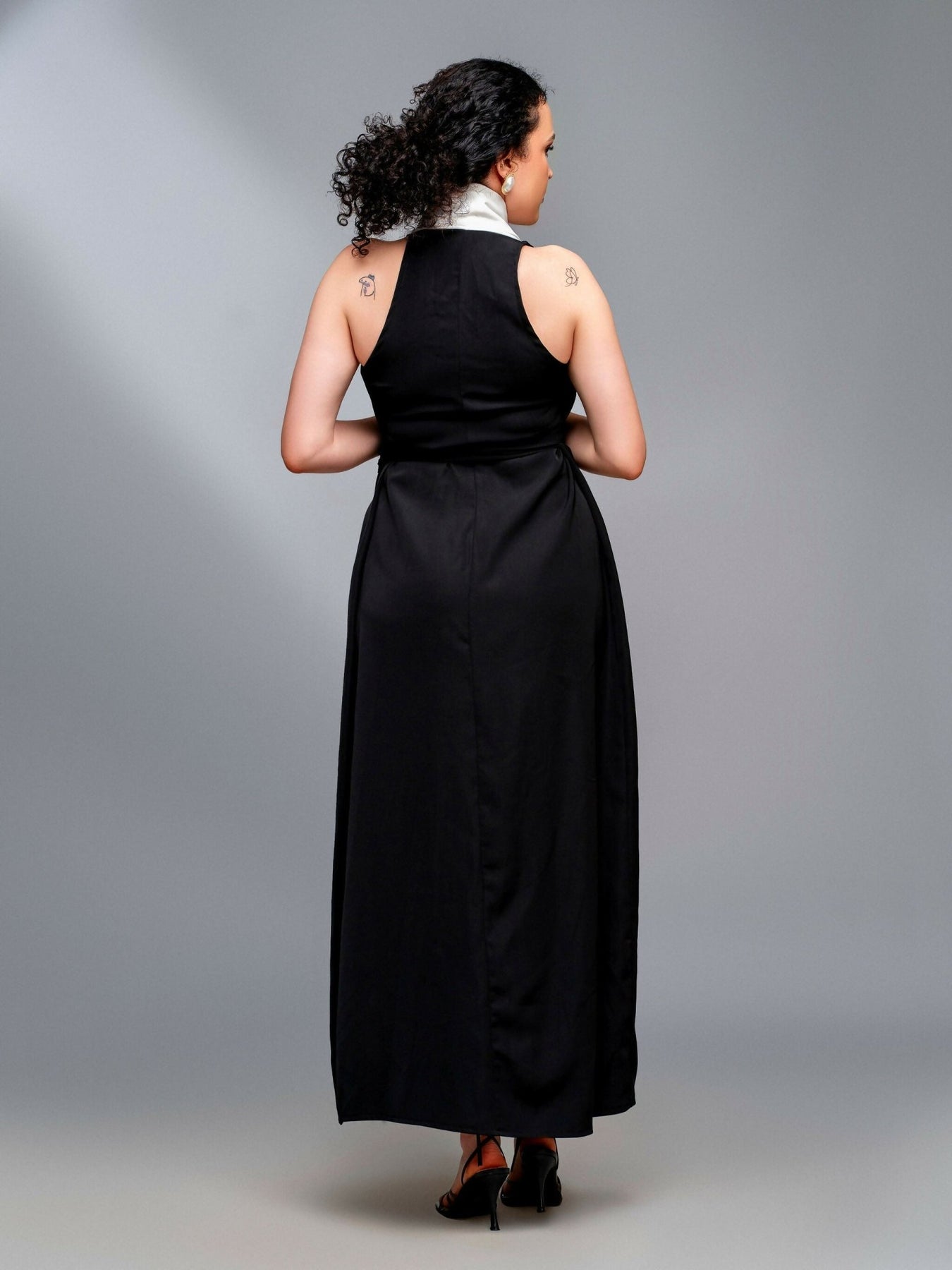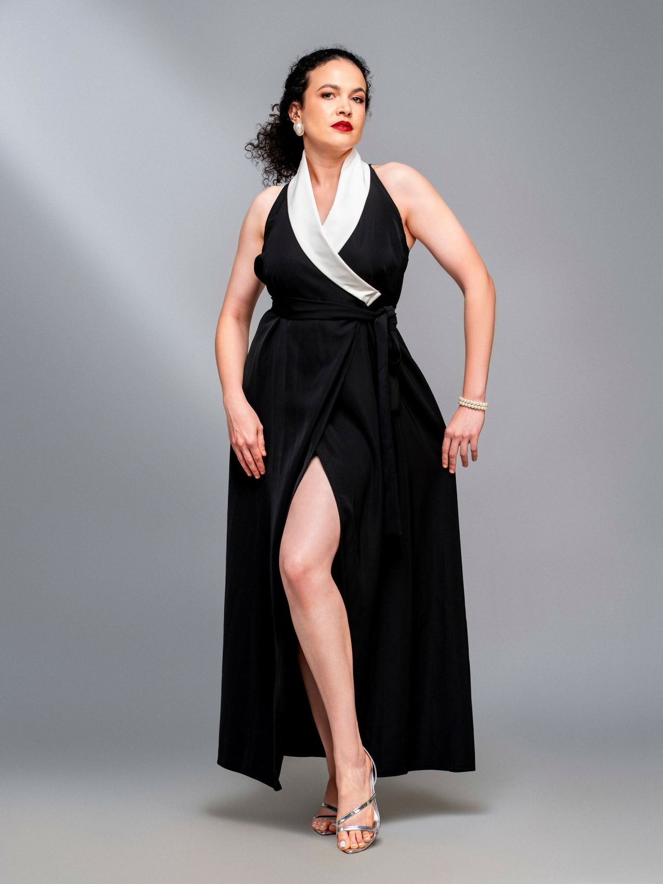 A masterclass in after-dark dressing, this black midaxi dress elevates the wrap silhouette with a statement contrast white collar, detailing. Cut in a universally flattering shape and midaxi length offer sophisticated coverage, while the wrap front allows for a customisable fit. The key to unlocking its full potential? A sculptural shiny boot pair and a maxi trench coat tobe taken off later