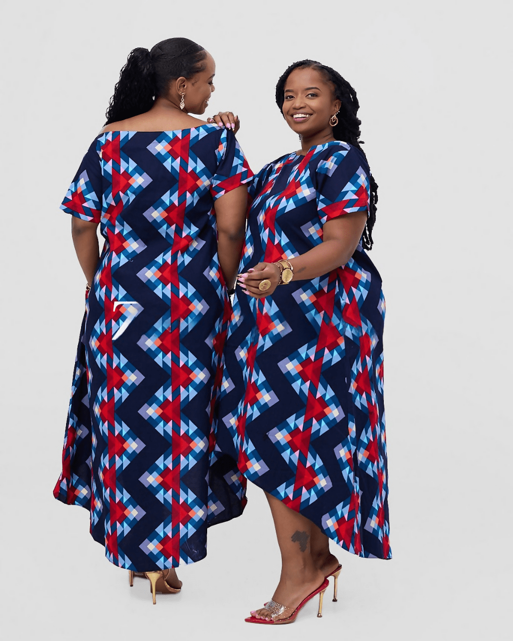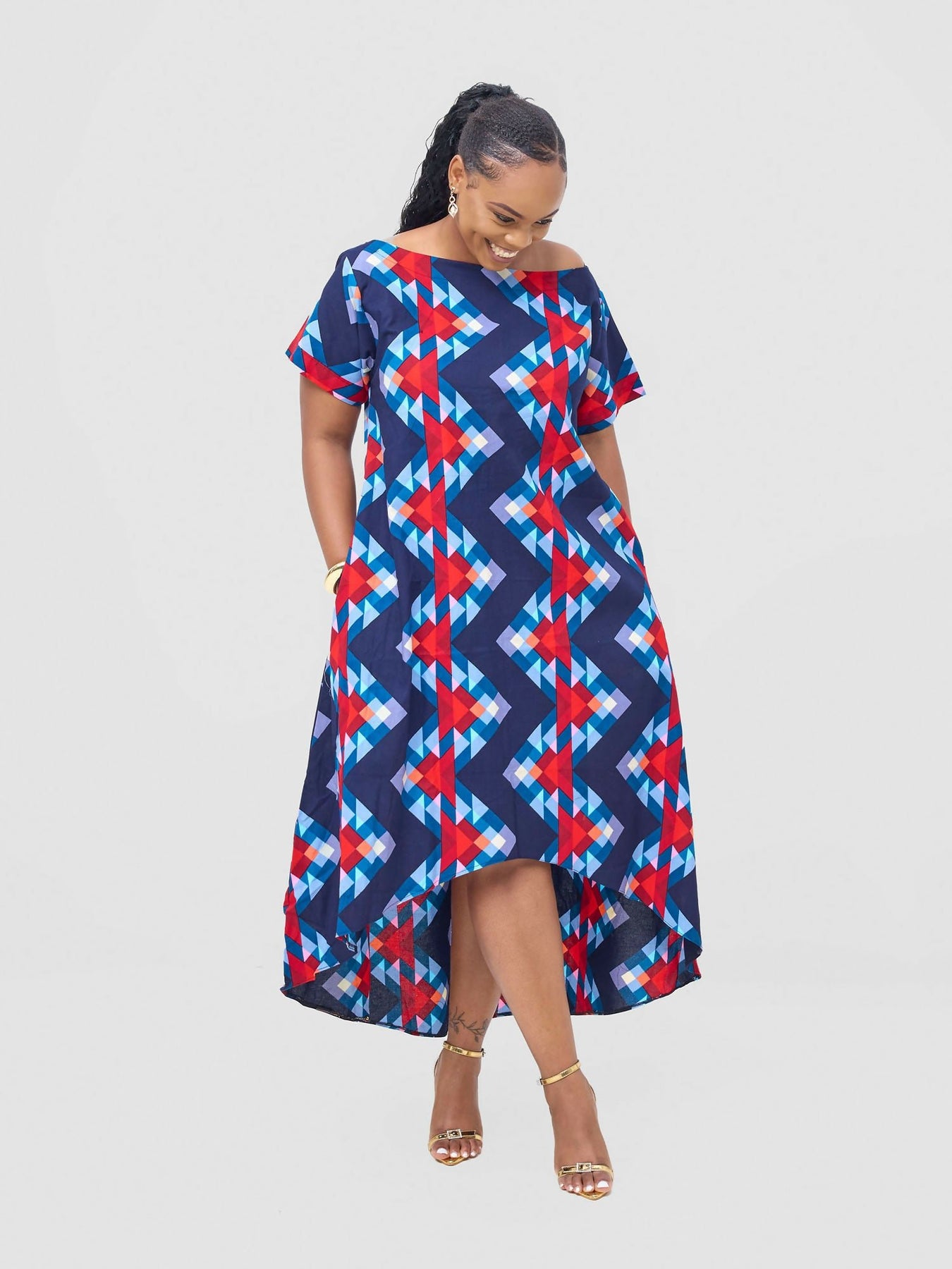 Step into the spotlight with confidence in the Zuri Bold Geo High-Low Dress — where tradition meets contemporary flair. Featuring a captivating geometric print in rich shades of navy, red, and sky blue, this dress is a celebration of bold color and modern African elegance.