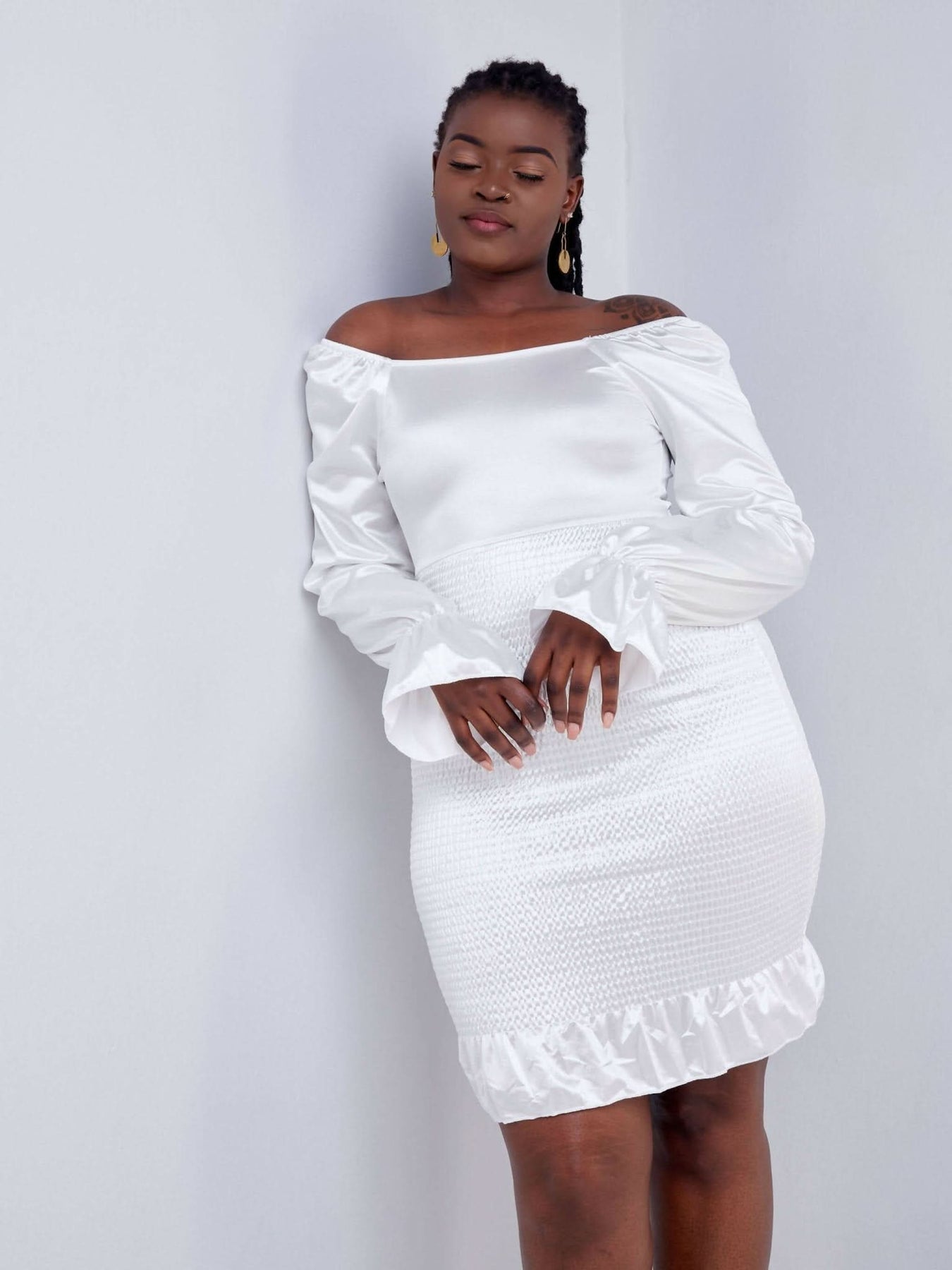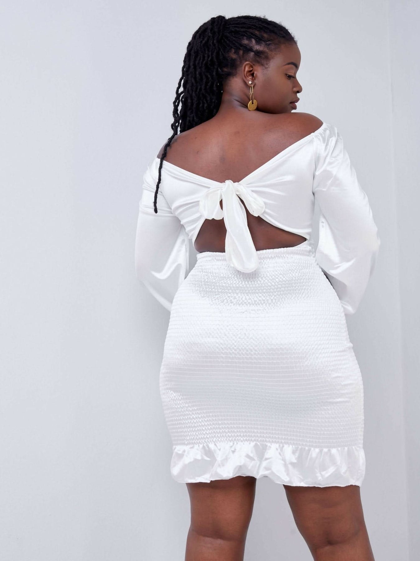 Style: Long Sleeved Silk arms, Shirred Bottom Dress with a Flounce & Open Back