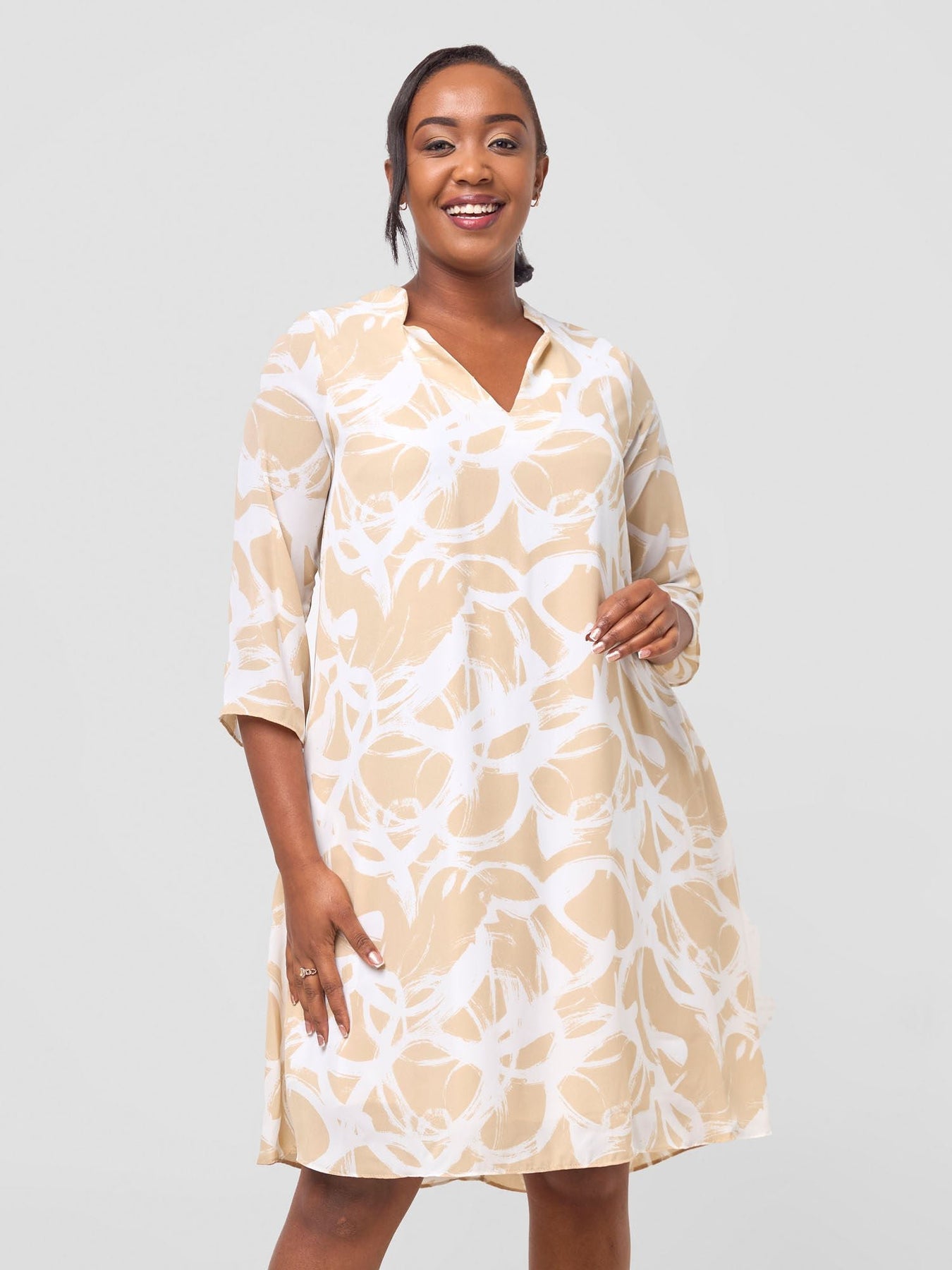 Vivo Pesi Notch Collar Tent Dress - Taupe / White Print - Shopzetu