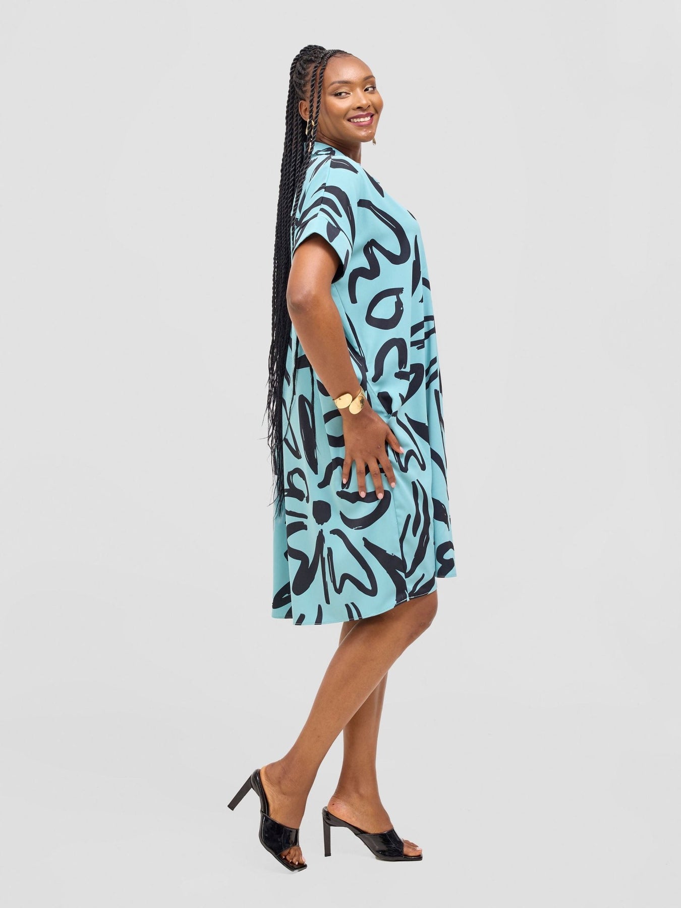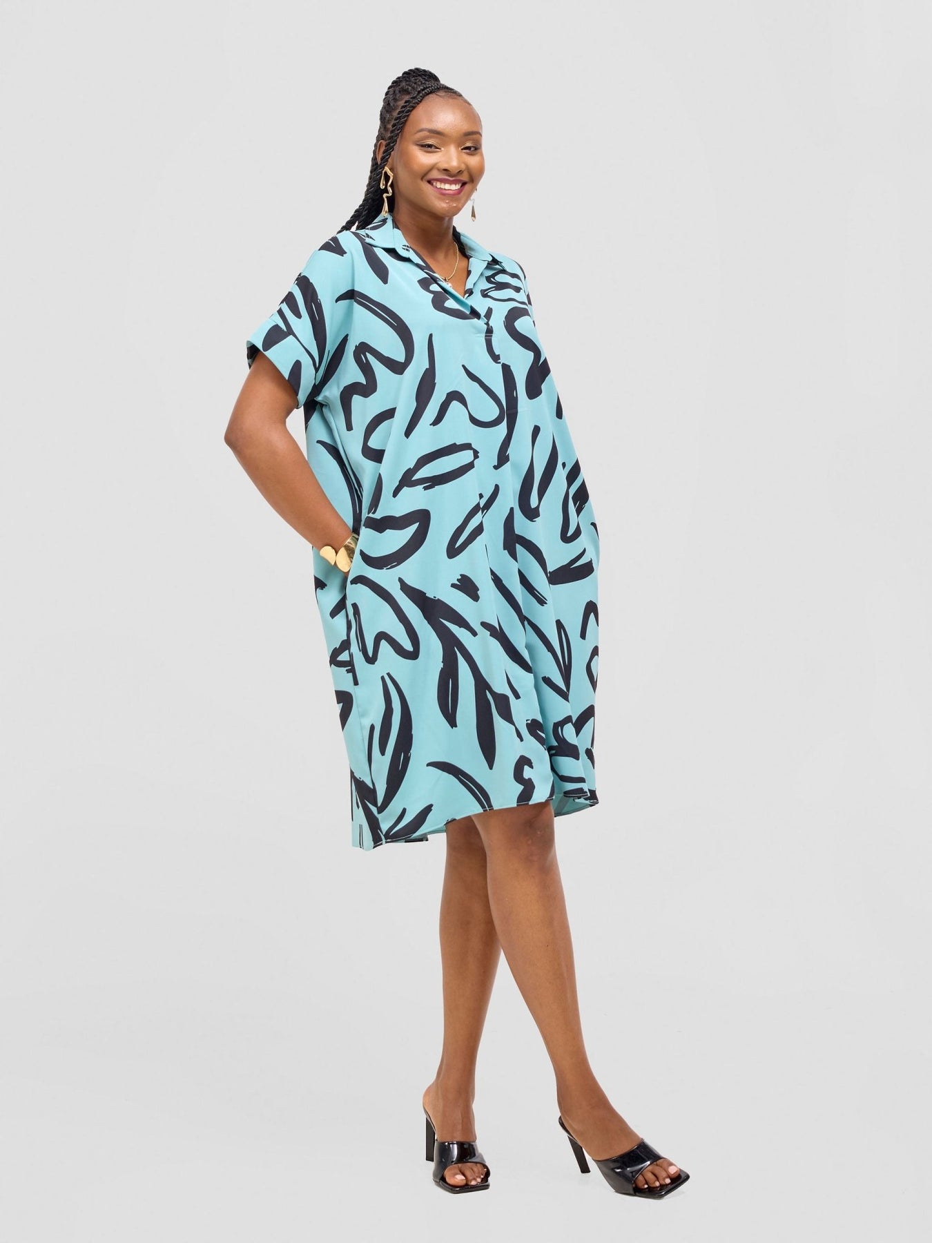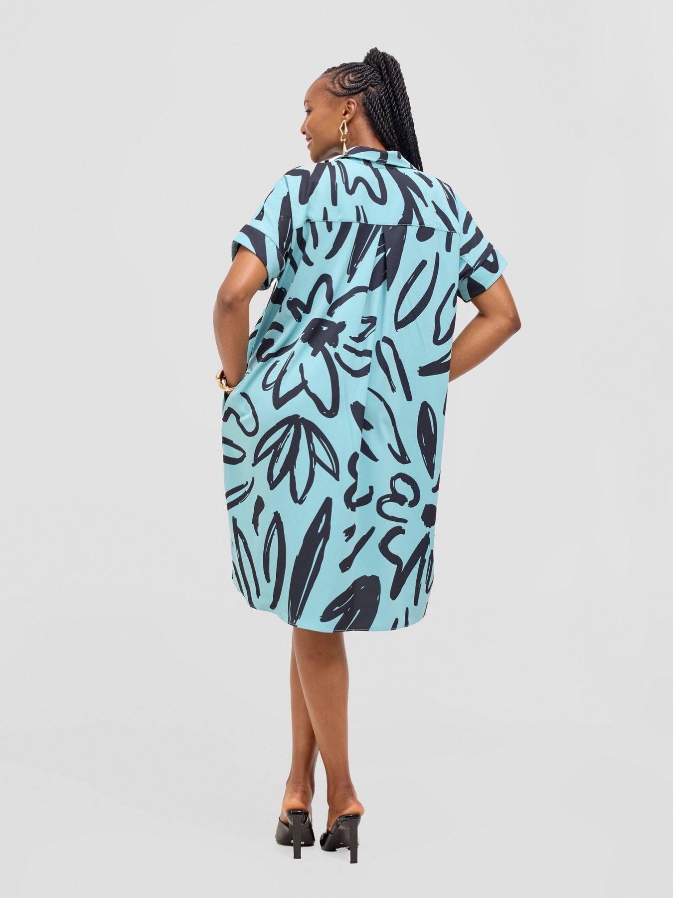 Vivo Reba Drop Shoulder Shirt Dress - Mint / Black Zari Print - Shopzetu