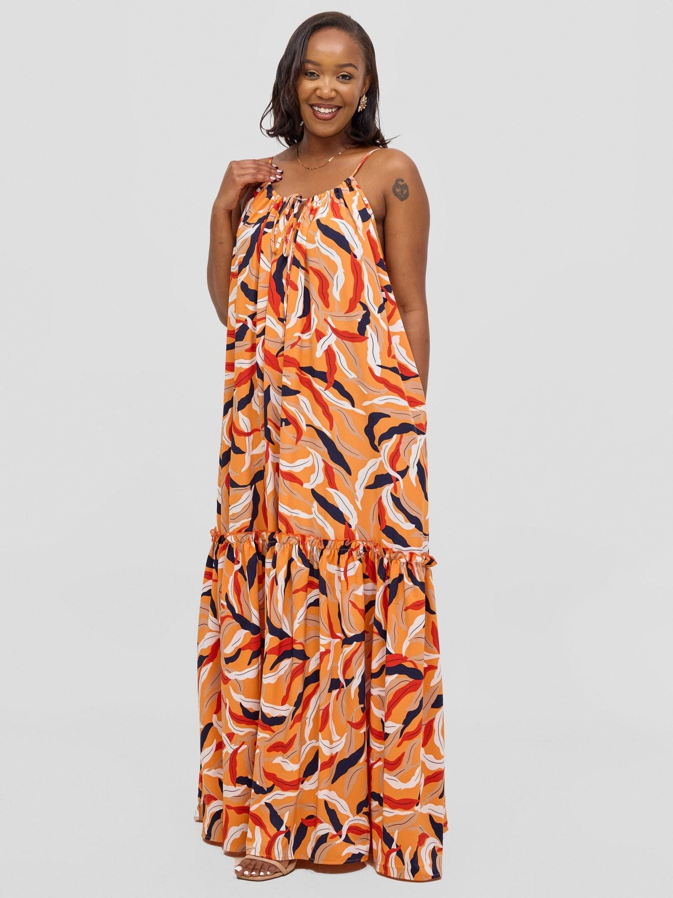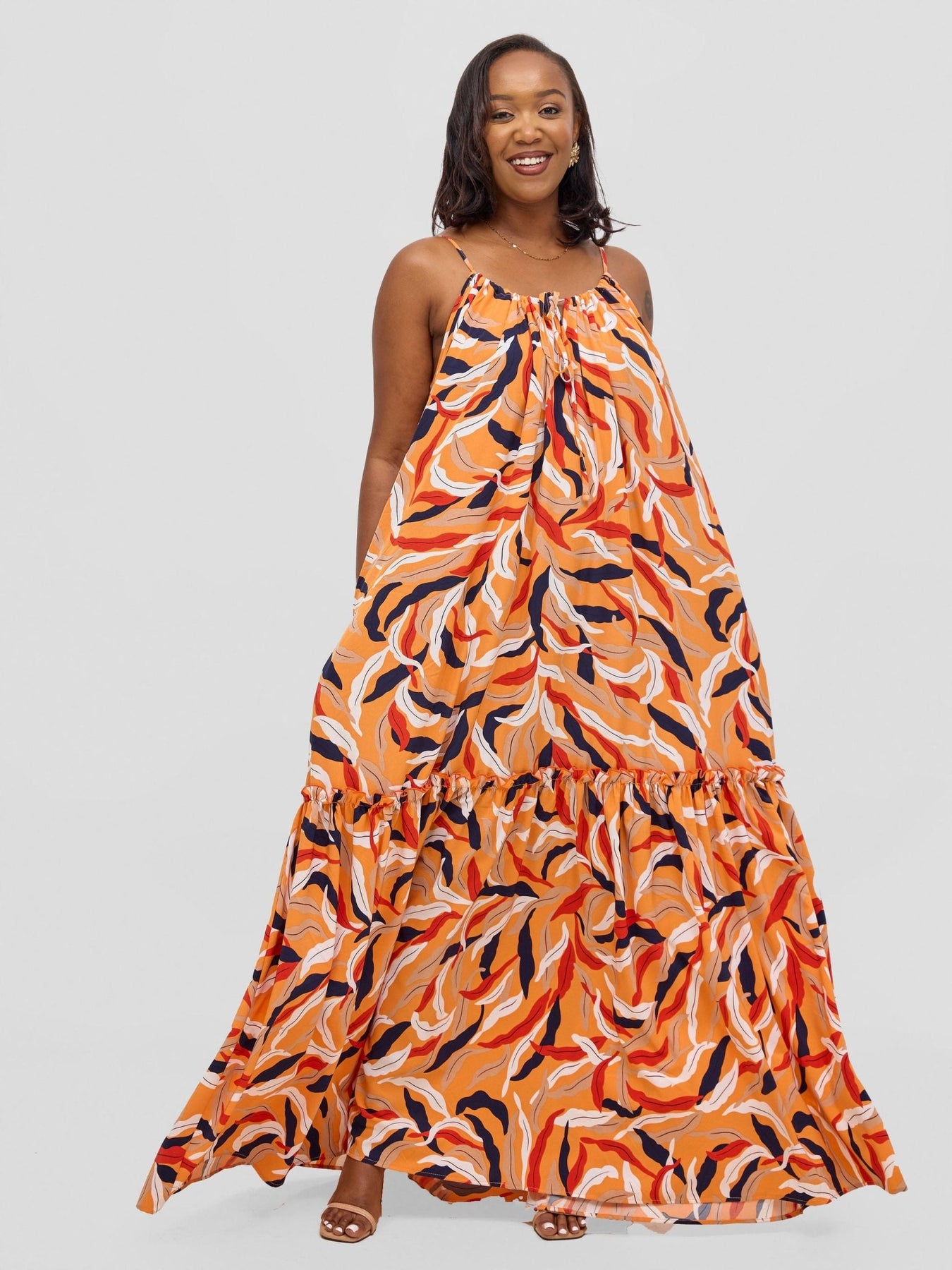 Vivo Sarabi Strappy Flounce Maxi Dress - Orange / Black Mali Print - Shopzetu