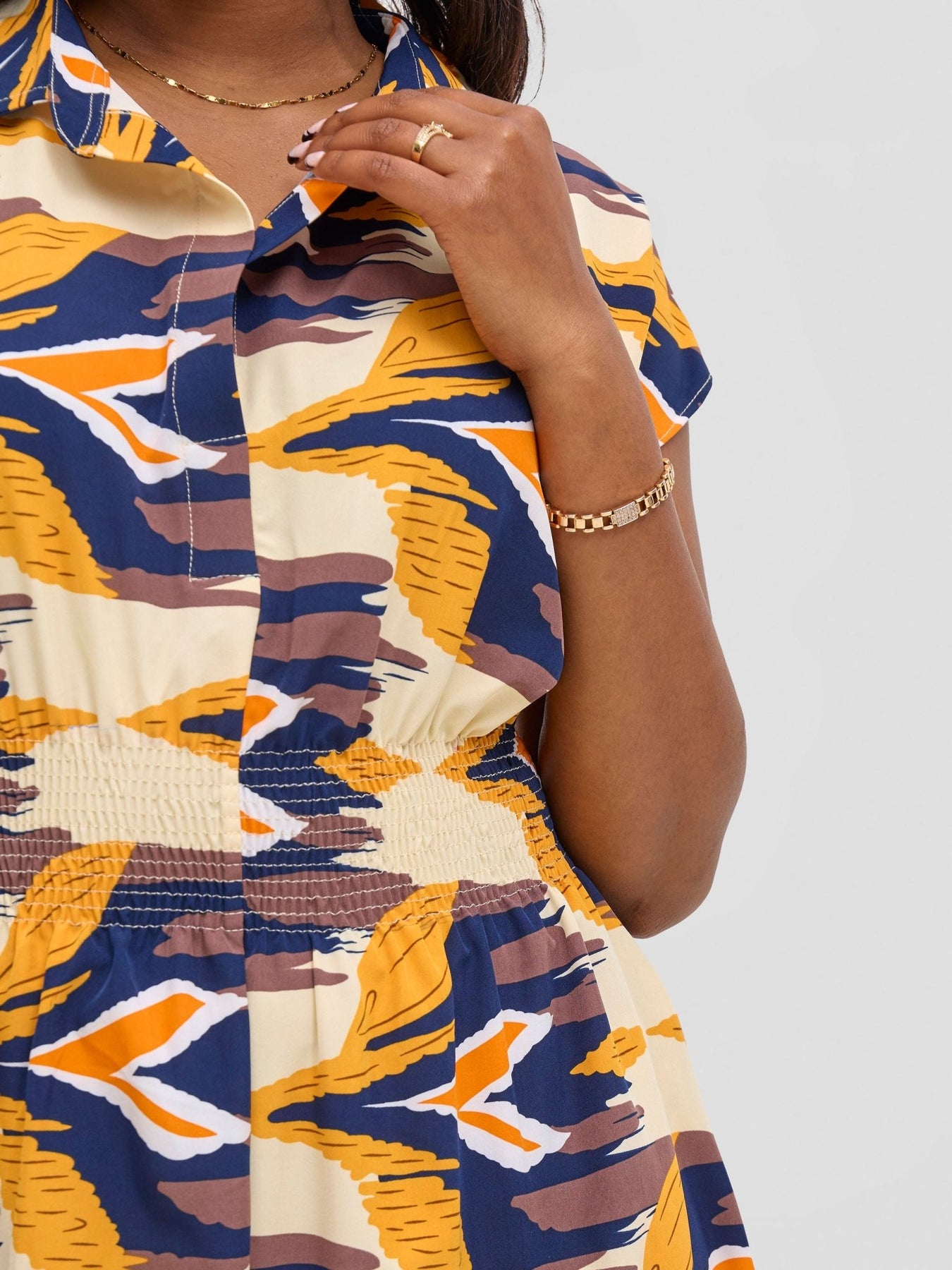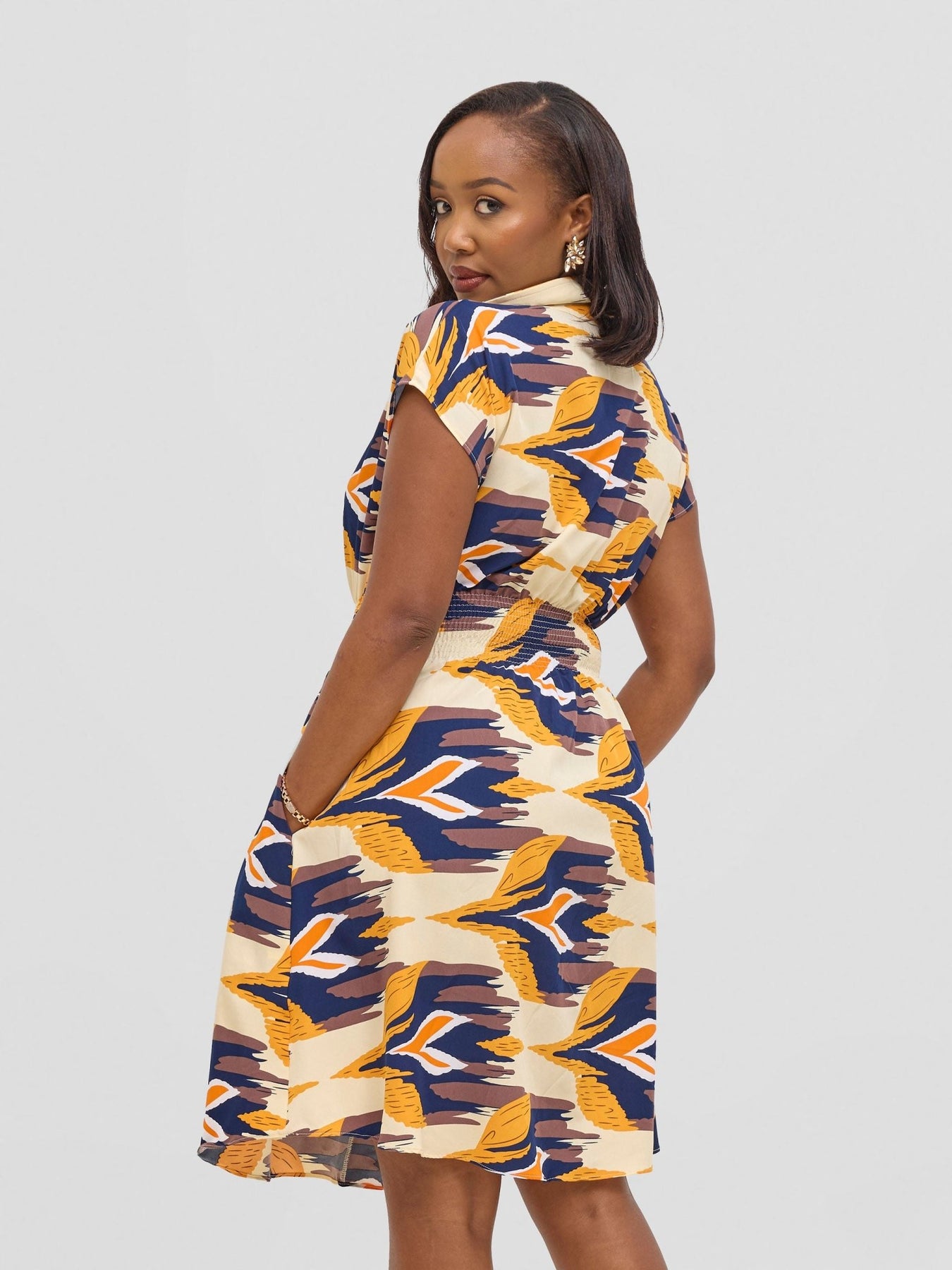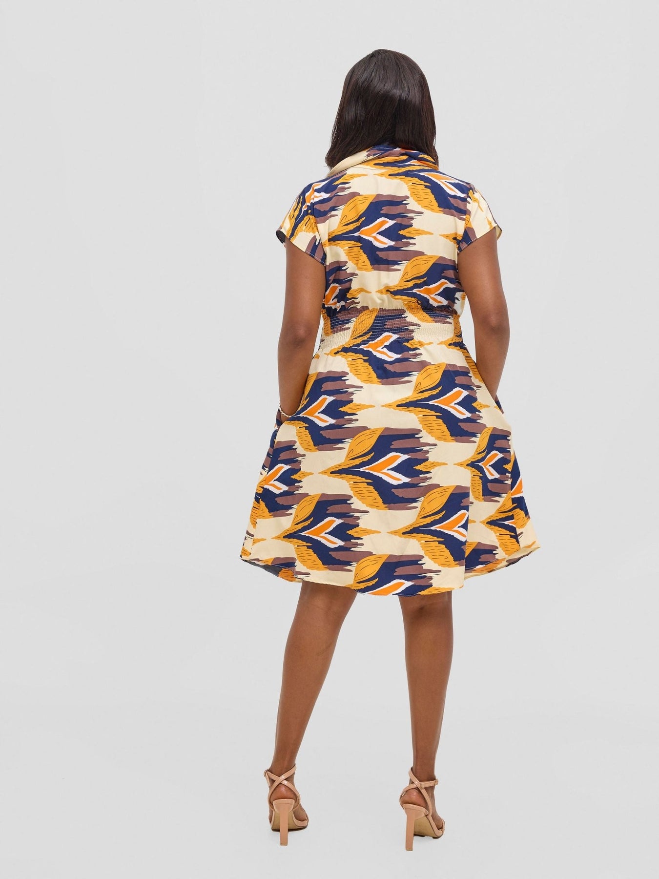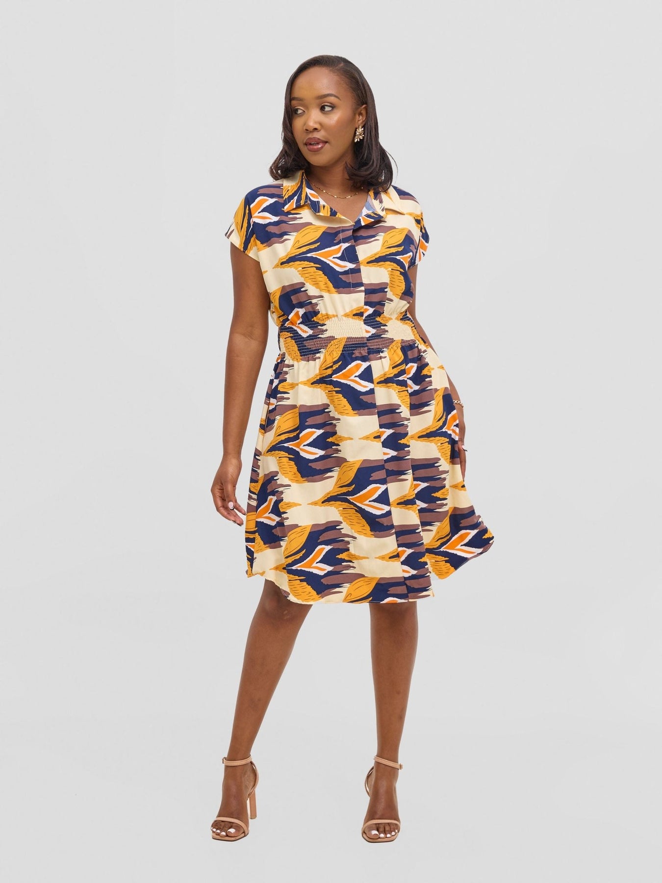 Vivo Zena Shirred Waist Shirt Dress - Beige / Mustard Print - Shopzetu