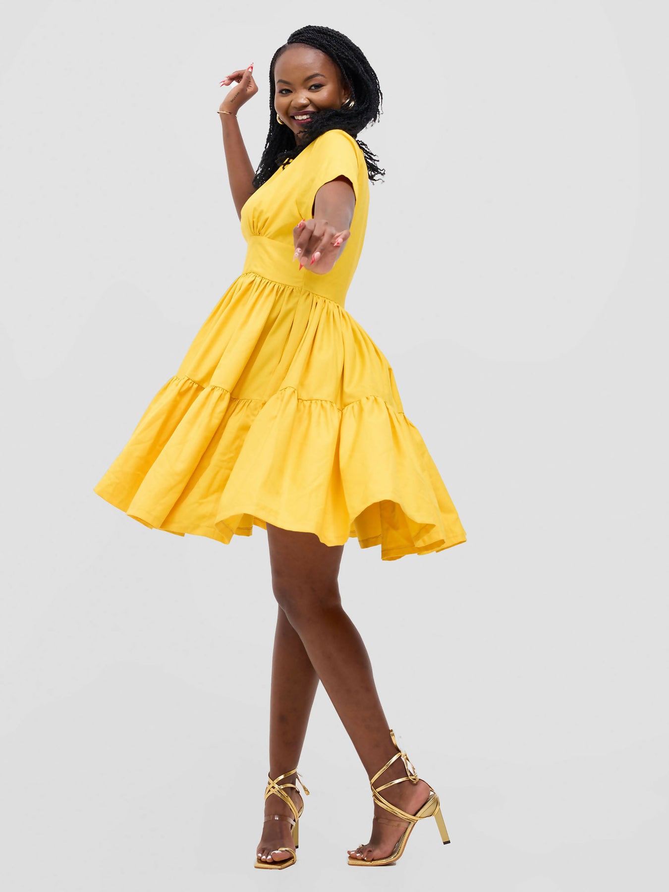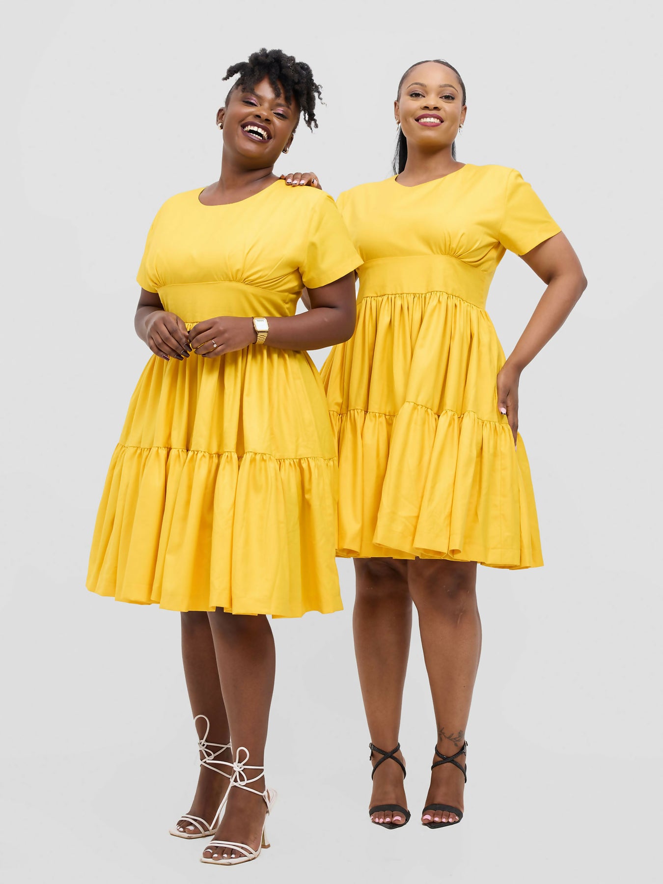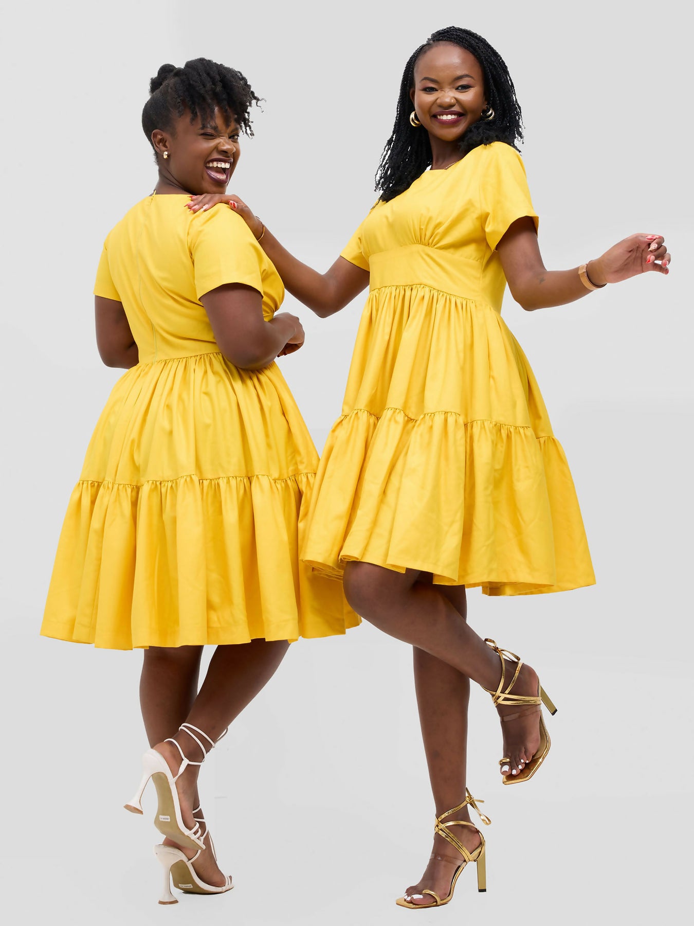 Our Knee - length yellow dress is designed to flatter every shape, with a fitted bodice, a gathered waist, and two - tiered gathers for that perfect flow. Made from luxurious, heavy cotton and crafted locally, this beauty is not just stunning but super functional - with pockets.