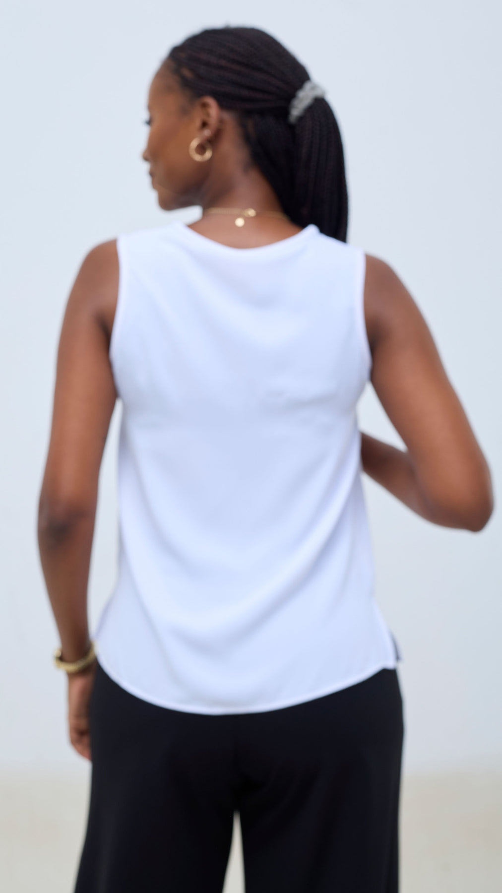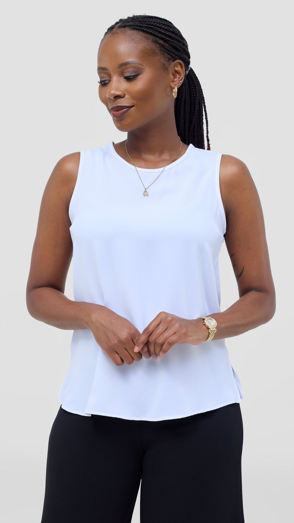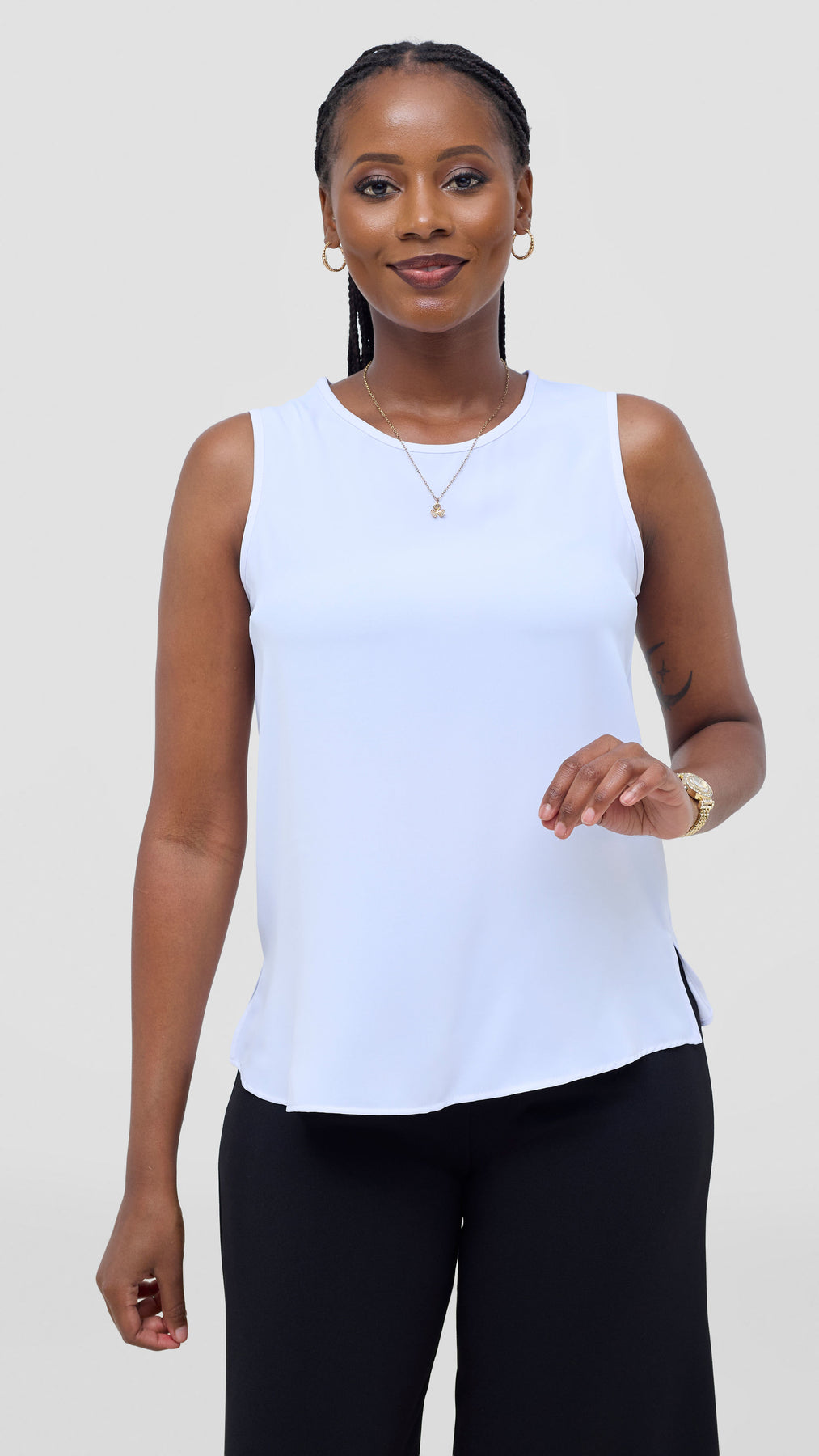 The Vivo Talia Sleeveless Tank Top in white embodies understated elegance and practical style. This essential piece features a streamlined cut that flatters effortlessly, making it perfect for layering or wearing solo during warmer months. The pristine white fabric provides a neutral canvas that complements any color palette, while the sleeveless design ensures maximum breathability and comfort. A timeless investment for those who appreciate quality basics with refined simplicity.