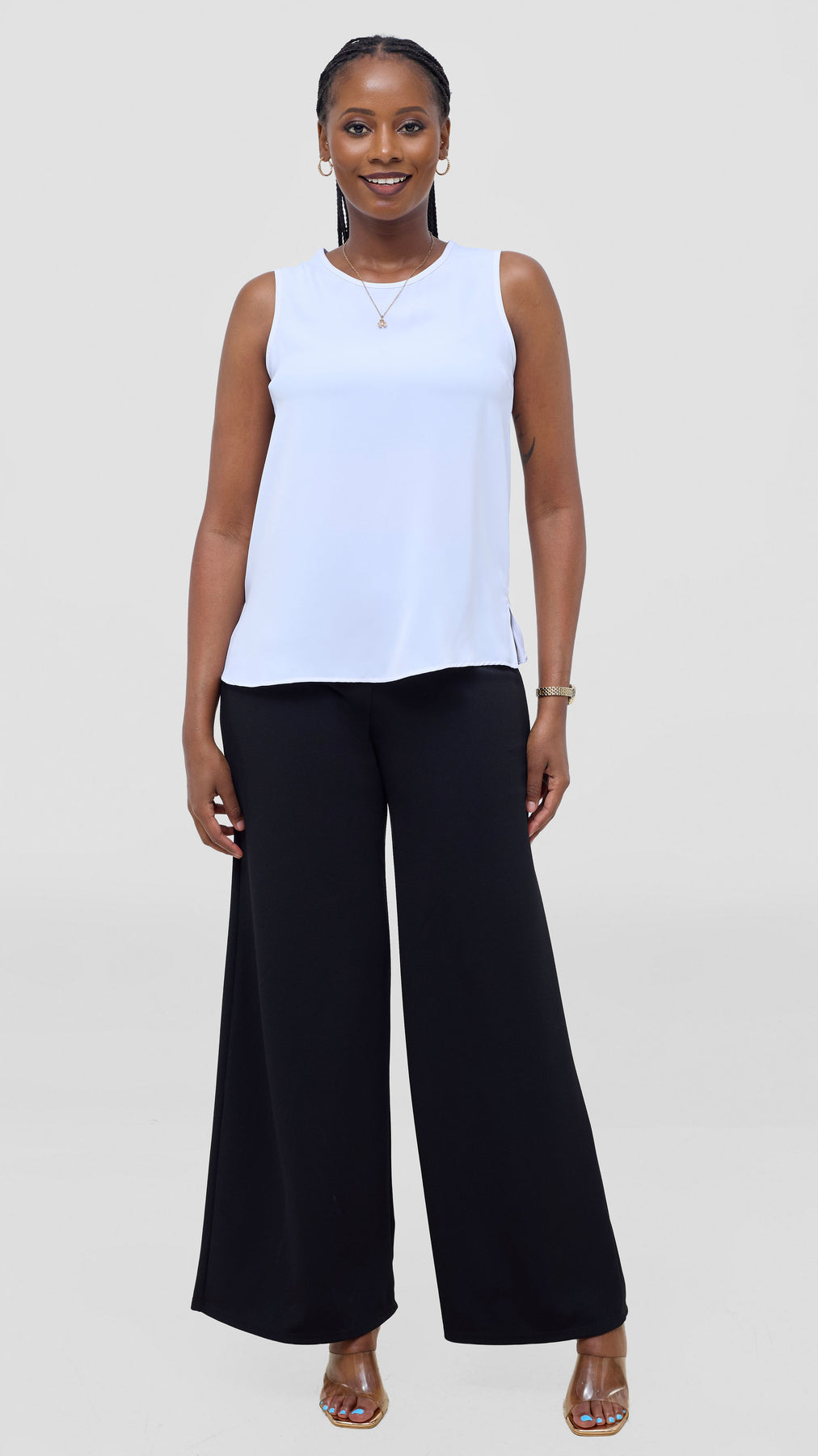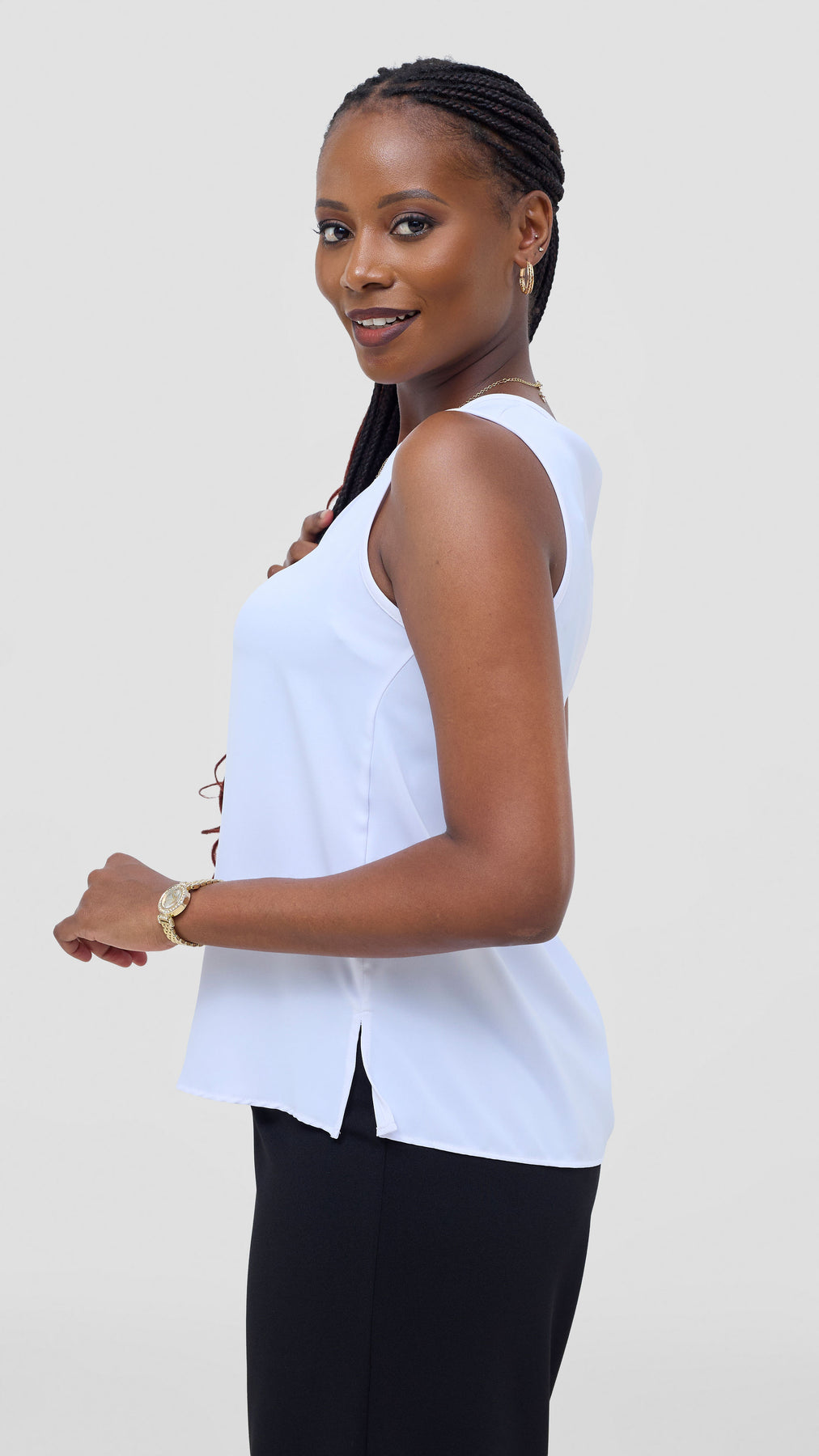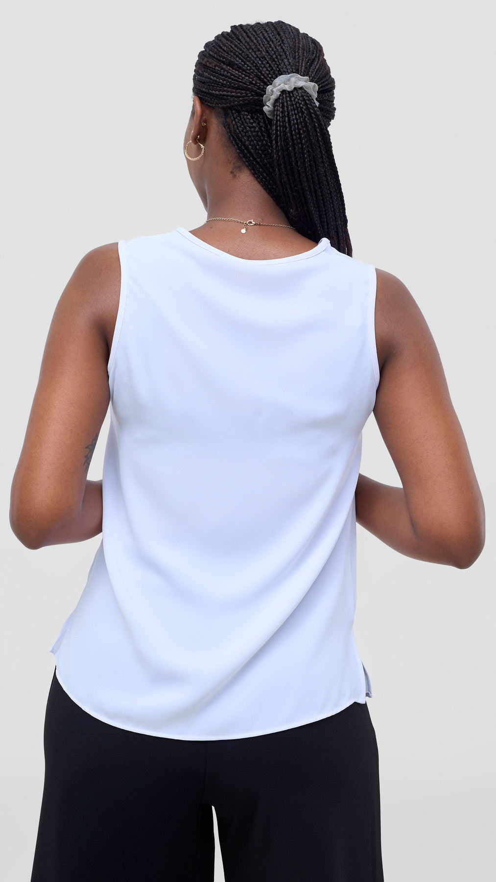 The Vivo Talia Sleeveless Tank Top in white embodies understated elegance and practical style. This essential piece features a streamlined cut that flatters effortlessly, making it perfect for layering or wearing solo during warmer months. The pristine white fabric provides a neutral canvas that complements any color palette, while the sleeveless design ensures maximum breathability and comfort. A timeless investment for those who appreciate quality basics with refined simplicity.