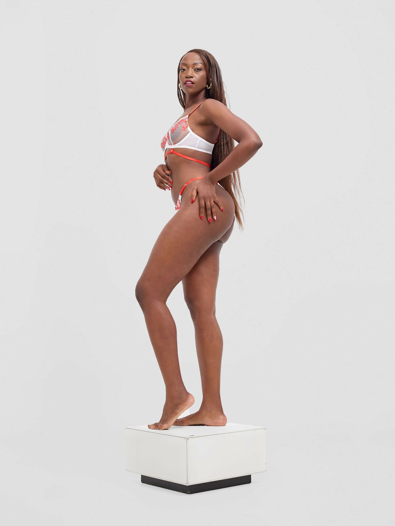 White lace design adorned with red hearts is crafted to make you feel irresistibly alluring. Complete with a matching thong, this set is perfect for those special moments when you wan to feel both playful and seductive.