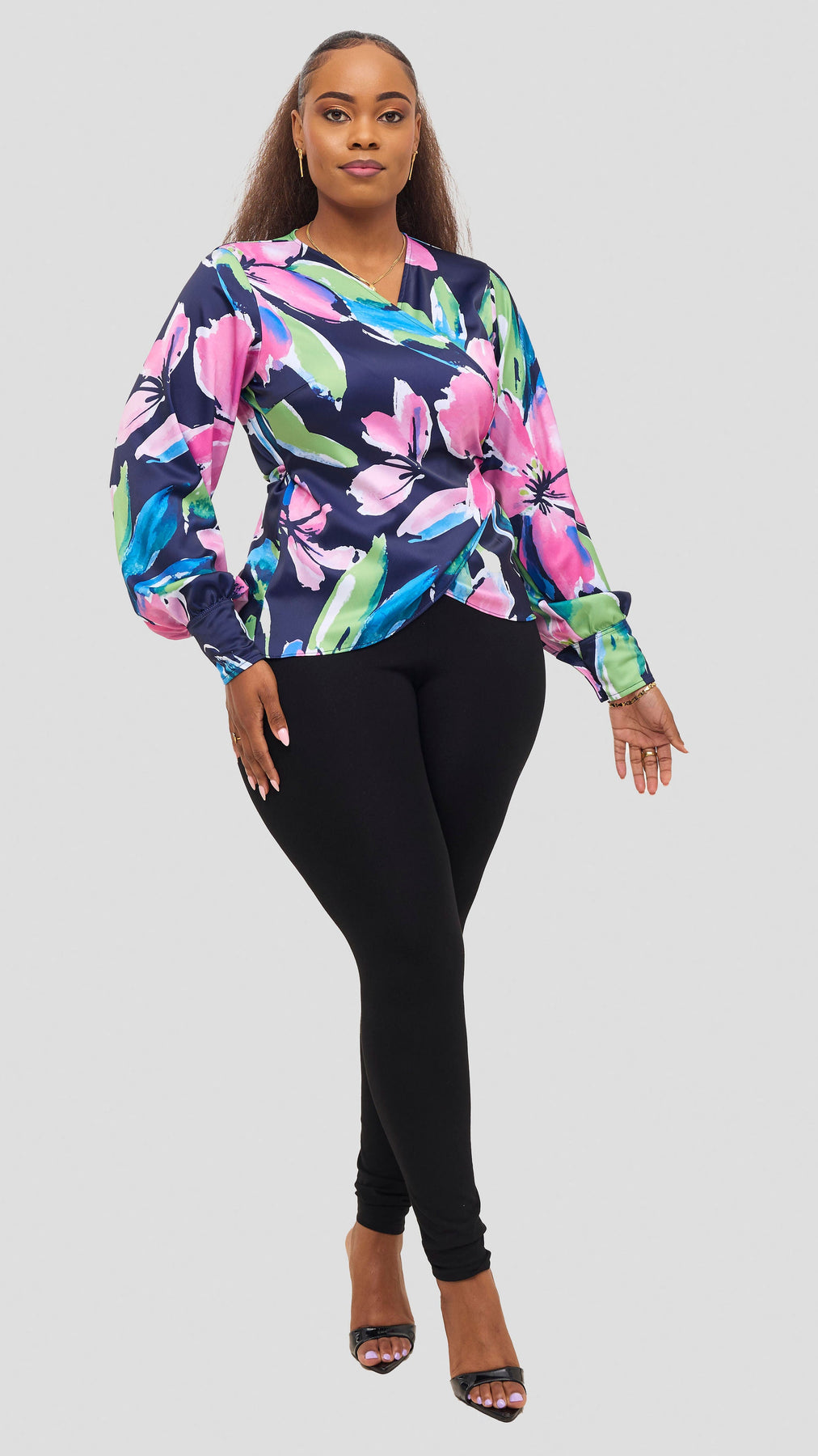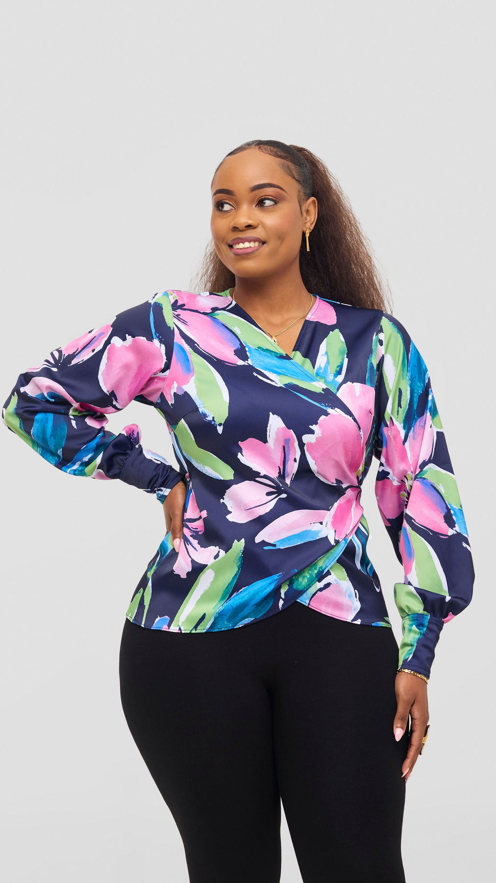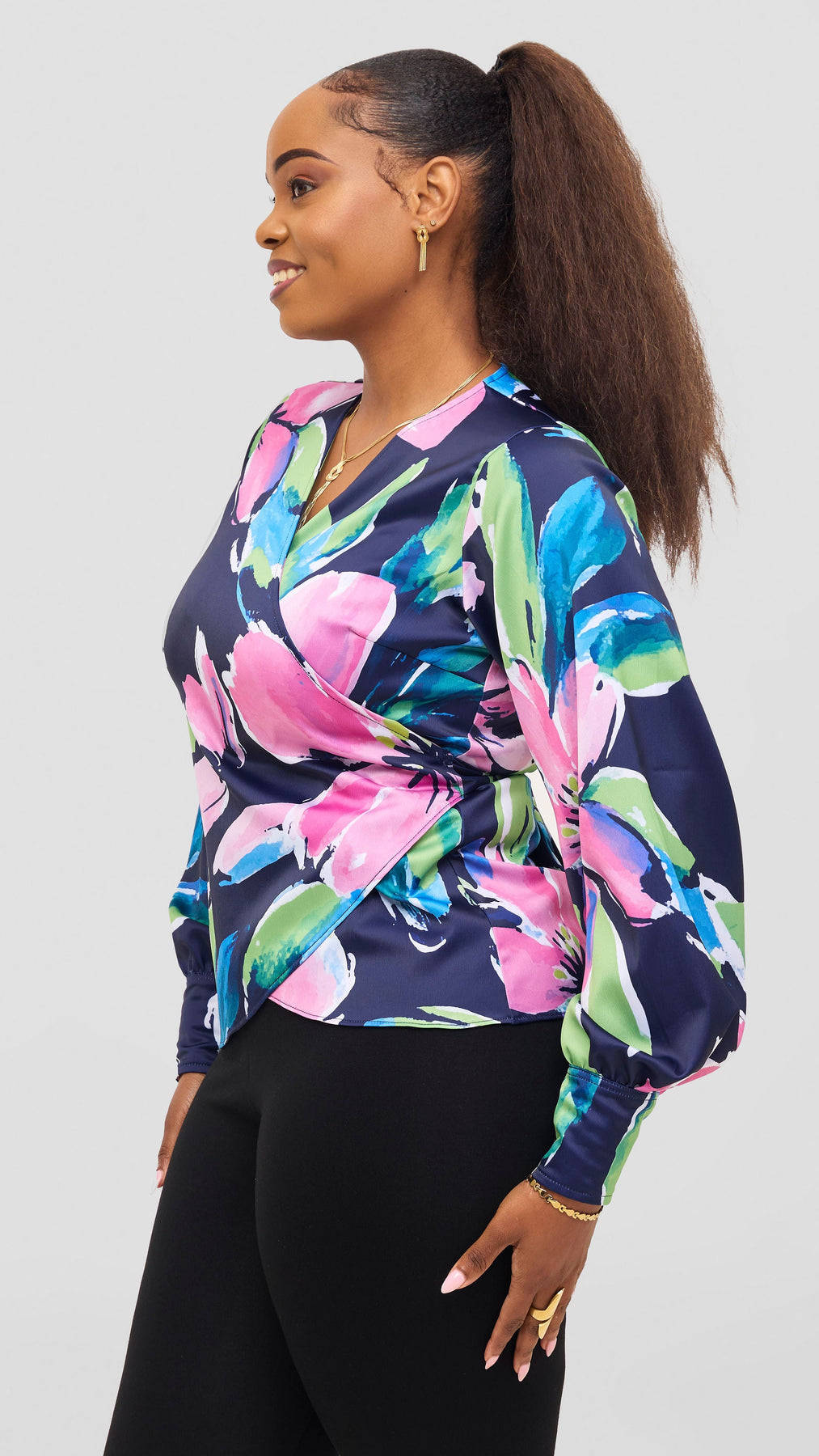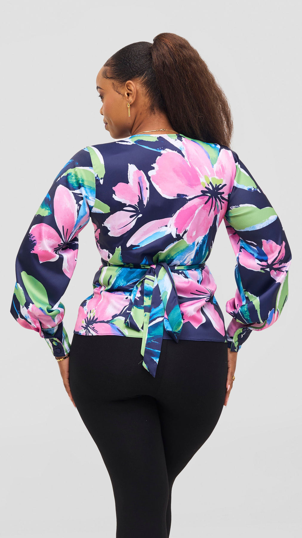 Vivo Merika Satin Wrap Top - Green / Pink Iya Print