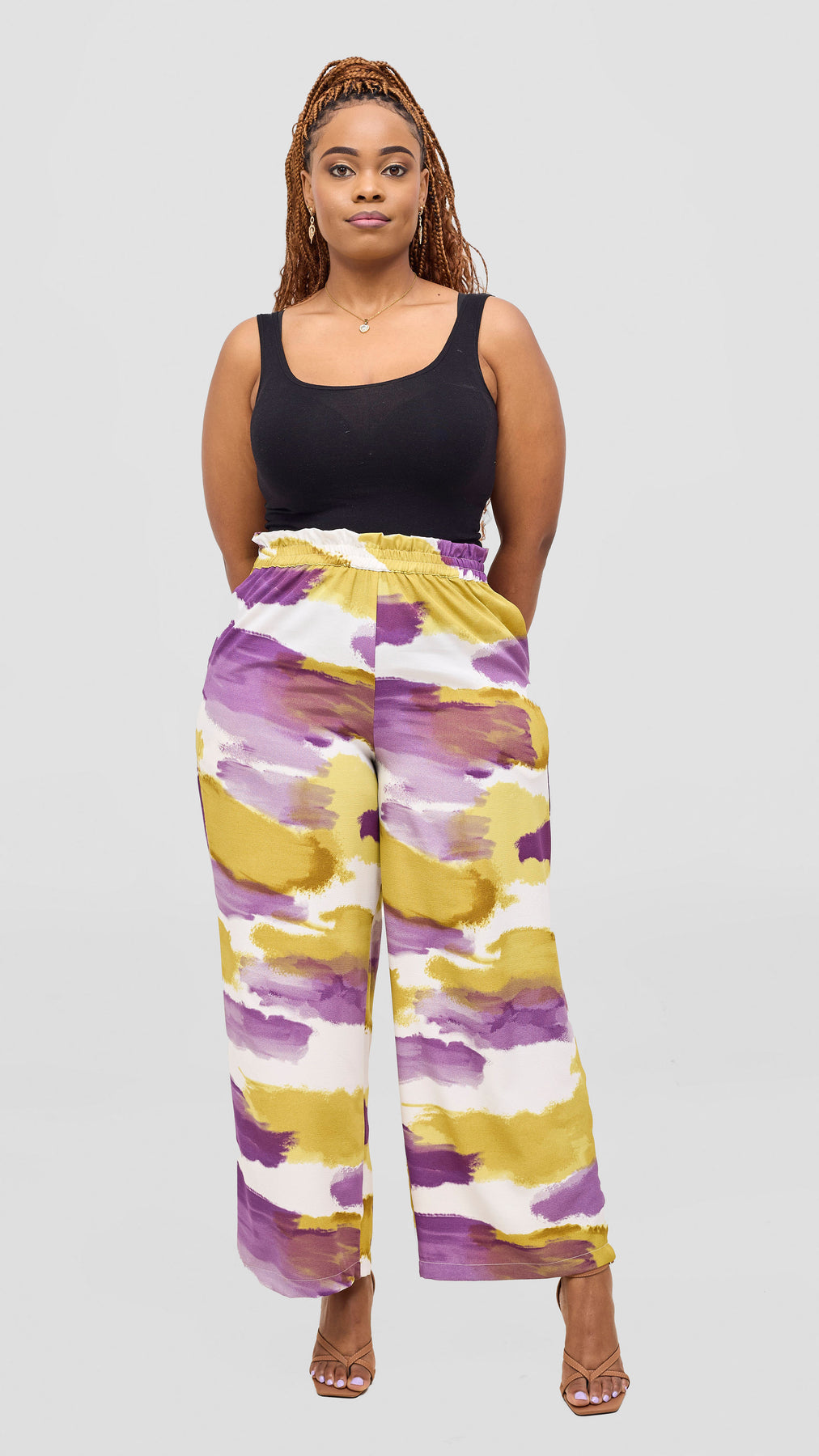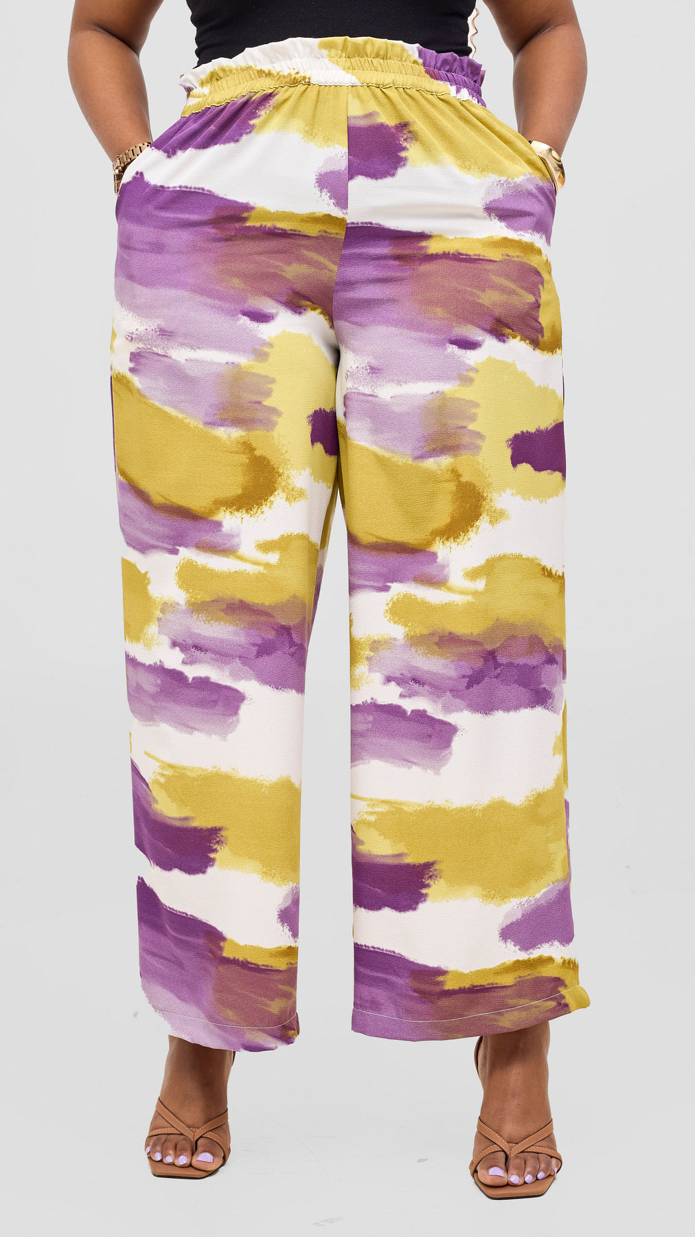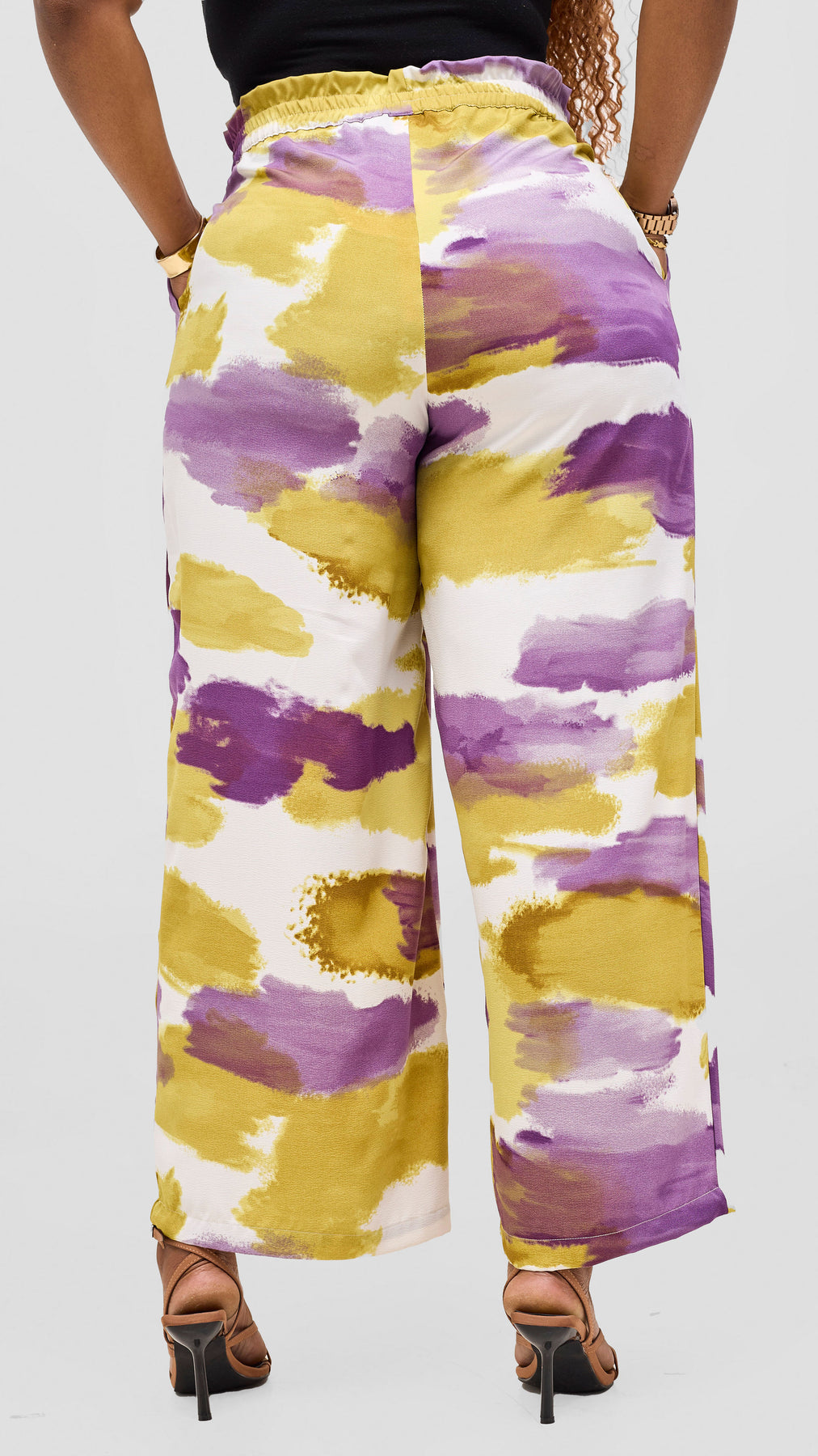 The Vivo Sanali Wide Leg Pants in Purple and Olive offer a stylish, comfortable fit that flows effortlessly. Whether paired with the matching top for a coordinated look or worn solo to highlight their vibrant print, these pants add versatile charm to your wardrobe. Ideal for both casual days and special outings, they bring ease and elegance to your style.