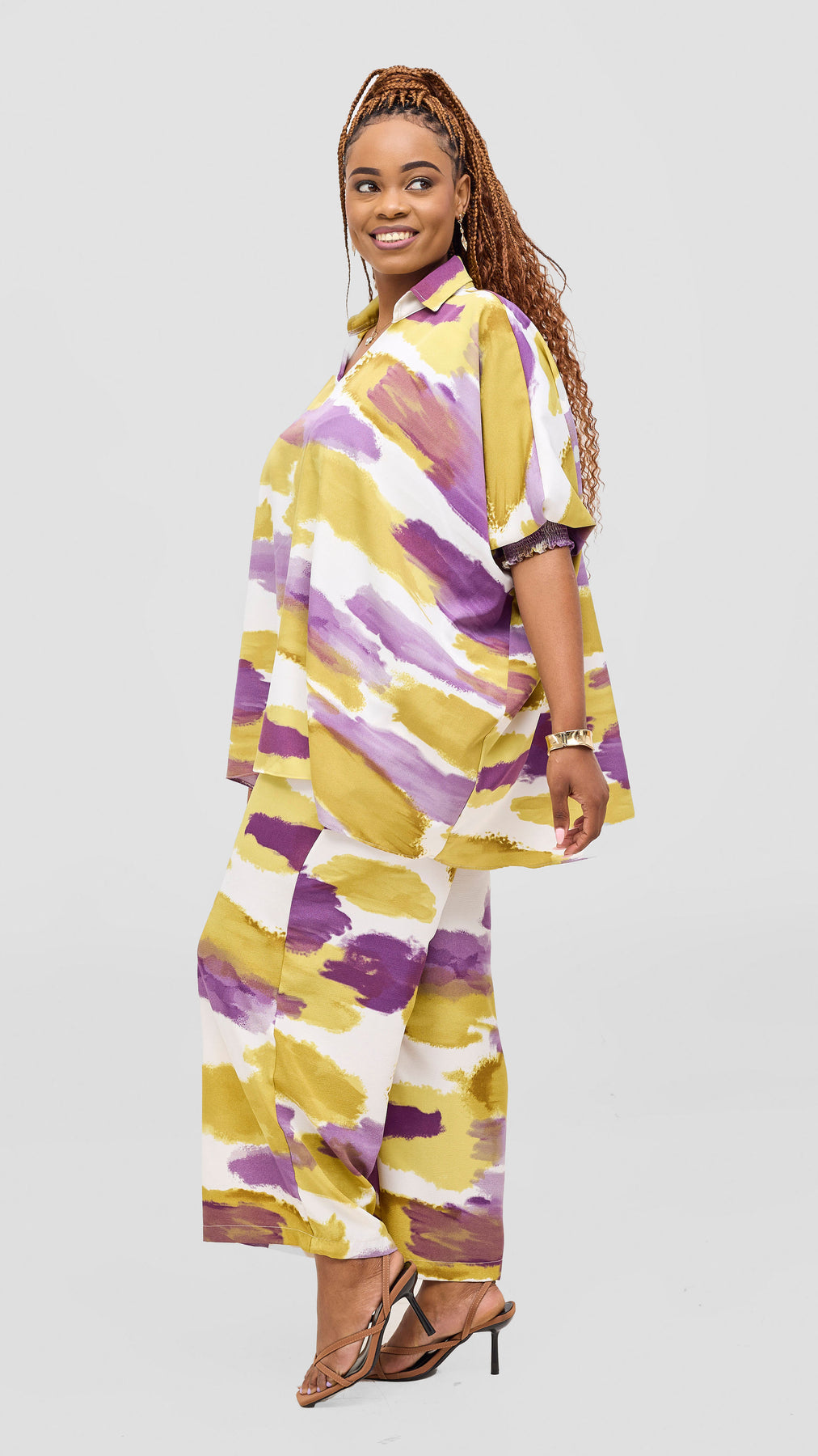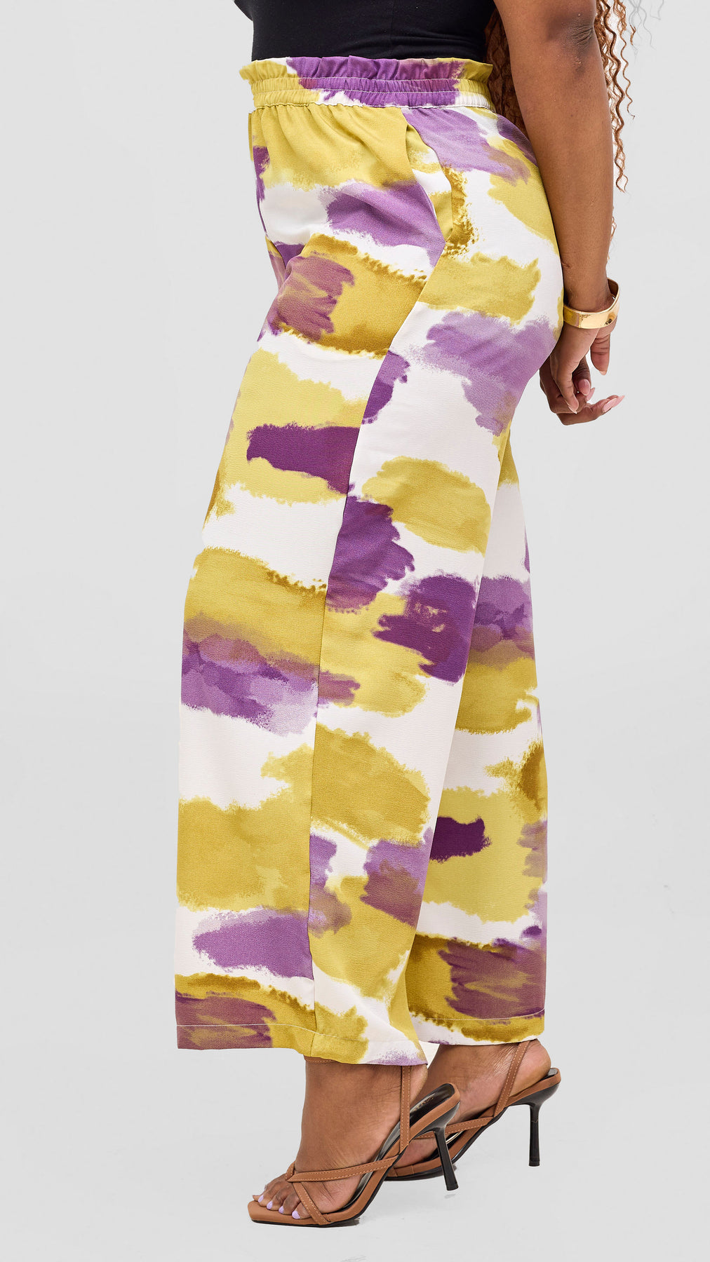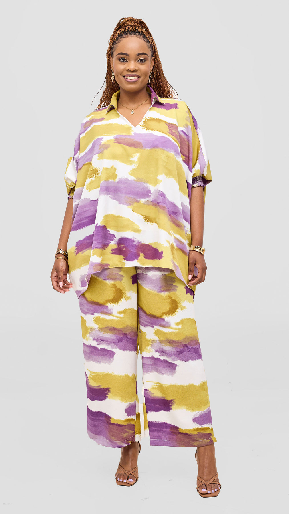The Vivo Sanali Wide Leg Pants in Purple and Olive offer a stylish, comfortable fit that flows effortlessly. Whether paired with the matching top for a coordinated look or worn solo to highlight their vibrant print, these pants add versatile charm to your wardrobe. Ideal for both casual days and special outings, they bring ease and elegance to your style.
