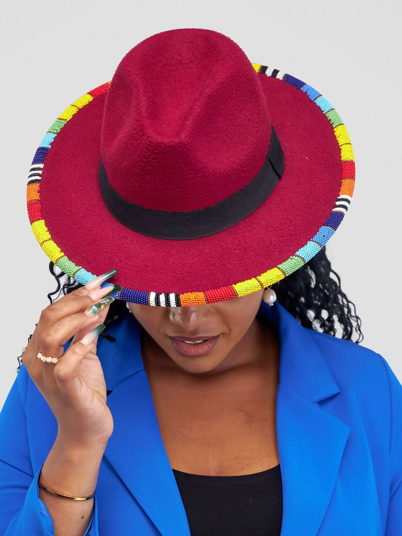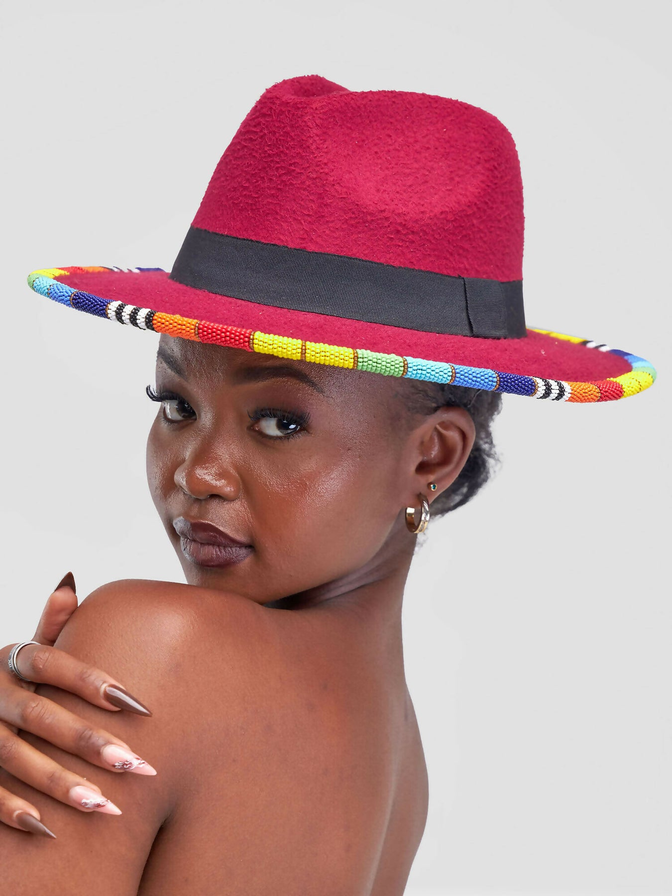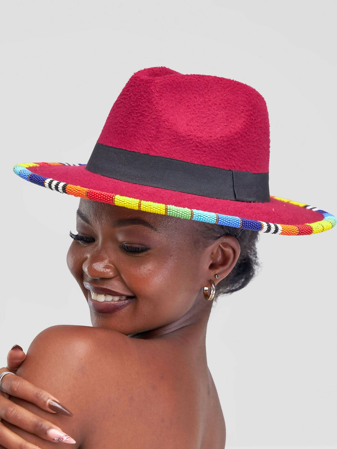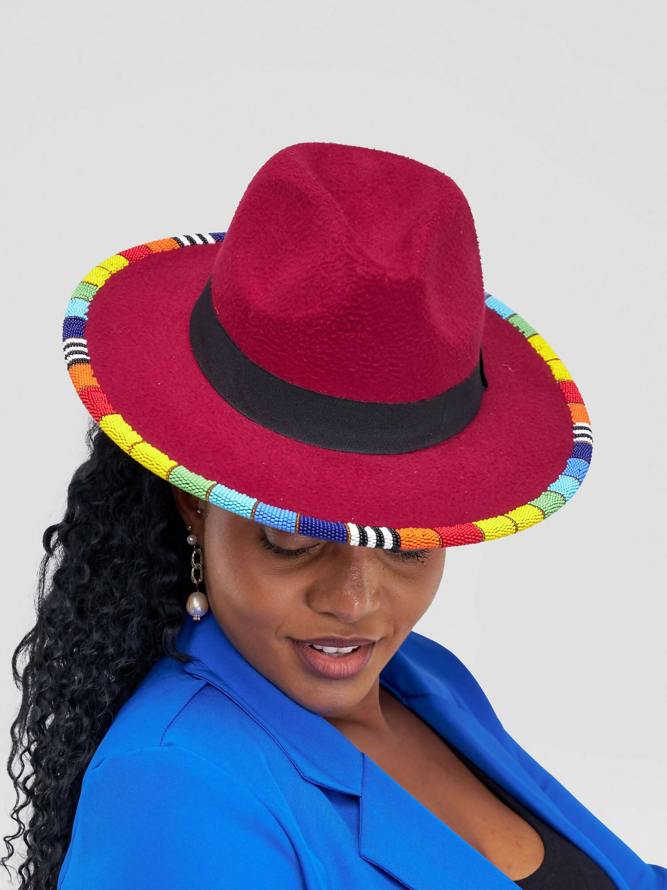 Bold, vibrant, and full of character – this maroon fedora is the perfect accessory for anyone who loves to stand out. Handcrafted from premium felt, it features a sleek black band around the crown and a stunning hand-beaded brim in rainbow colors. Each bead is meticulously strung to bring a touch of African artistry to a timeless design.
