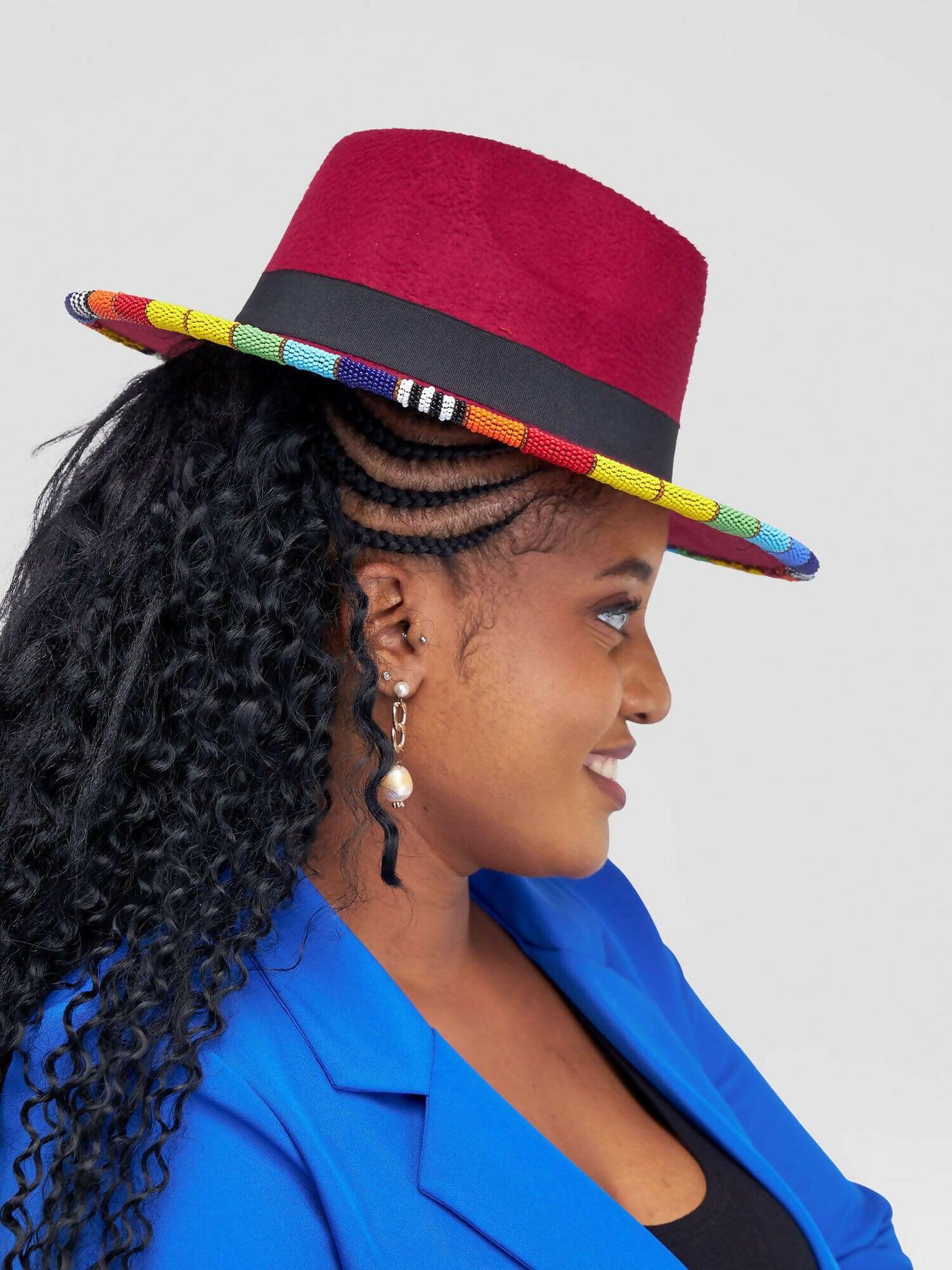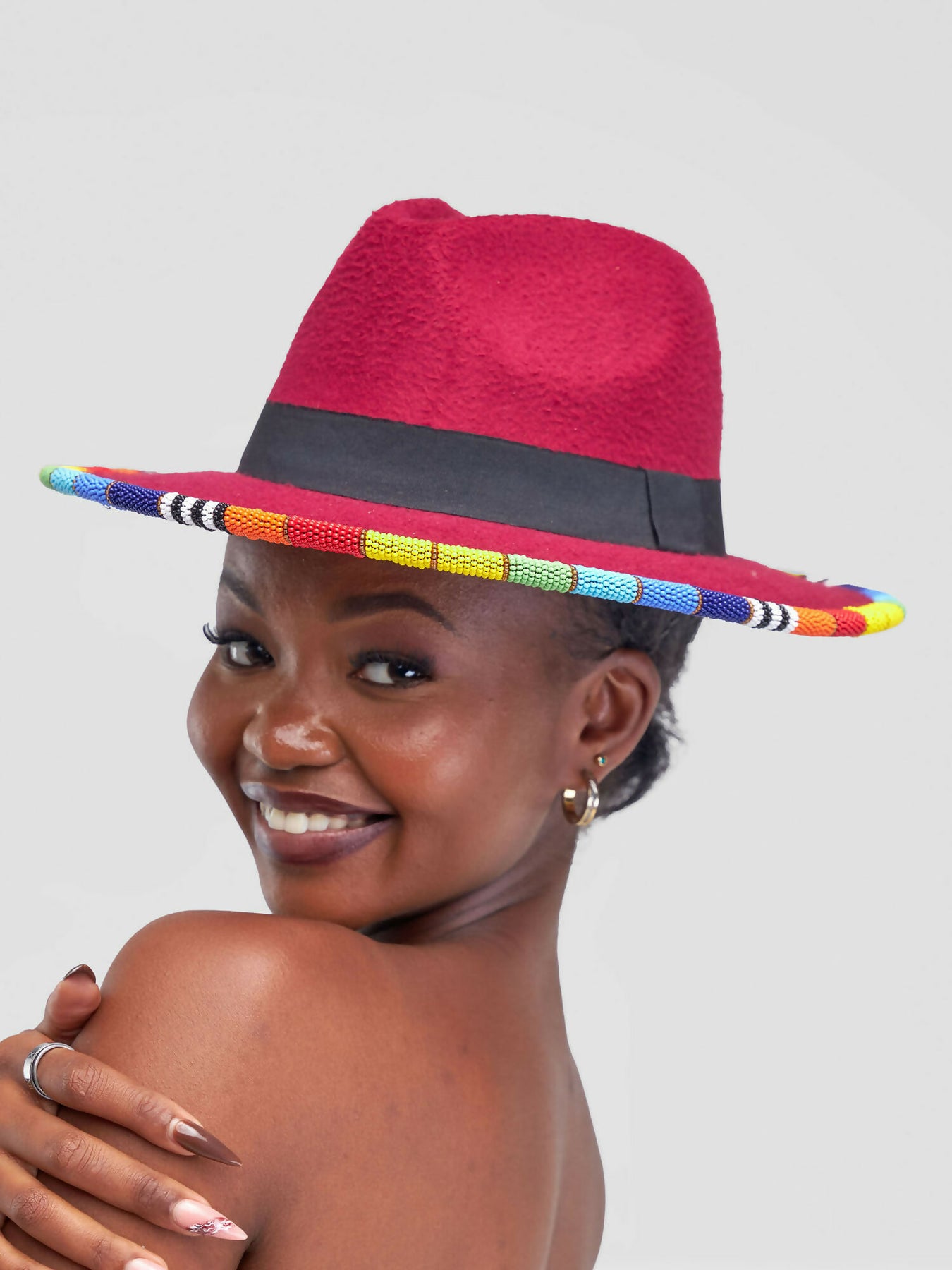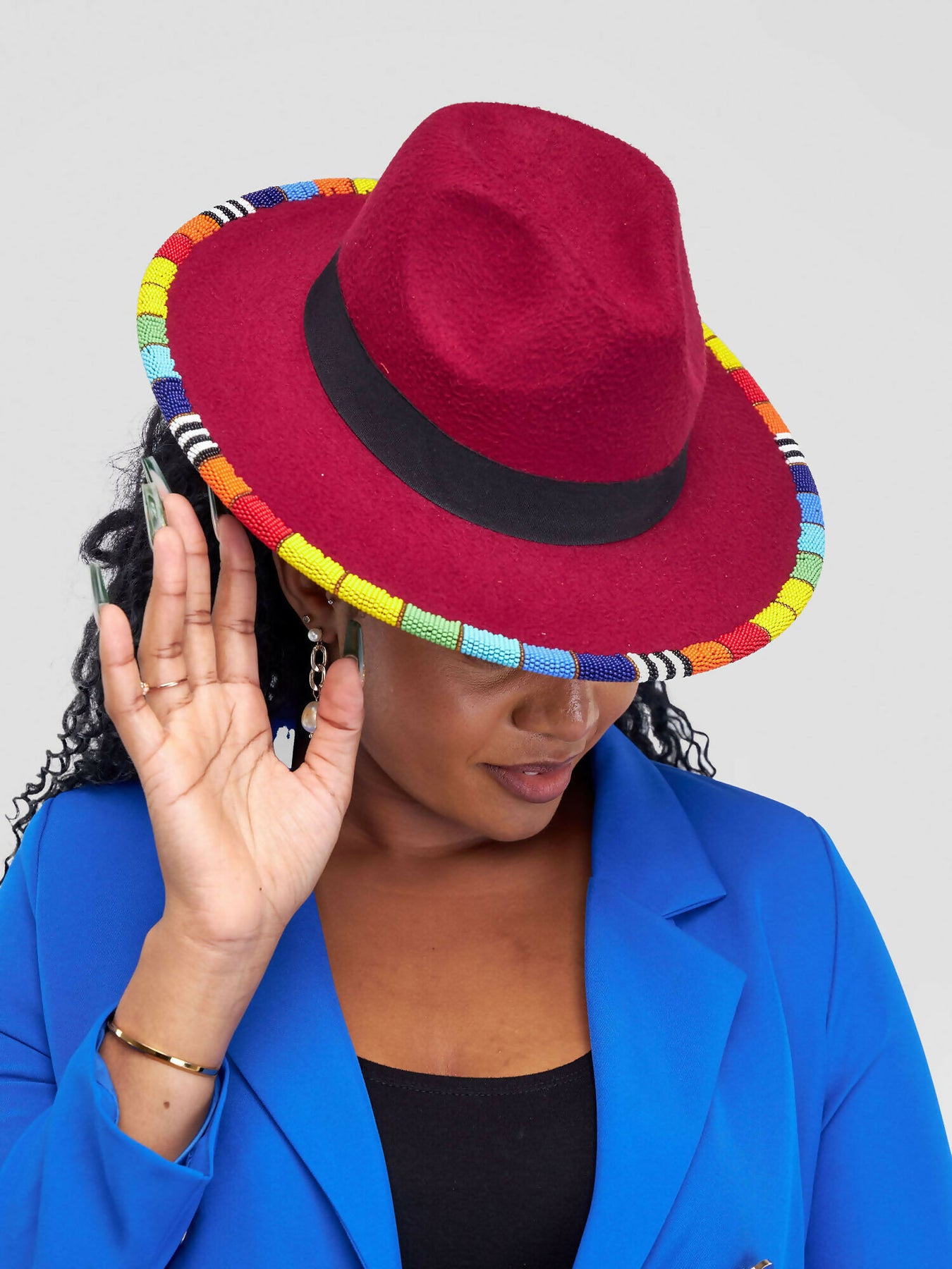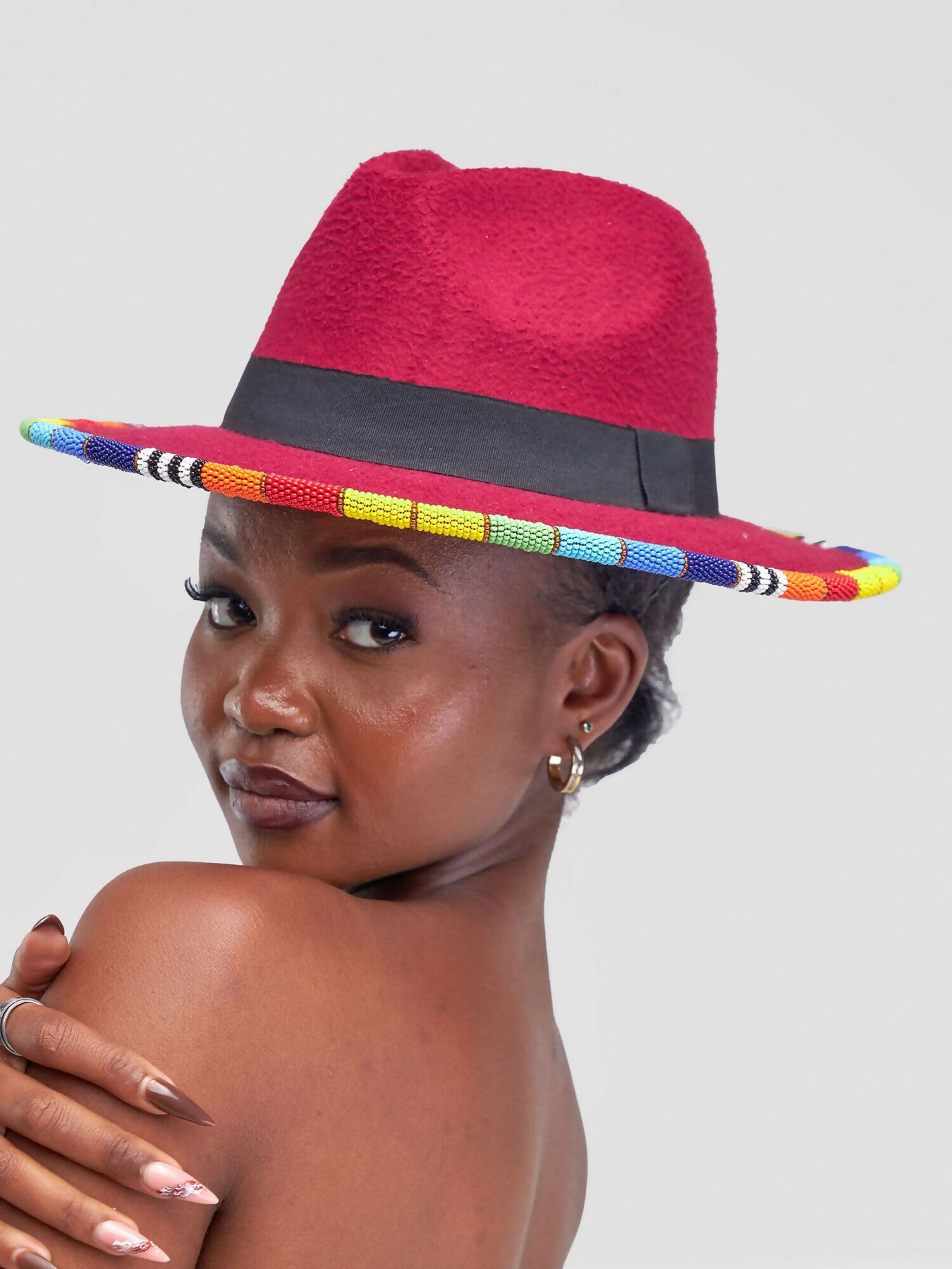 Bold, vibrant, and full of character – this maroon fedora is the perfect accessory for anyone who loves to stand out. Handcrafted from premium felt, it features a sleek black band around the crown and a stunning hand-beaded brim in rainbow colors. Each bead is meticulously strung to bring a touch of African artistry to a timeless design.