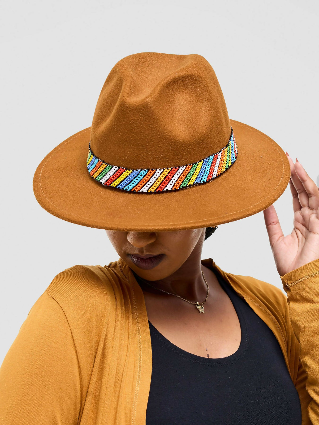 Mustard Brown Fedora with Multicolor Beaded Band