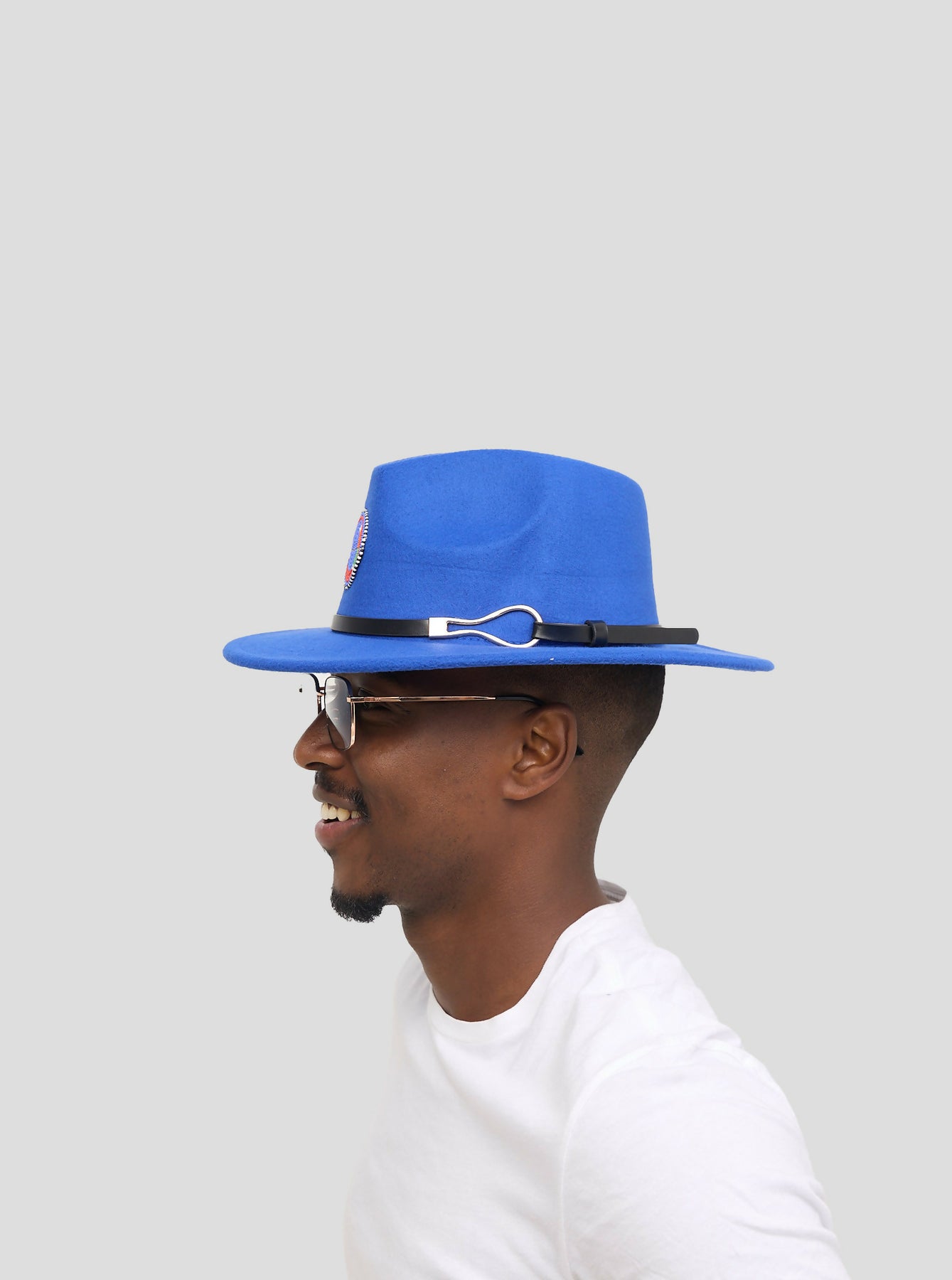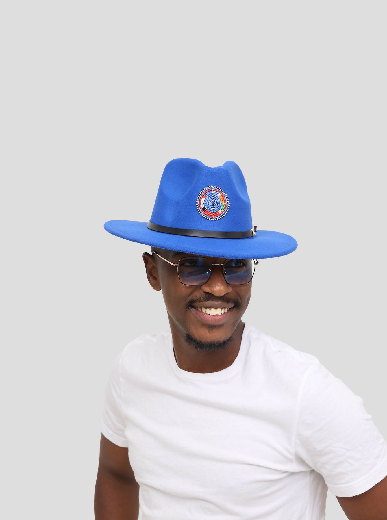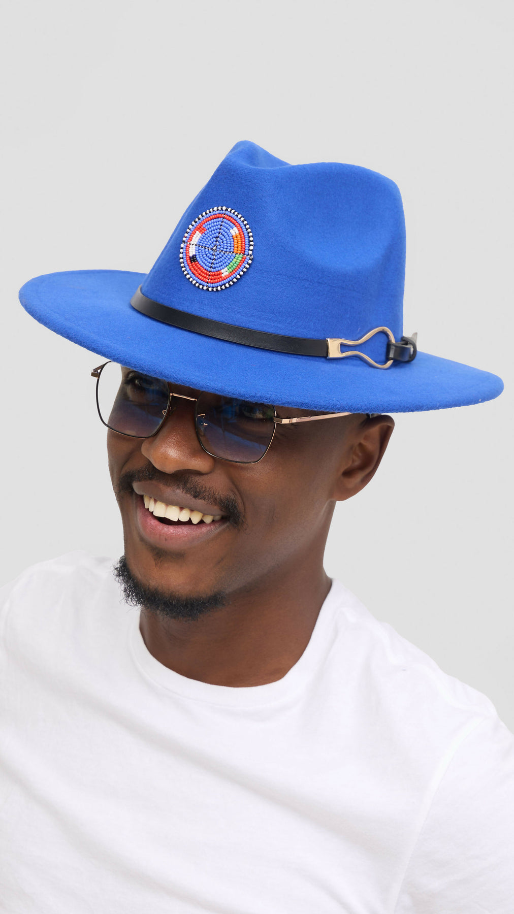 Make a bold style statement with this royal blue fedora, beautifully hand-embellished at the front with a multicolored beaded crown design. The vibrant beadwork adds texture and cultural artistry, while the structured shape keeps your look effortlessly sophisticated — perfect for special occasions, events, or elevating everyday outfits.