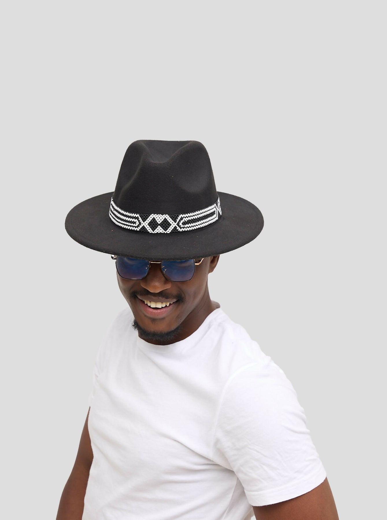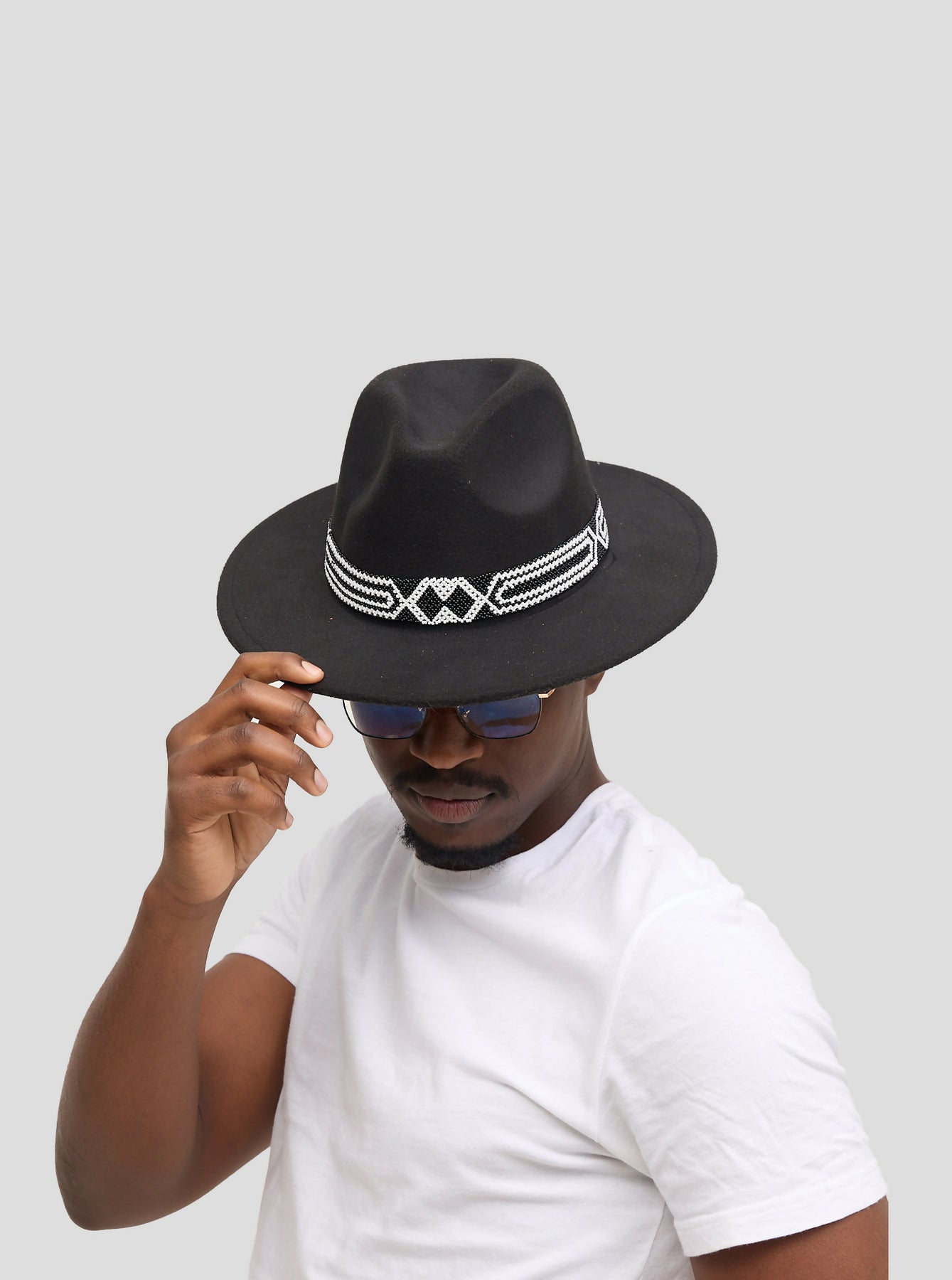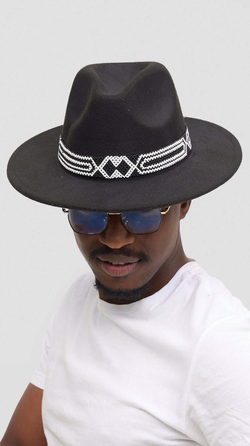 Step into timeless style with this Black Fedora, elevated by a hand-beaded band inspired by African artistry. The bold black-and-white beadwork adds a striking Afrocentric touch, making it a versatile accessory for both everyday wear and special occasions.