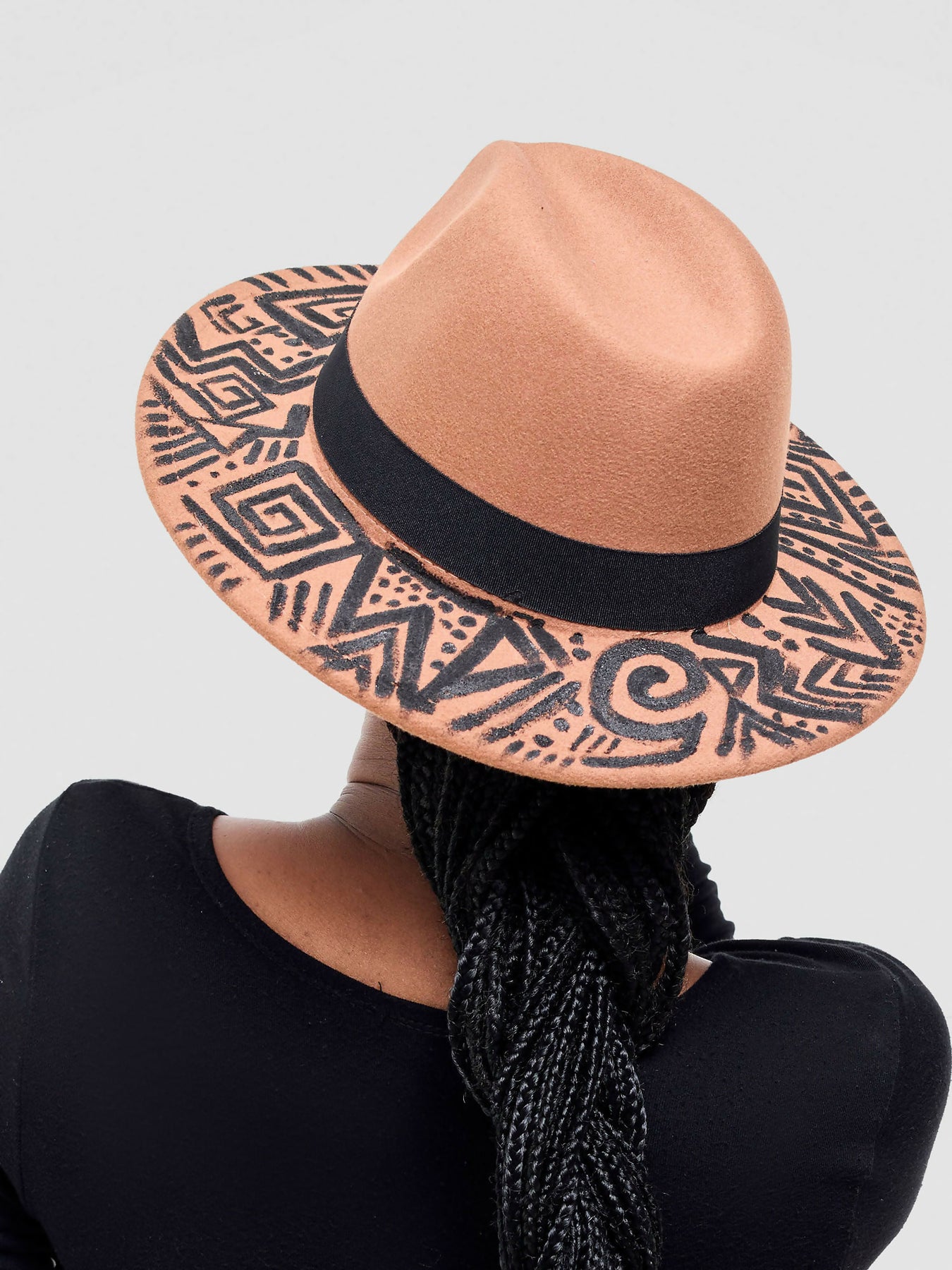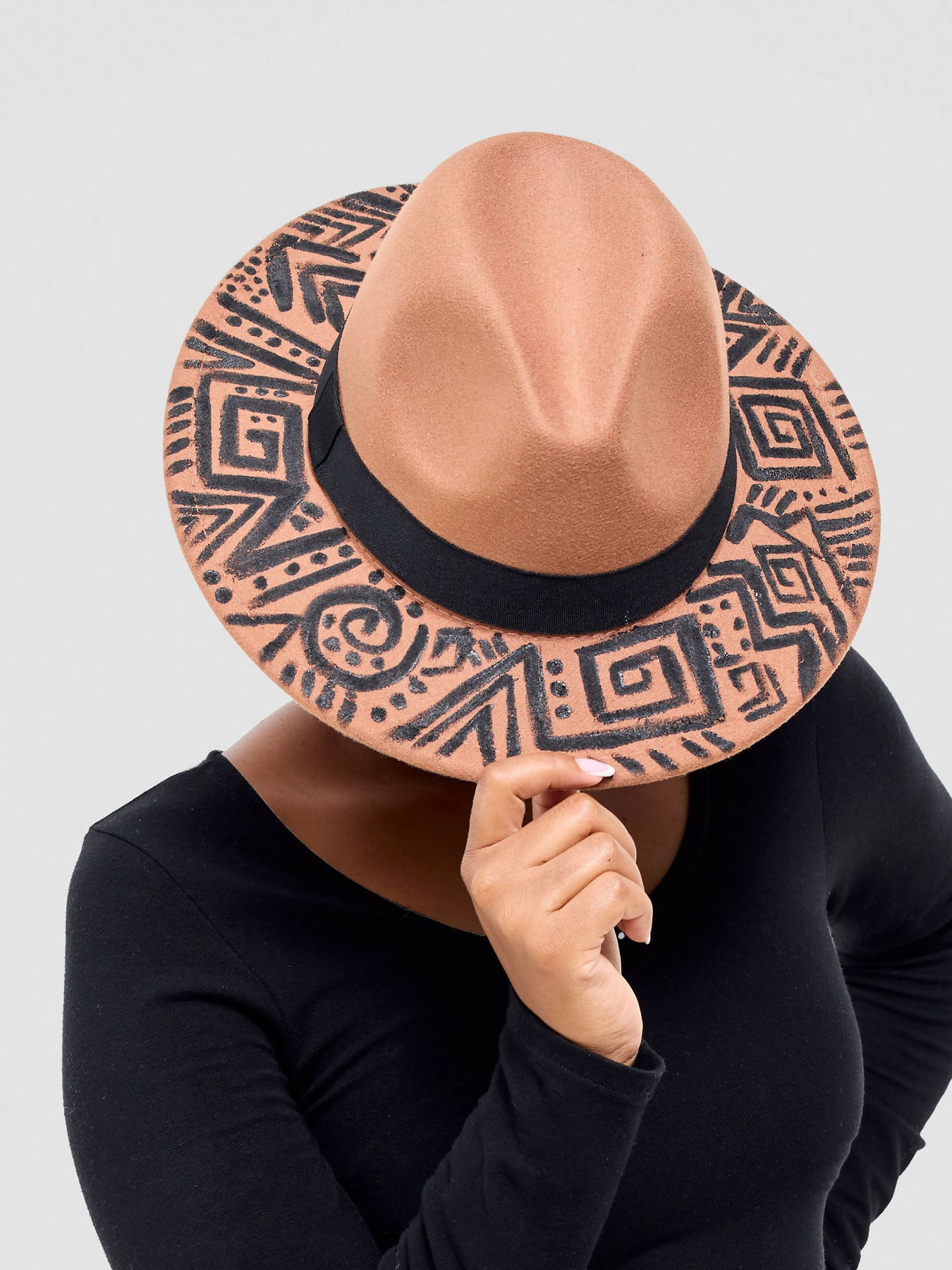 Elevate your style with this hand-painted heritage-inspired fedora. Crafted from premium beige felt, it features bold black tribal motifs meticulously painted along the brim, celebrating culture and individuality. The sleek black band adds a classic touch, making it versatile for both casual and statement looks.