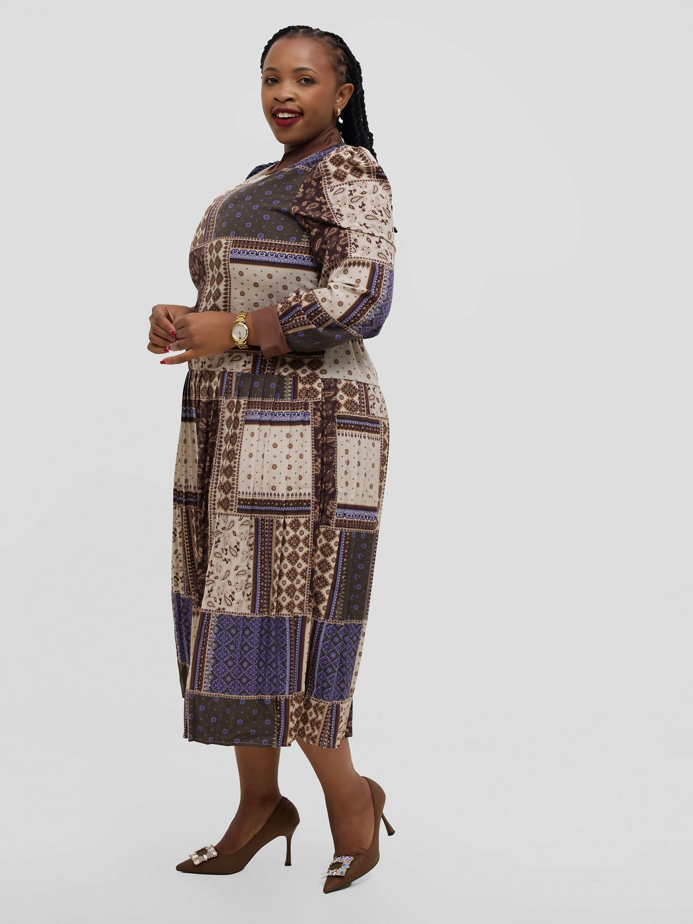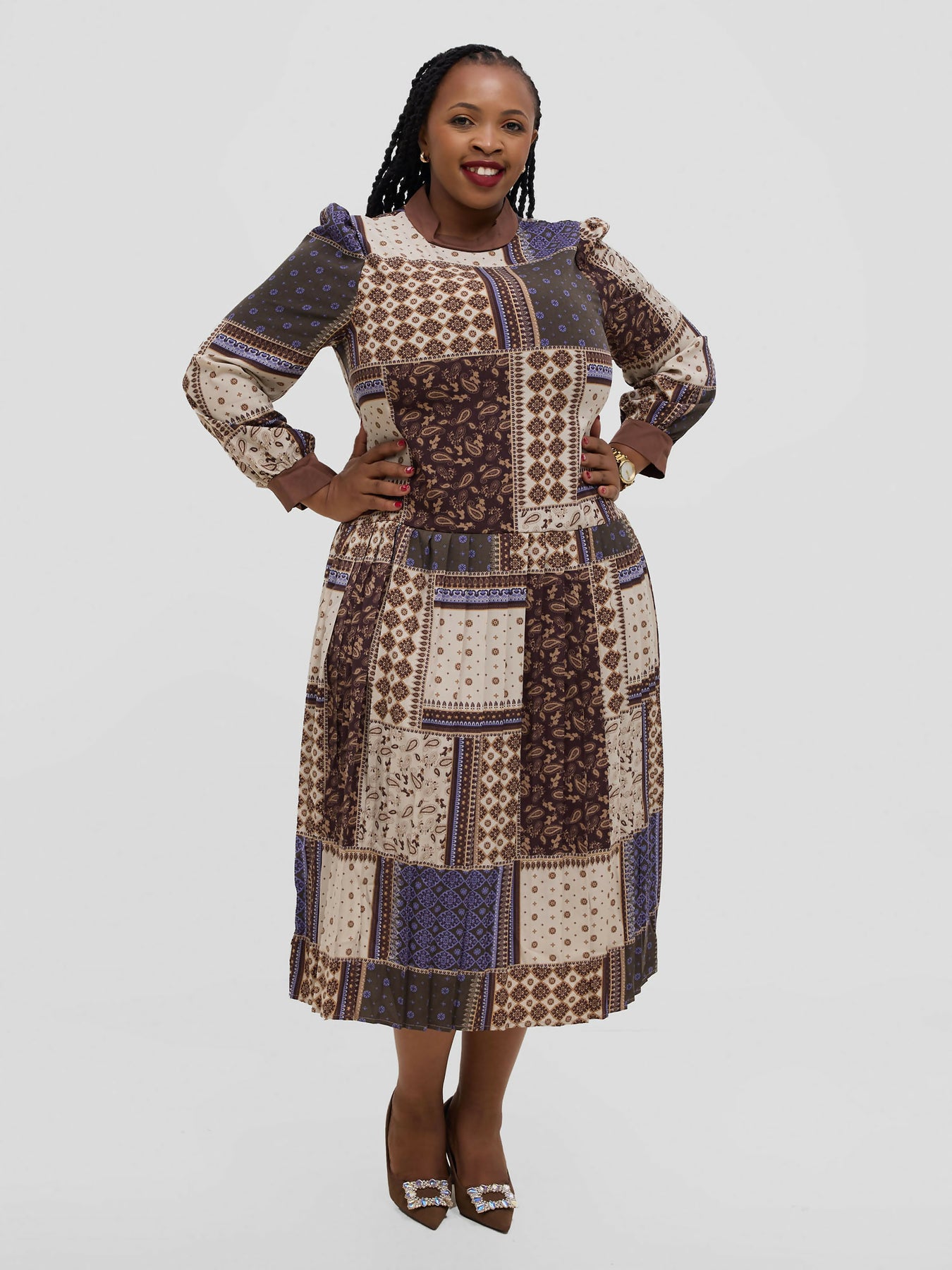 Hessed Floral Long Sleeve Pleated Dress - Brown
