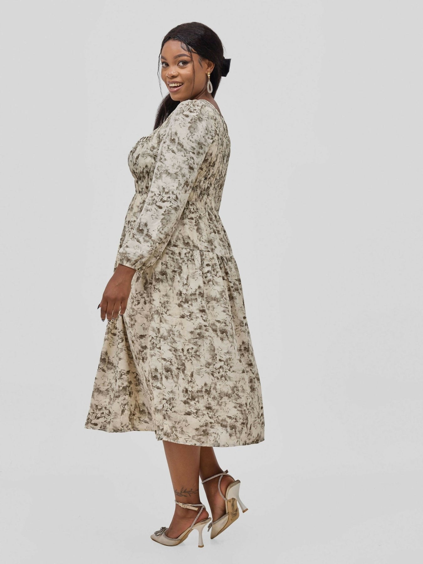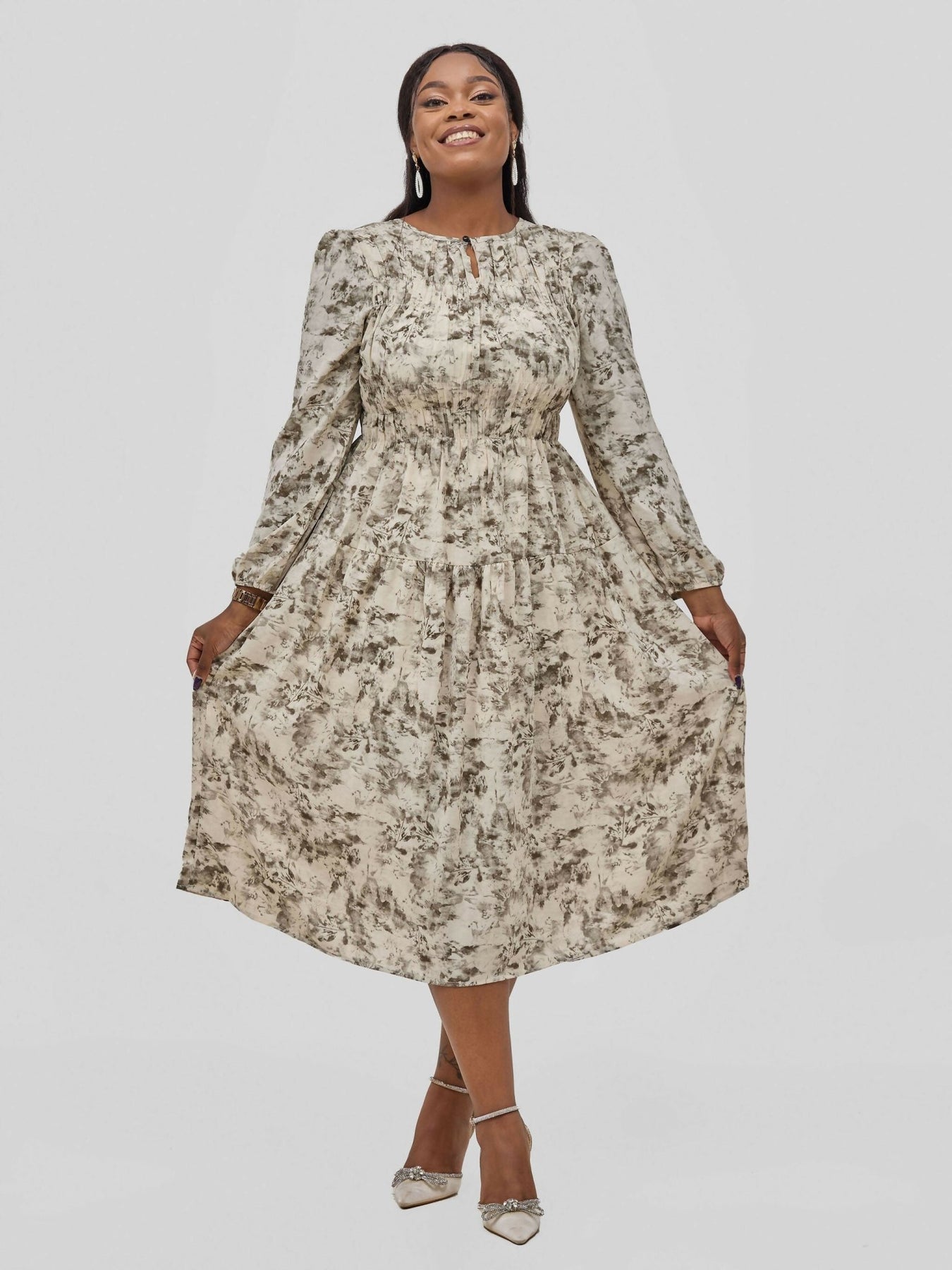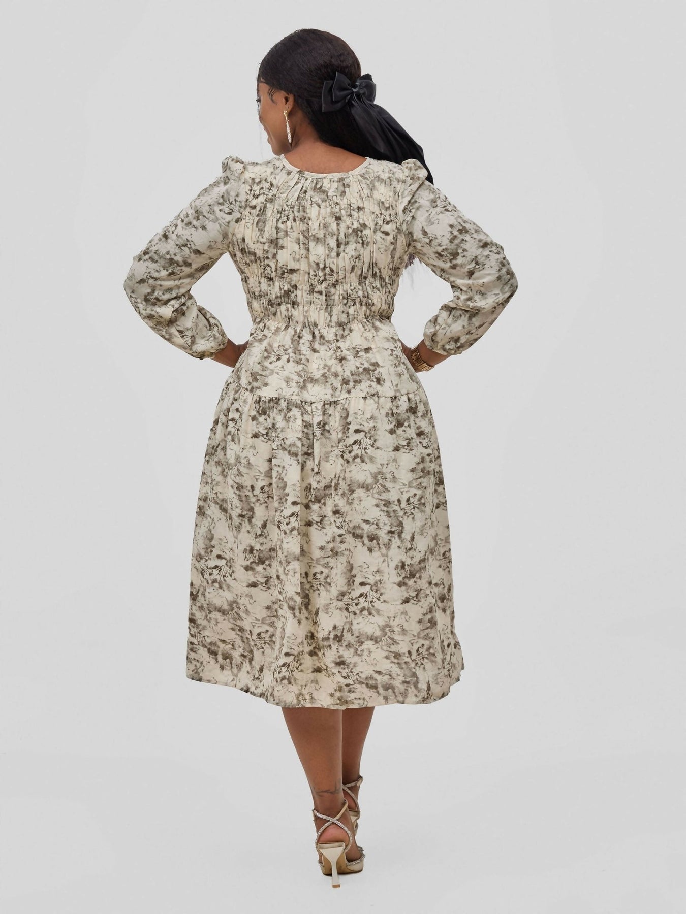 Hessed Floral Prints A Line Round Neck One Buttoned Dress - Beige - Shopzetu