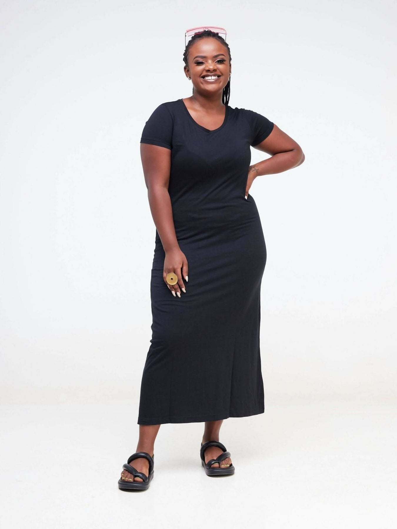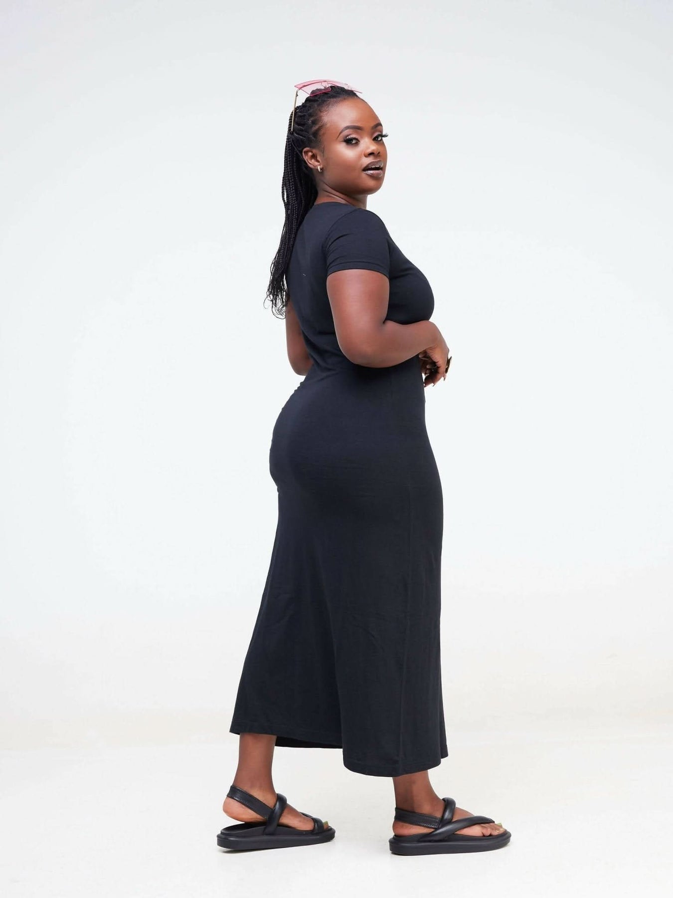 Hessed Sleeved Midi Plain Dress - Black - Shopzetu