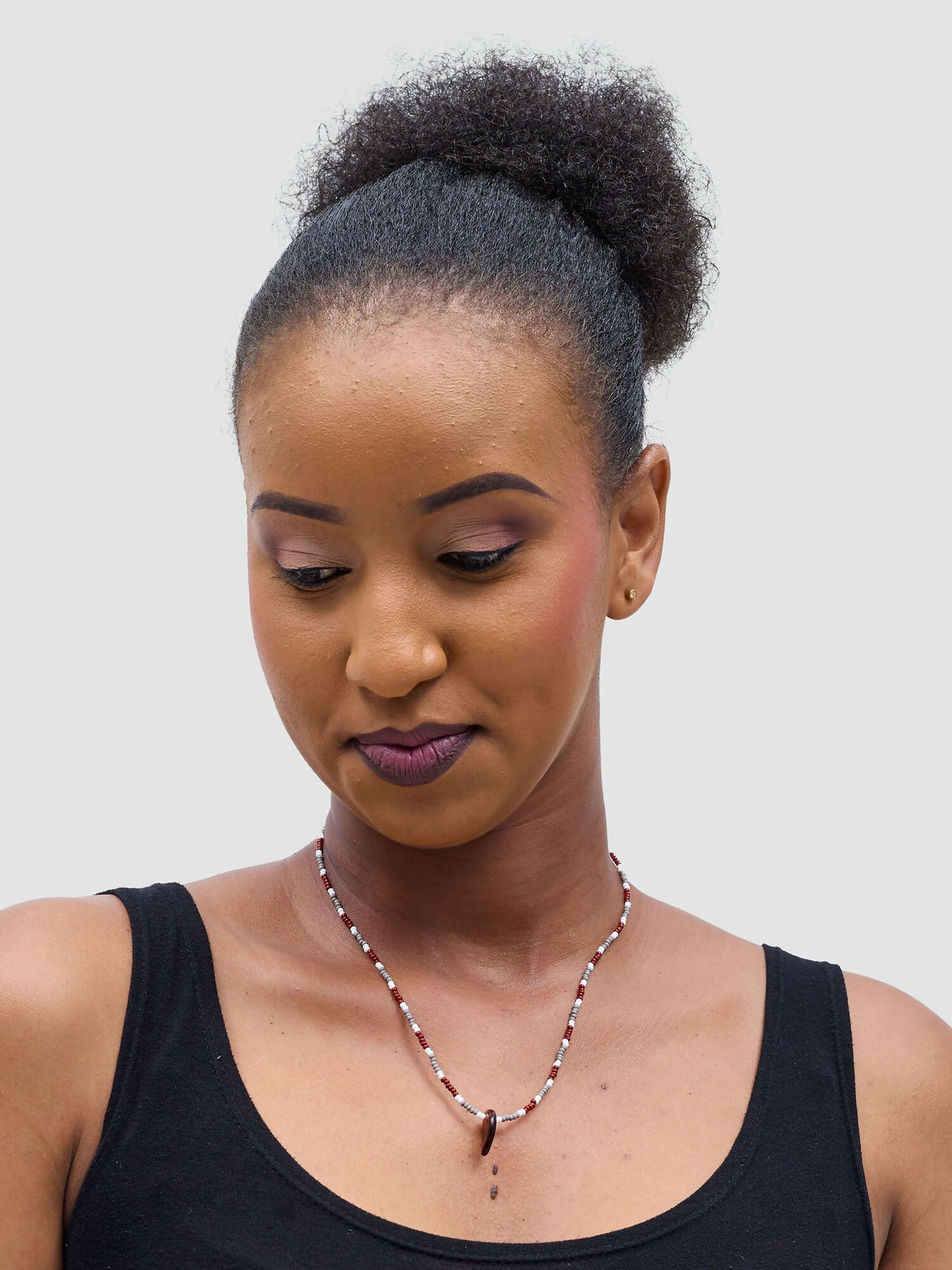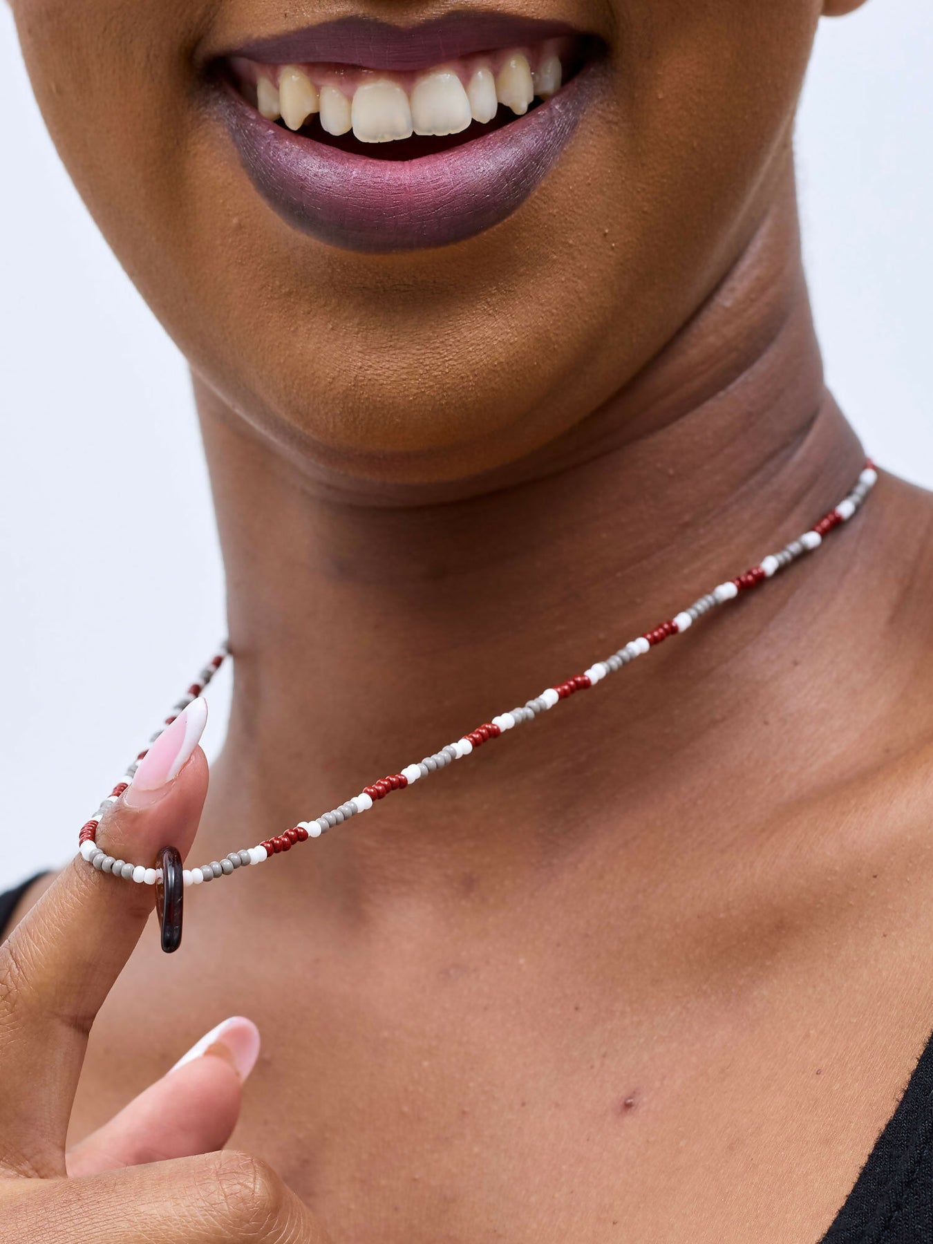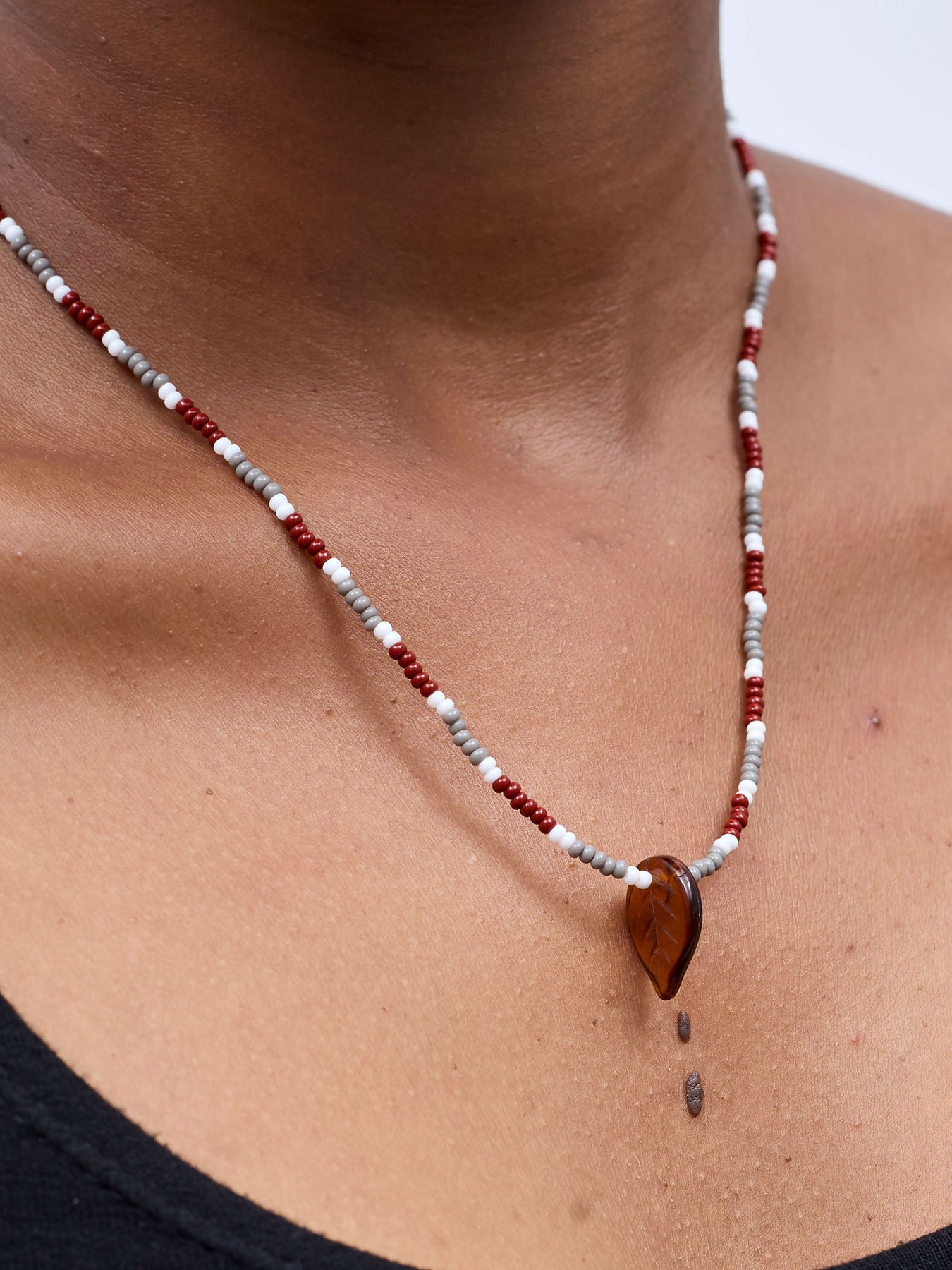Elegant and earthy, this necklace combines white, red, and gray seed beads with a delicate amber-colored leaf-shaped pendant. A subtle yet meaningful accessory perfect for everyday wear.