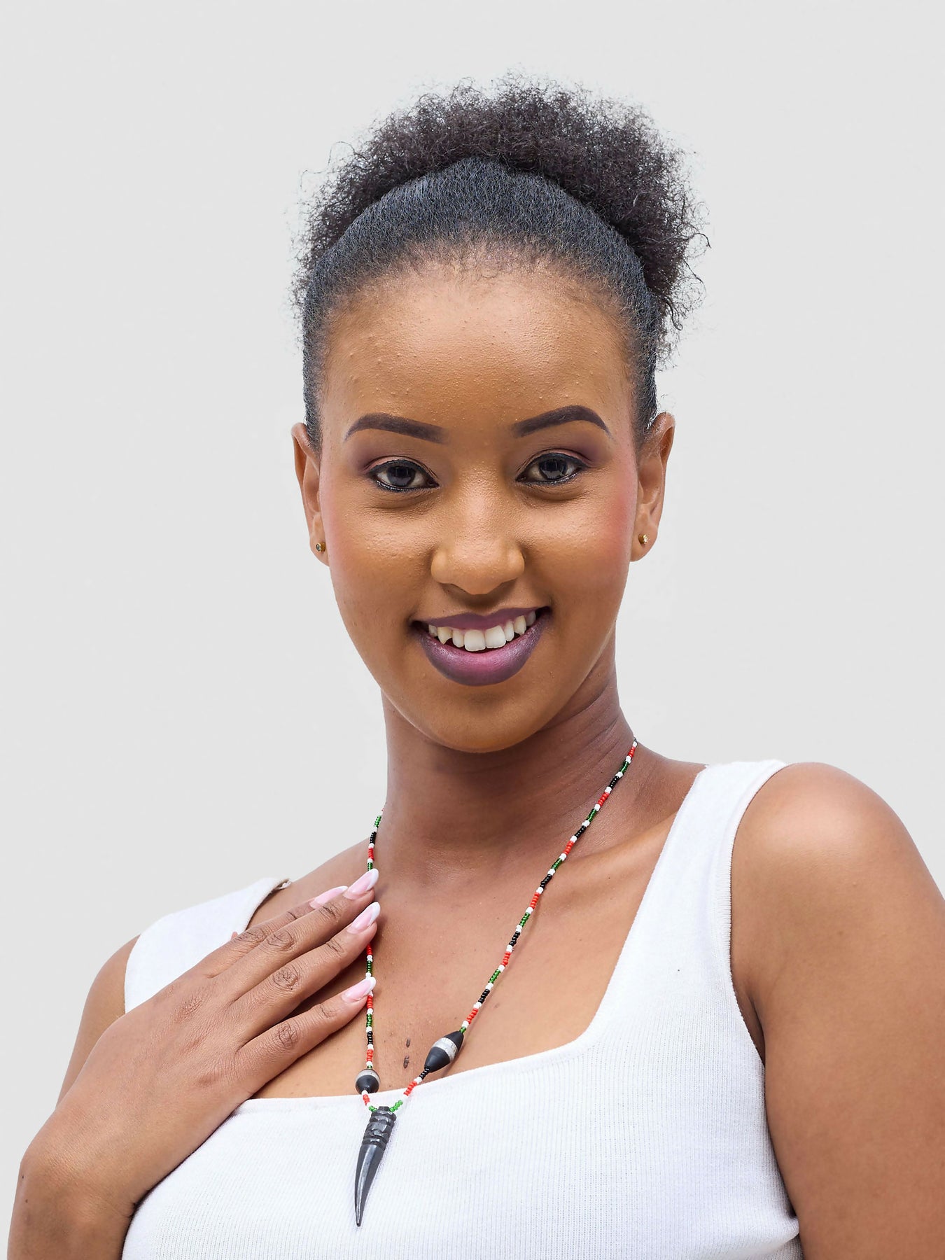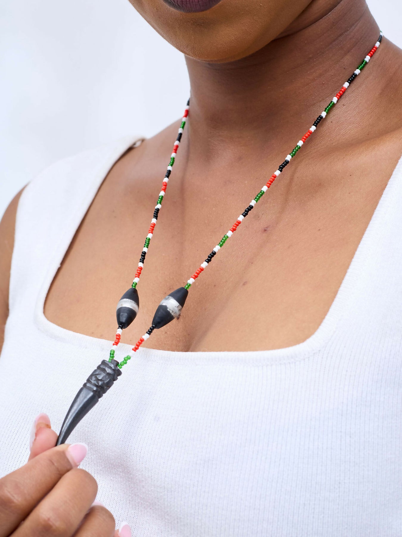 Vibrant and bold, this necklace features a mix of red, green, black, and white seed beads, accented with two large oval beads and a carved horn-shaped pendant. A standout piece with a cultural and handcrafted touch.