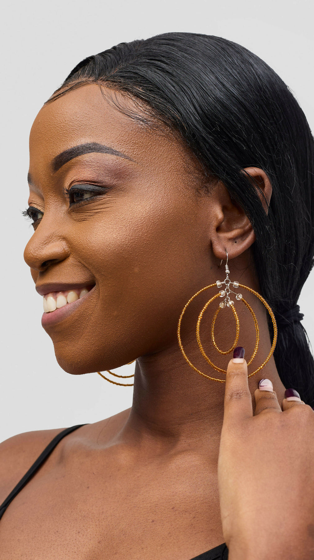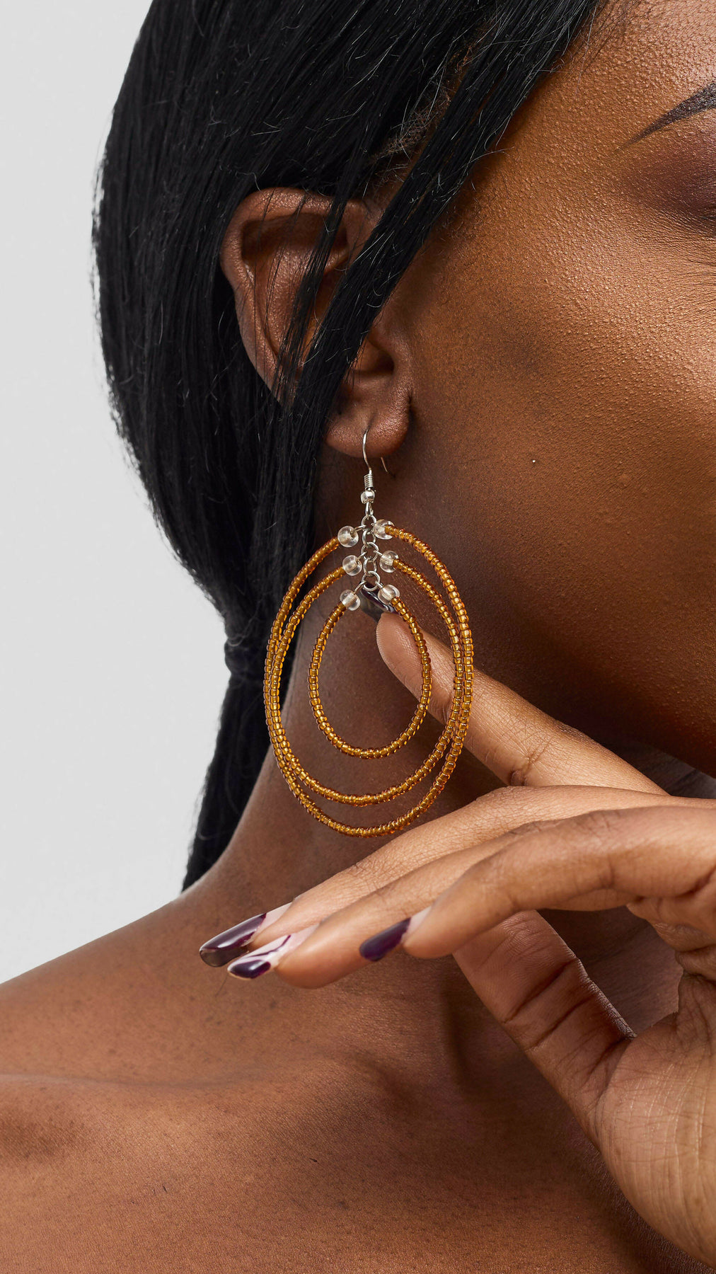 Elevate your look with these bold handcrafted beaded earrings. Featuring two concentric hoops adorned with intricate golden seed beads, the design is highlighted by a striking round detail at the center. Lightweight yet statement-making, these earrings blend cultural artistry with modern style—perfect for casual wear or dressing up your evening look.