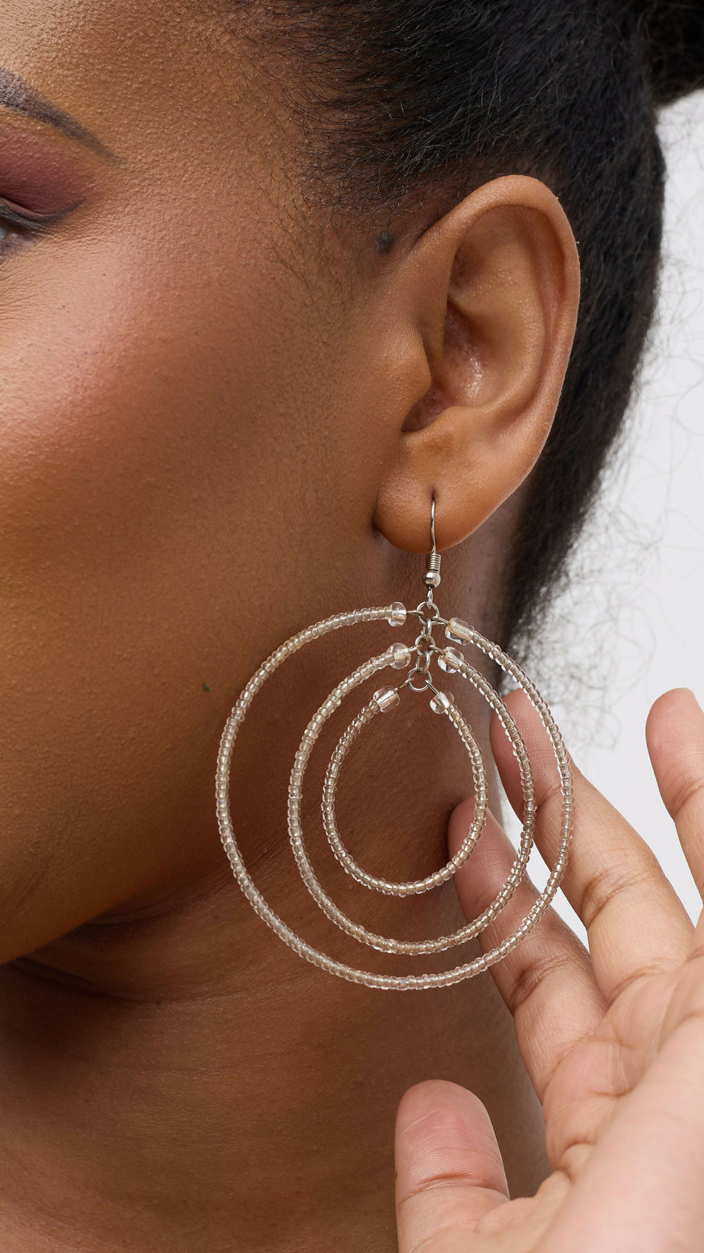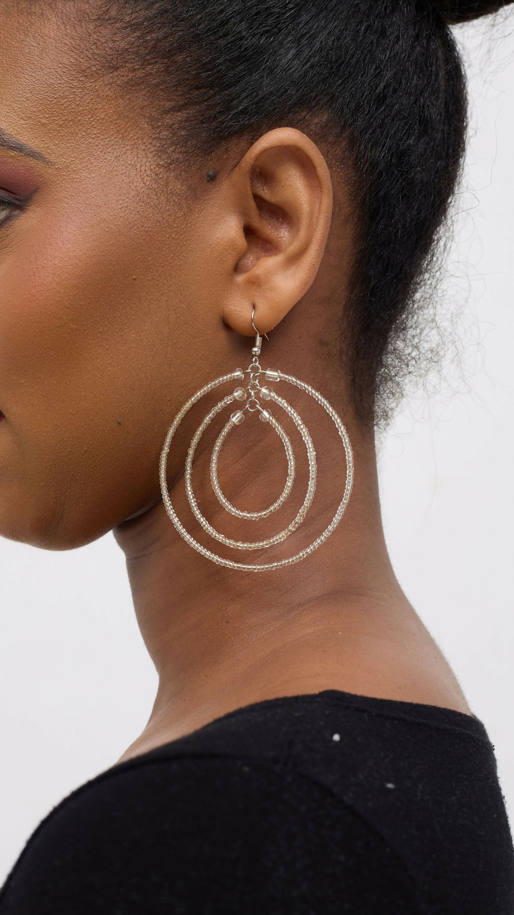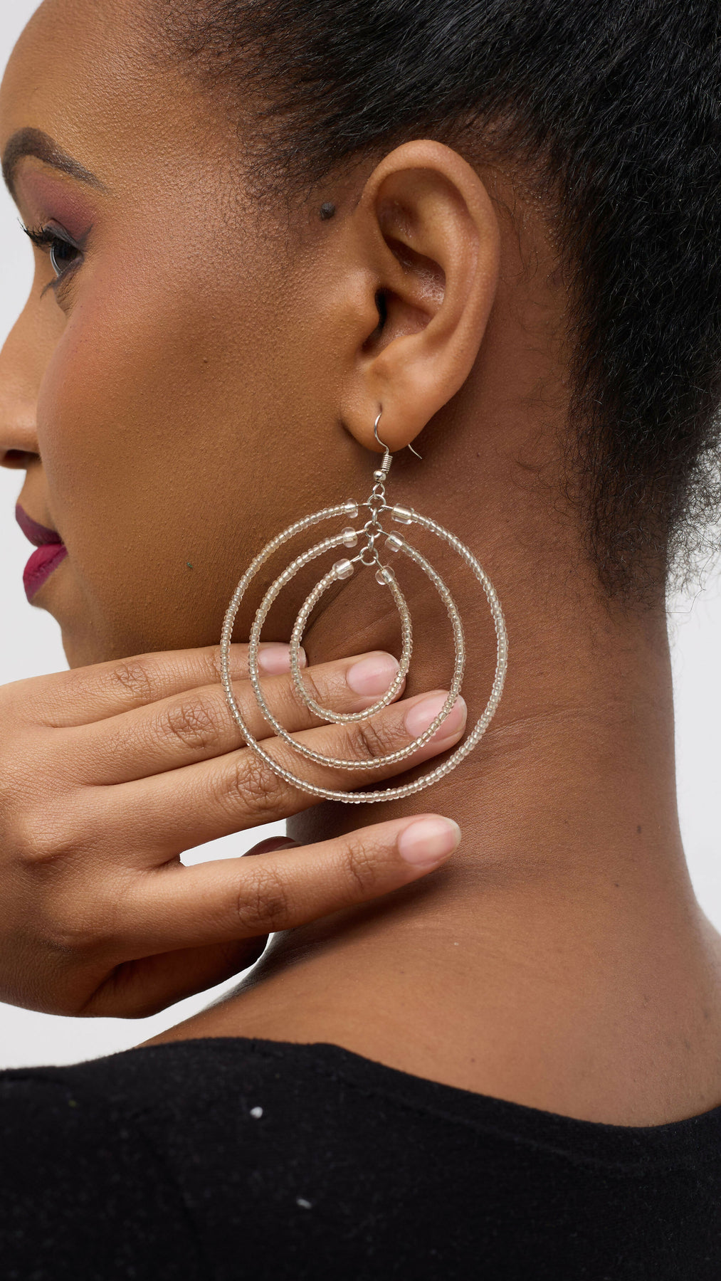 Elevate your look with these bold handcrafted beaded earrings. Featuring two concentric hoops adorned with intricate silver seed beads, the design is highlighted by a striking round detail at the center. Lightweight yet statement-making, these earrings blend cultural artistry with modern style—perfect for casual wear or dressing up your evening look.