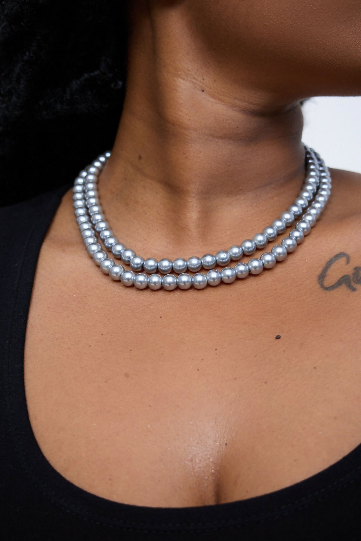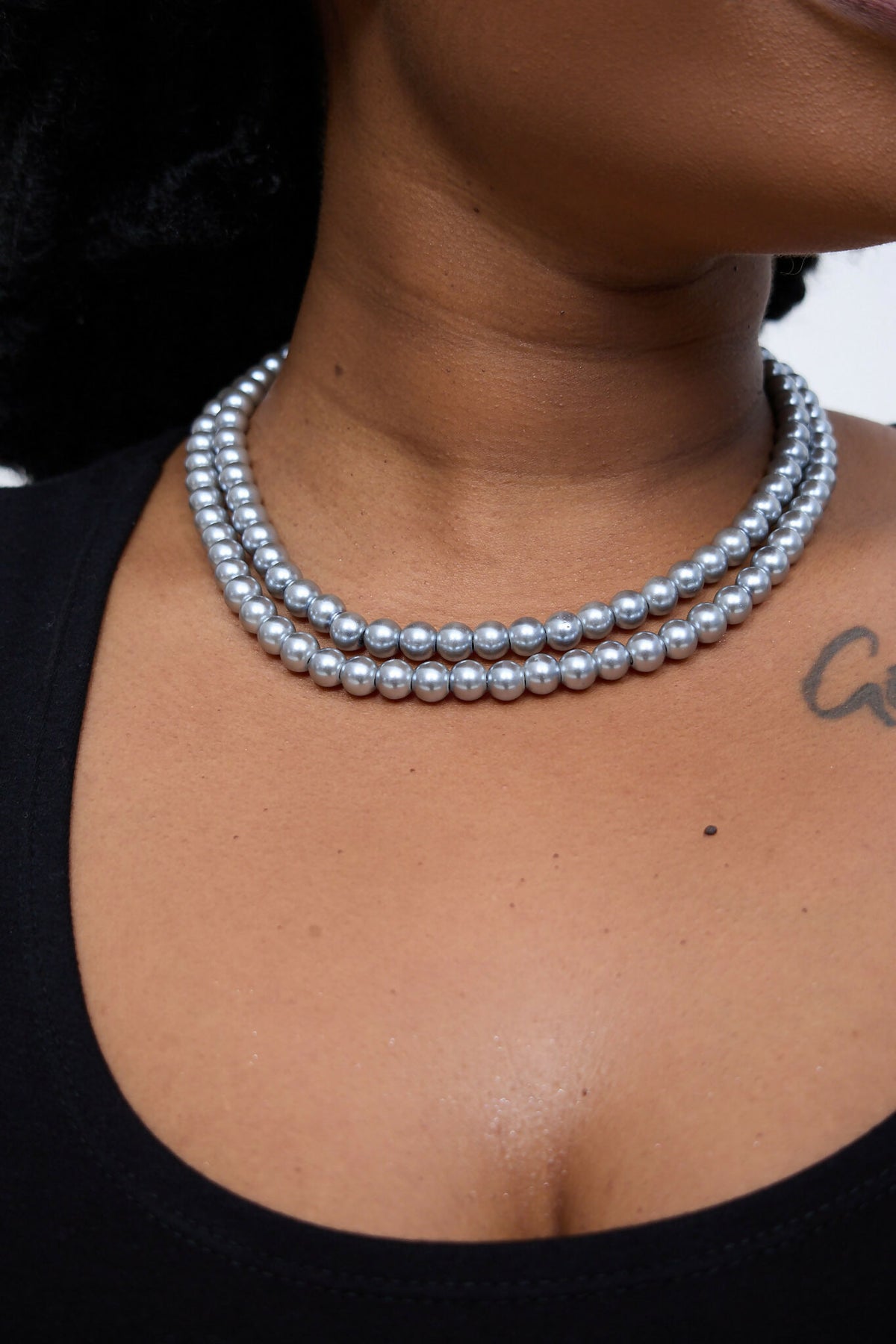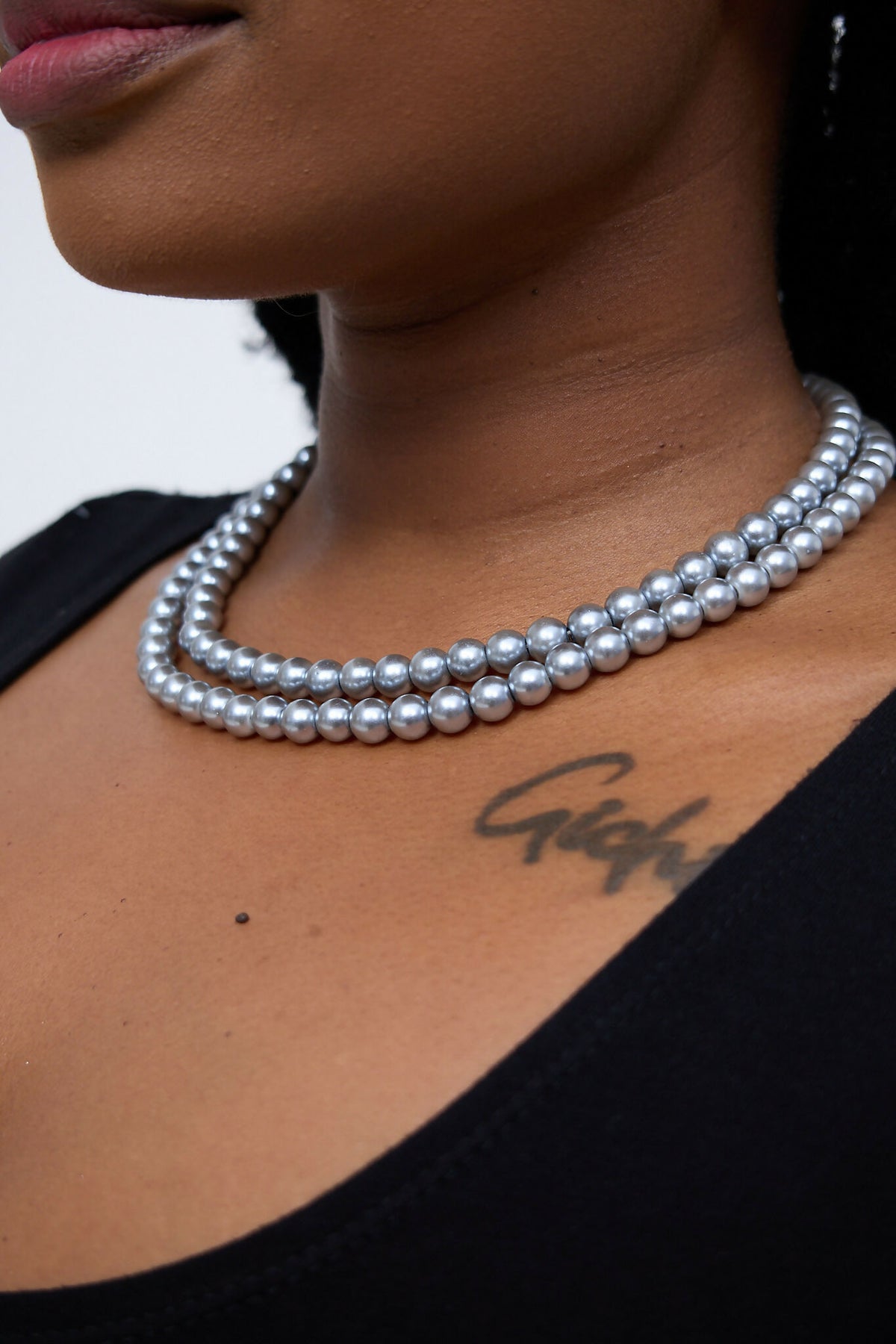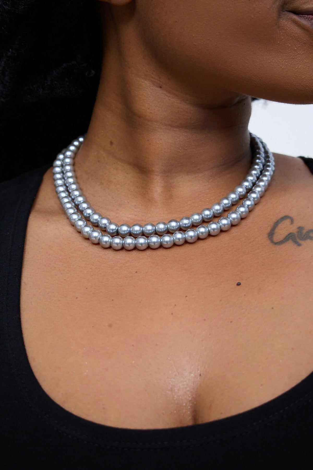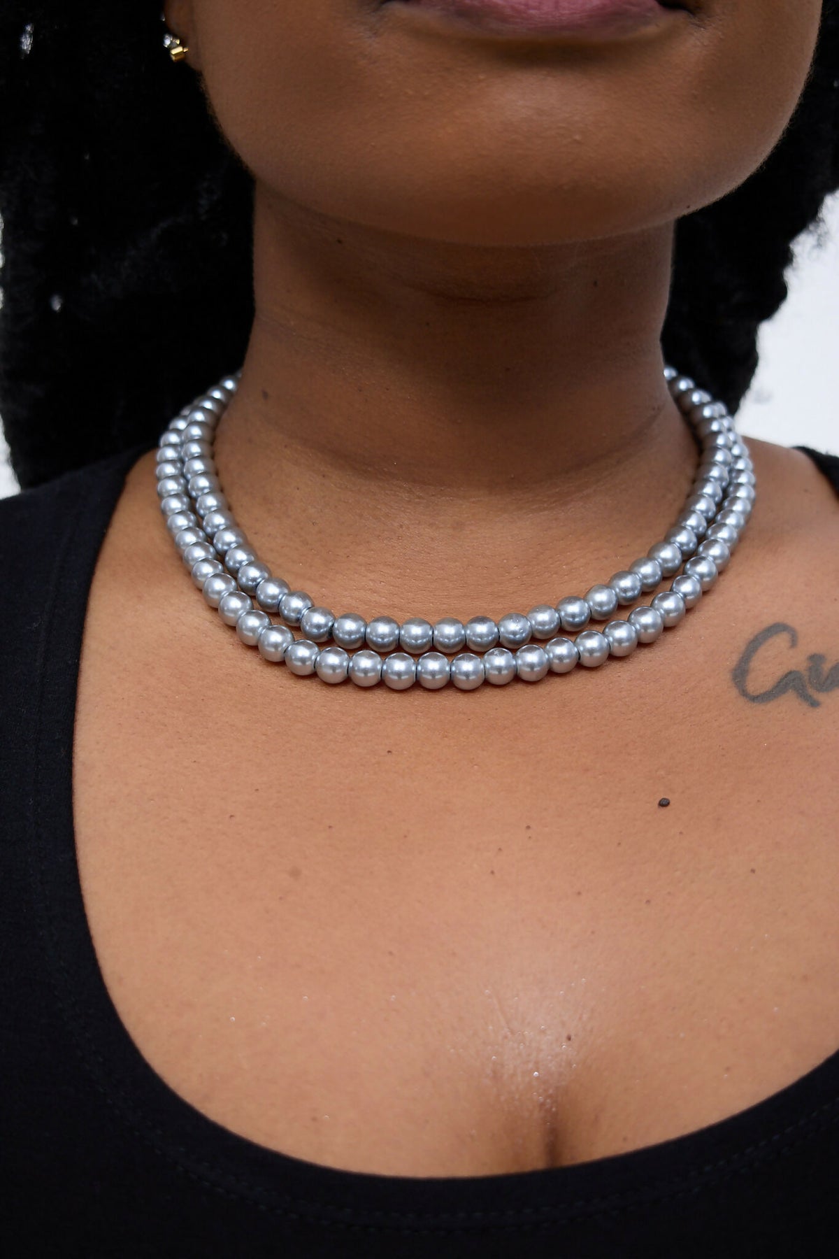 Description: This elegant double-strand necklace features two rows of lustrous, silver-toned pearls. The classic design adds a touch of sophistication to any outfit, making it perfect for both formal occasions and everyday wear. The pearls have a smooth, polished finish and are arranged to sit gracefully around the neck.