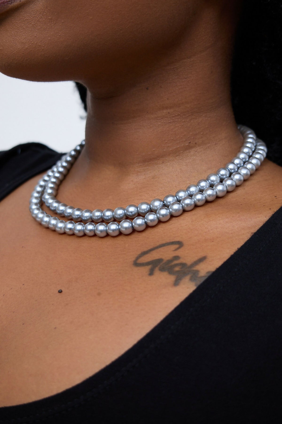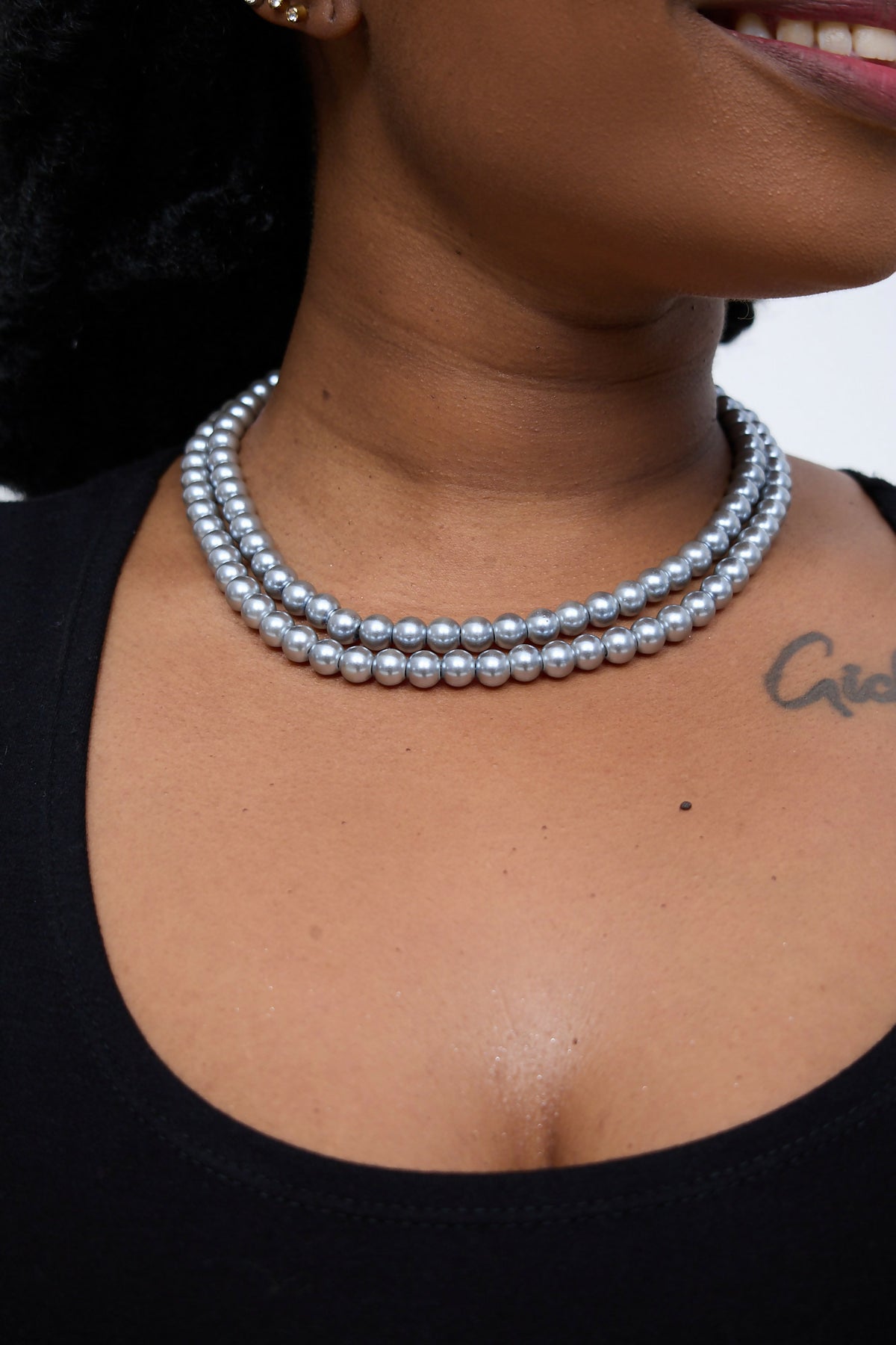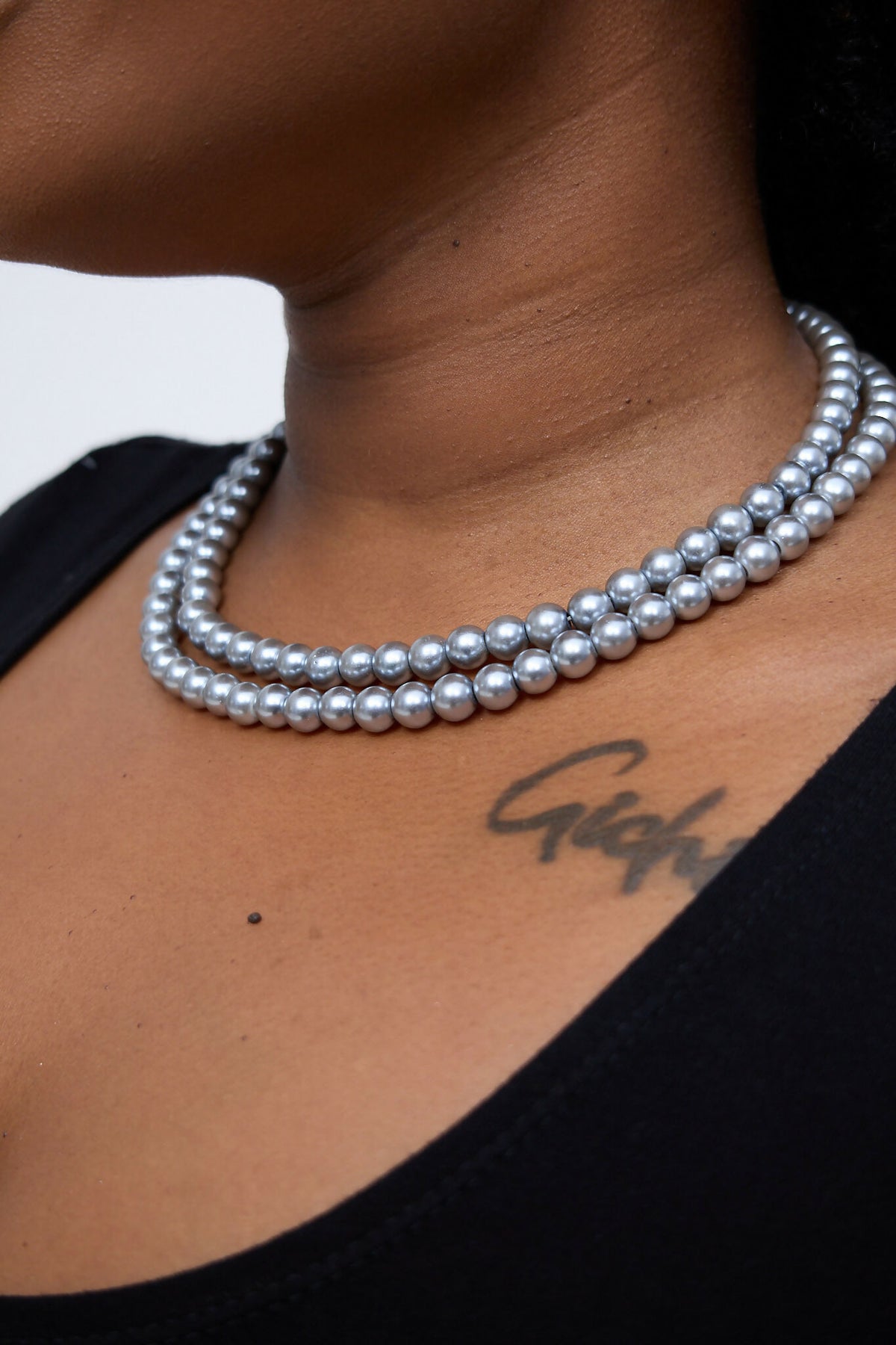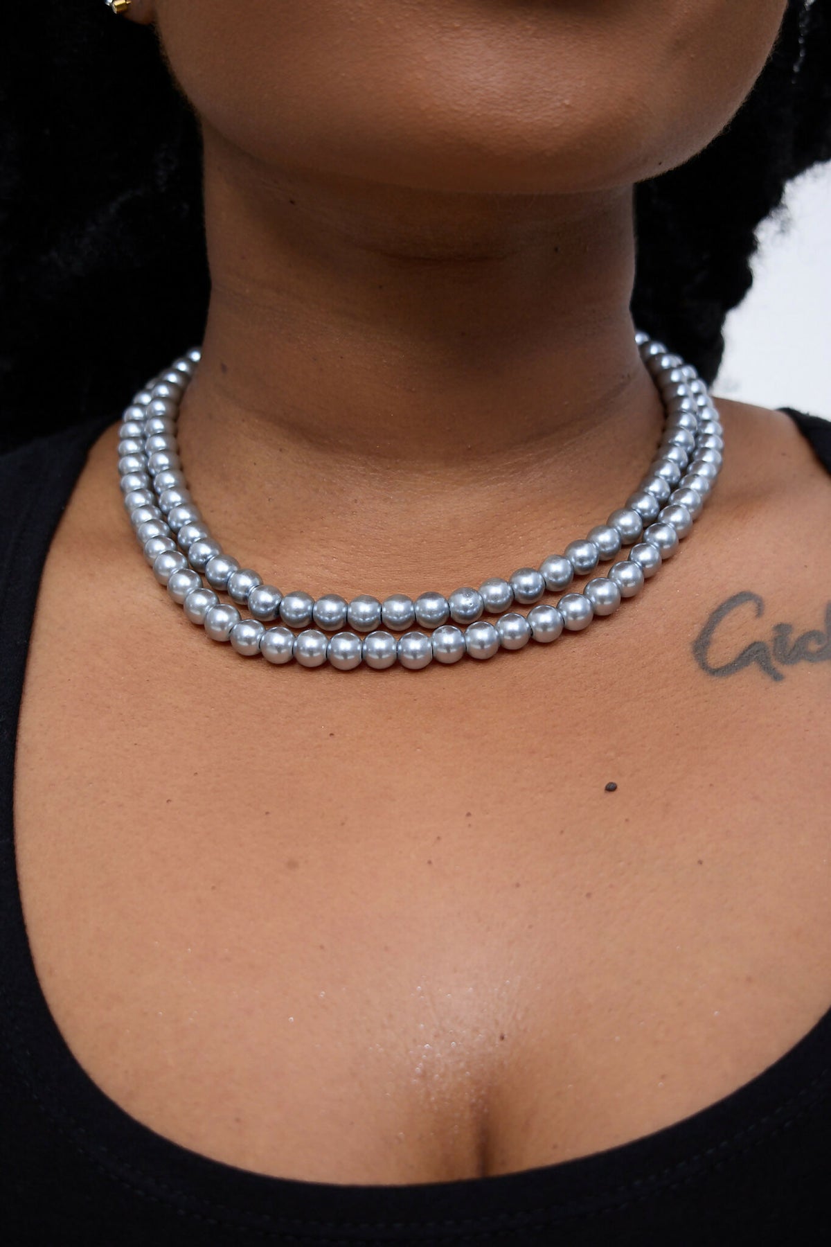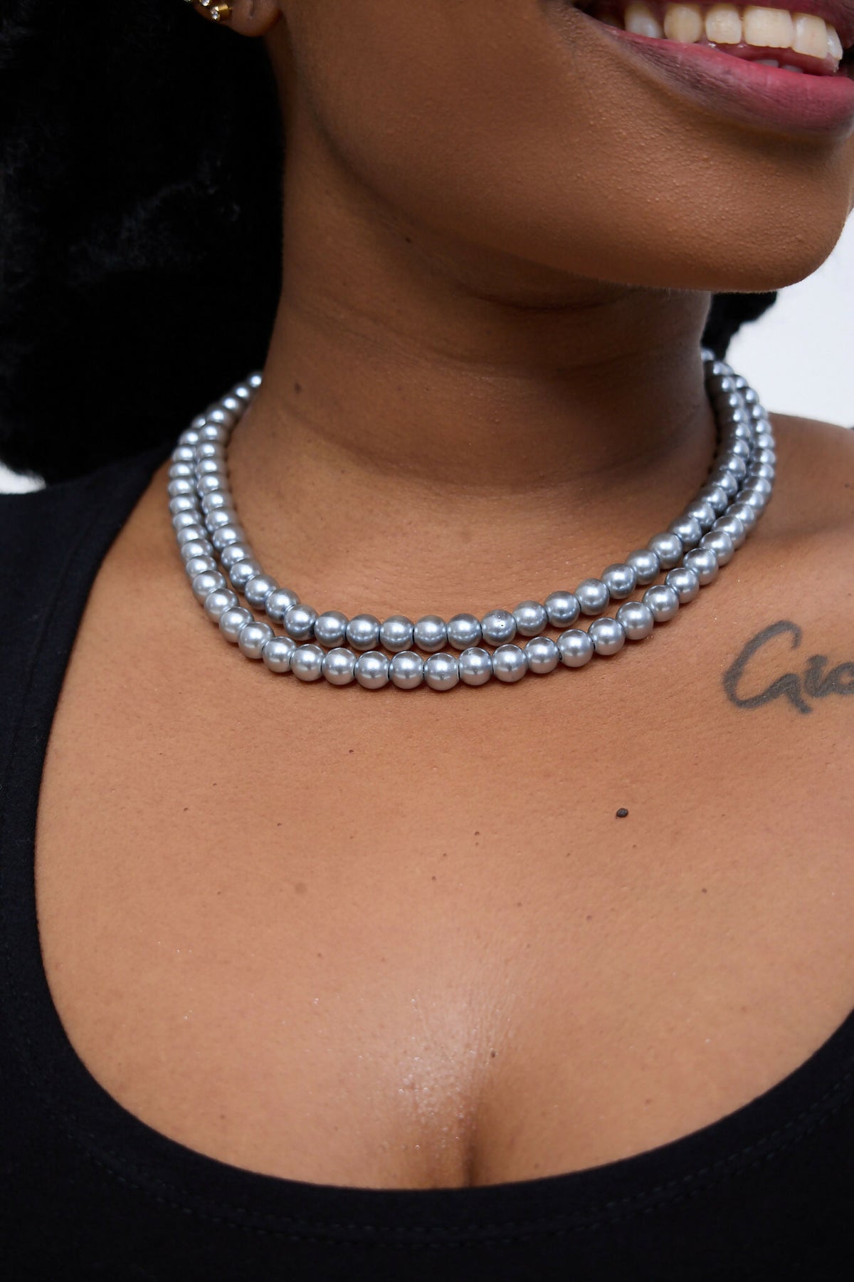 Description: This elegant double-strand necklace features two rows of lustrous, silver-toned pearls. The classic design adds a touch of sophistication to any outfit, making it perfect for both formal occasions and everyday wear. The pearls have a smooth, polished finish and are arranged to sit gracefully around the neck.