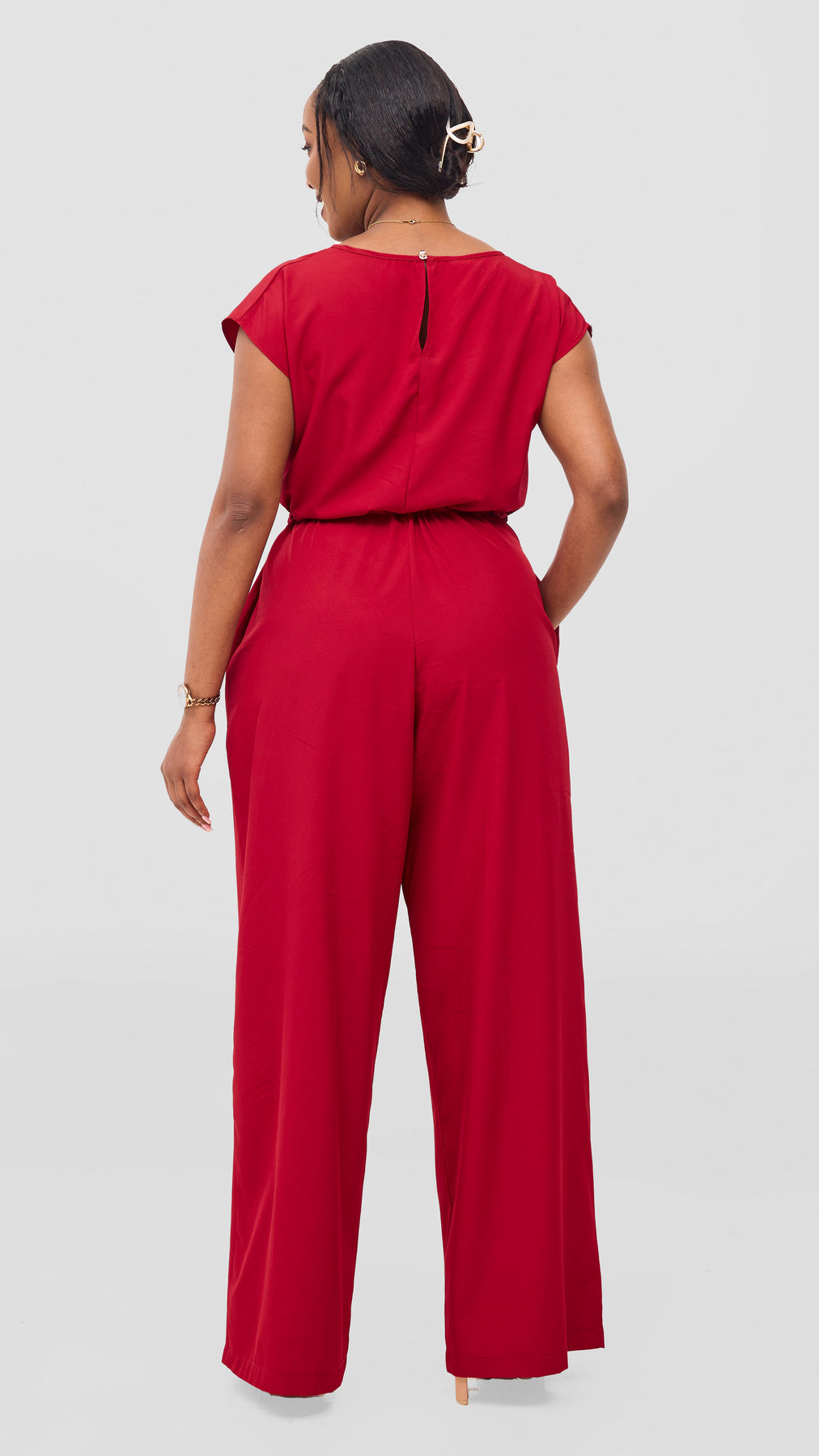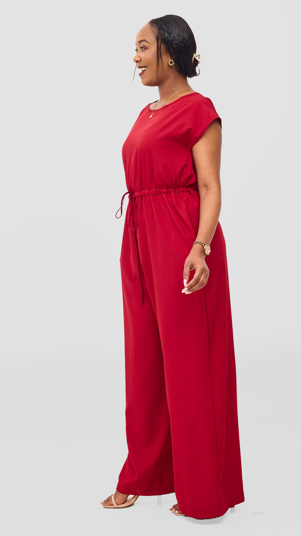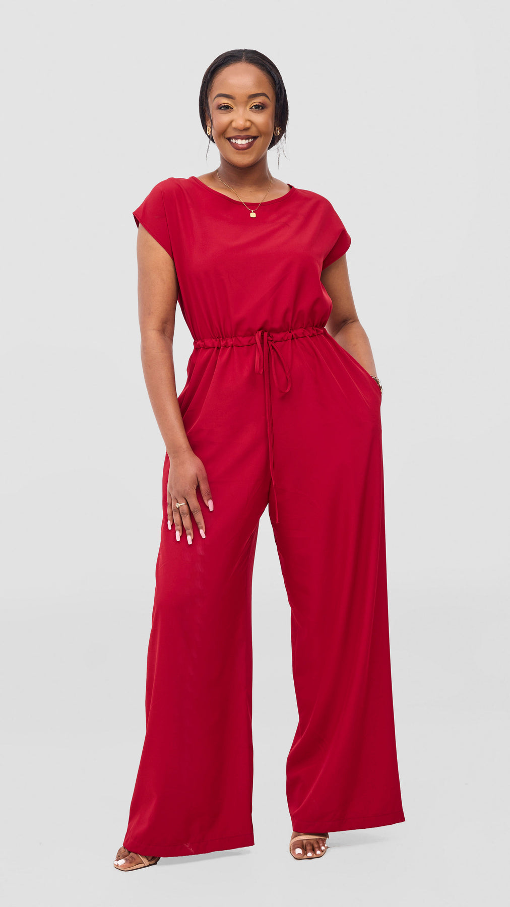 The Vivo Sakari Drop Shoulder Jumpsuit in dark red offers a relaxed fit and adjustable drawstrings for personalized comfort. Its versatile design lets you dress it up for outings or keep it casual for everyday wear, making it a reliable and stylish addition to your wardrobe.