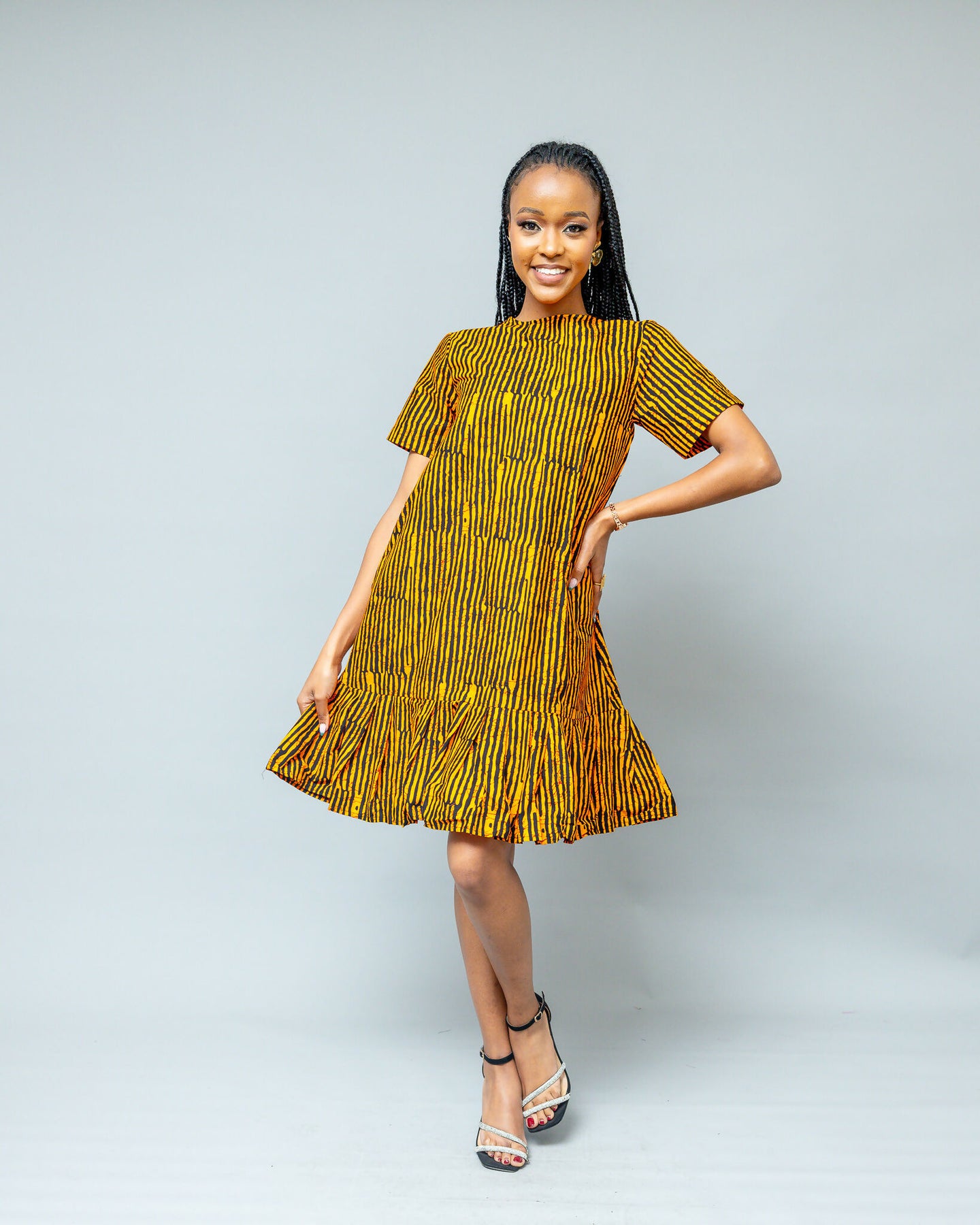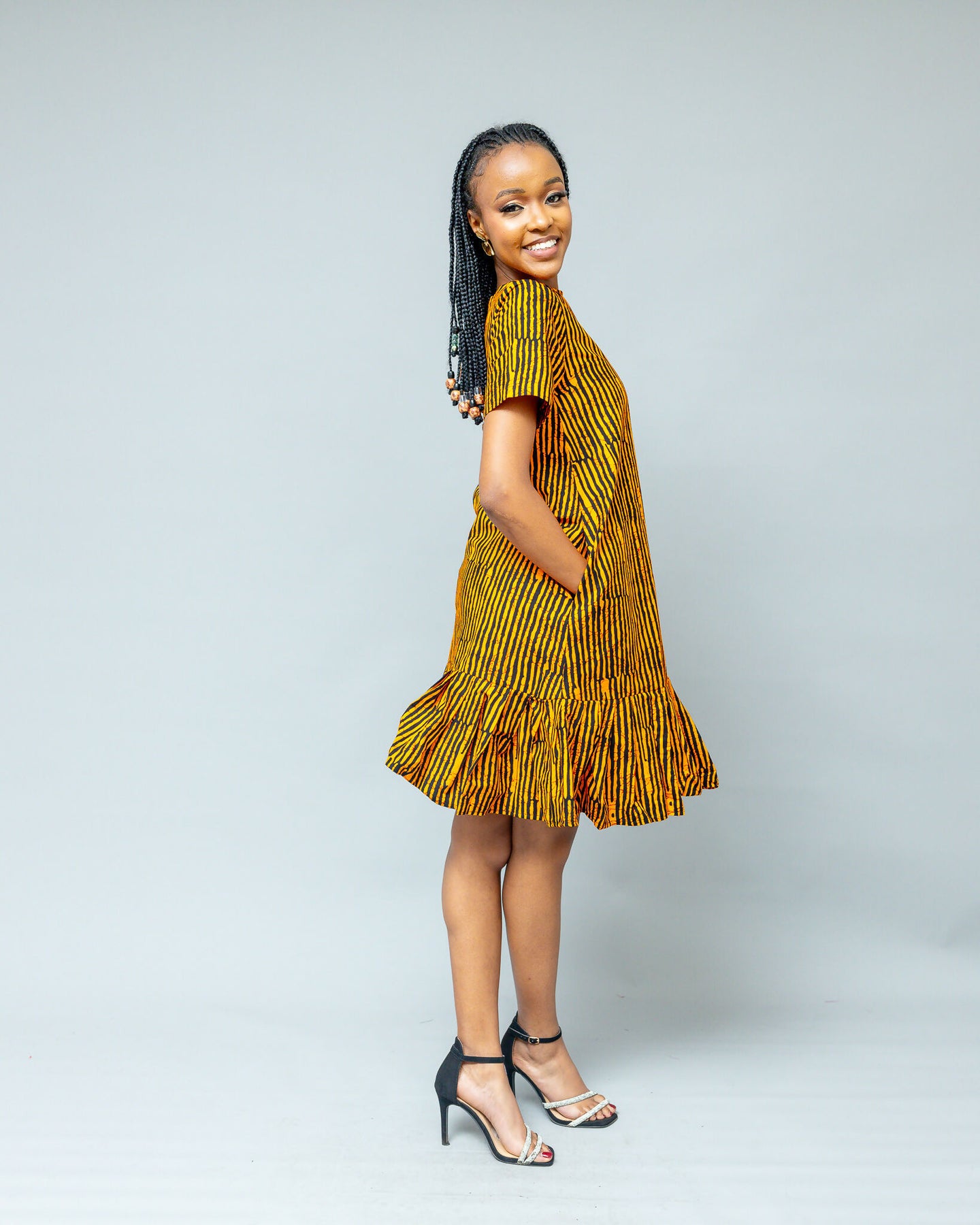 Crafted from breathable cotton Ankara fabric, it features striking vertical stripes that elongate the frame, while the flared ruffle hem adds a flirty, feminine touch. The round neckline and short sleeves keep it classic, making it a timeless piece you’ll reach for again and again.