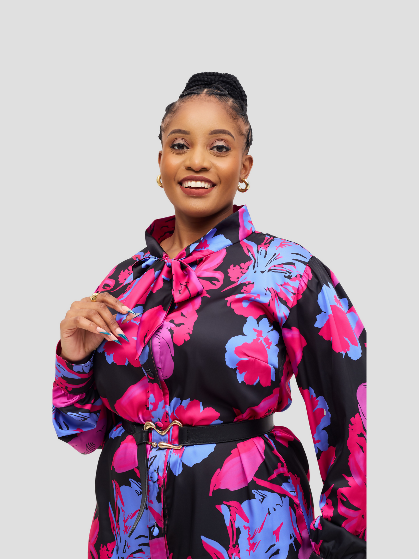 Product Details: Button-down dress featuring charming bottom ruffle details and a knee-length silhouette. Designed with long sleeves and sophisticated cuff accents, complemented by an elegant long necktie for a touch of refined style.