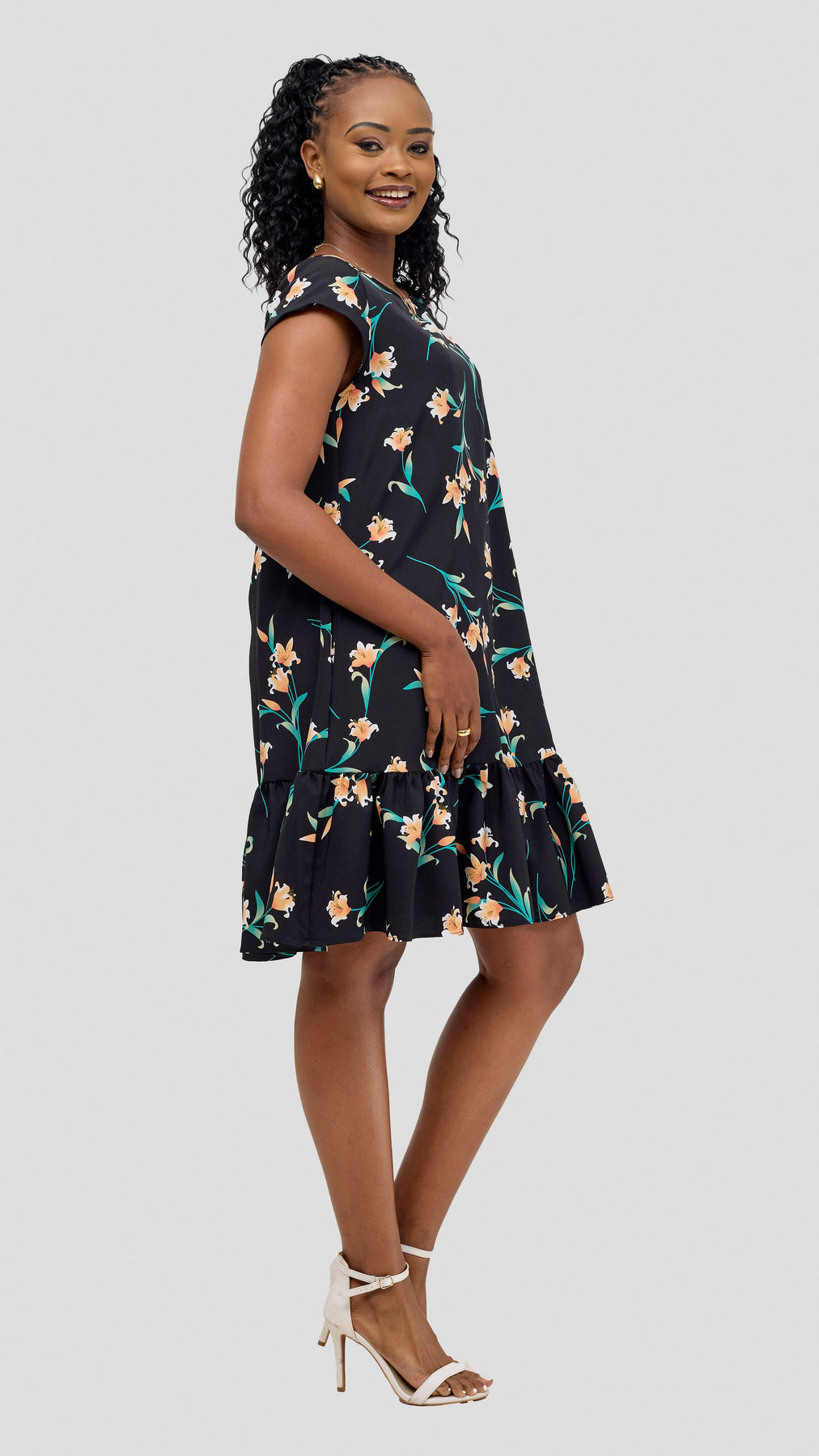 This Vivo Dalia dress features cap sleeves and a gathered waist for a flattering fit. Its knee-length design combines elegance and comfort, while the black base with peach print adds a soft, feminine touch. Ideal for both casual outings and special occasions, this dress supports your style with ease and grace.