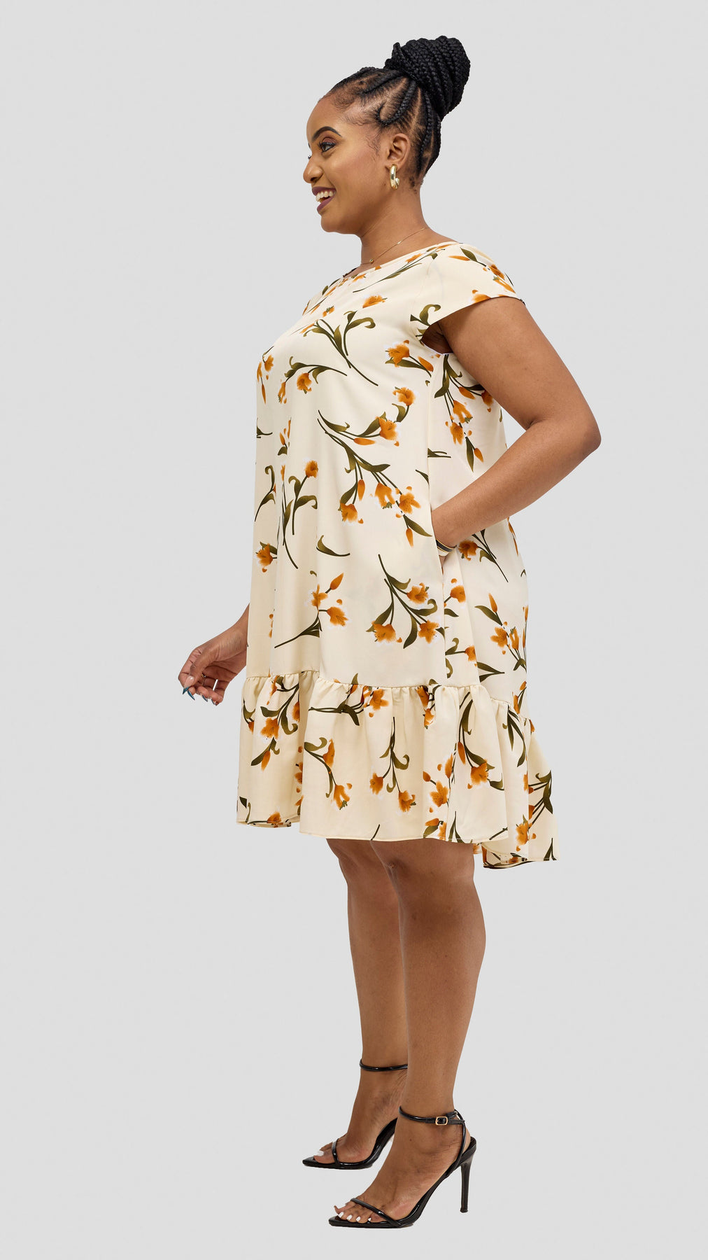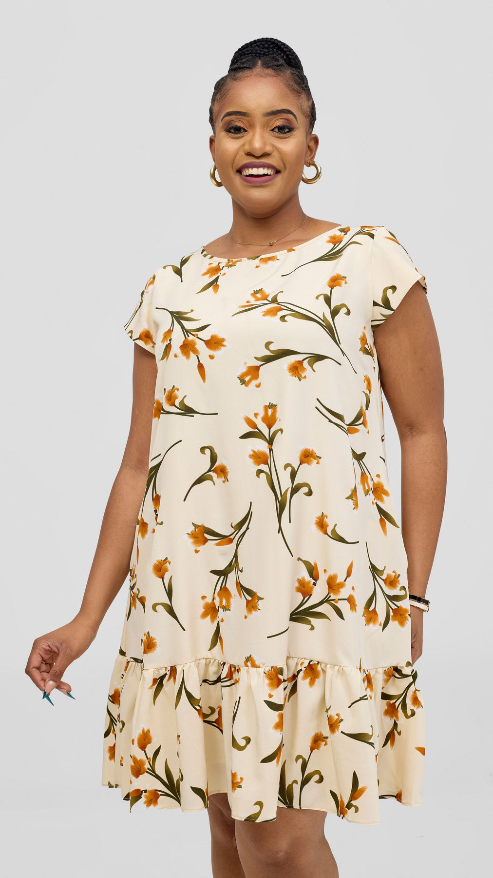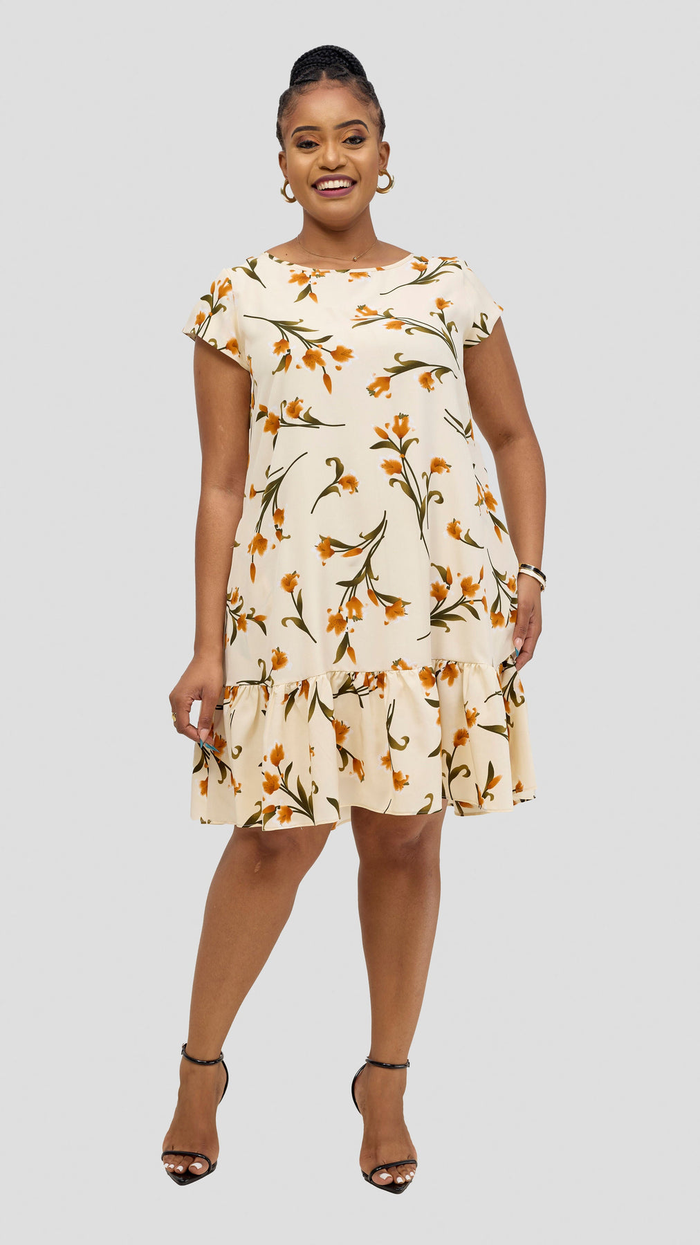 This Vivo Dalia dress features cap sleeves and a gathered waist for a flattering fit. Its knee-length design combines elegance and comfort, while the cream base with peach print adds a soft, feminine touch. Ideal for both casual outings and special occasions, this dress supports your style with ease and grace.